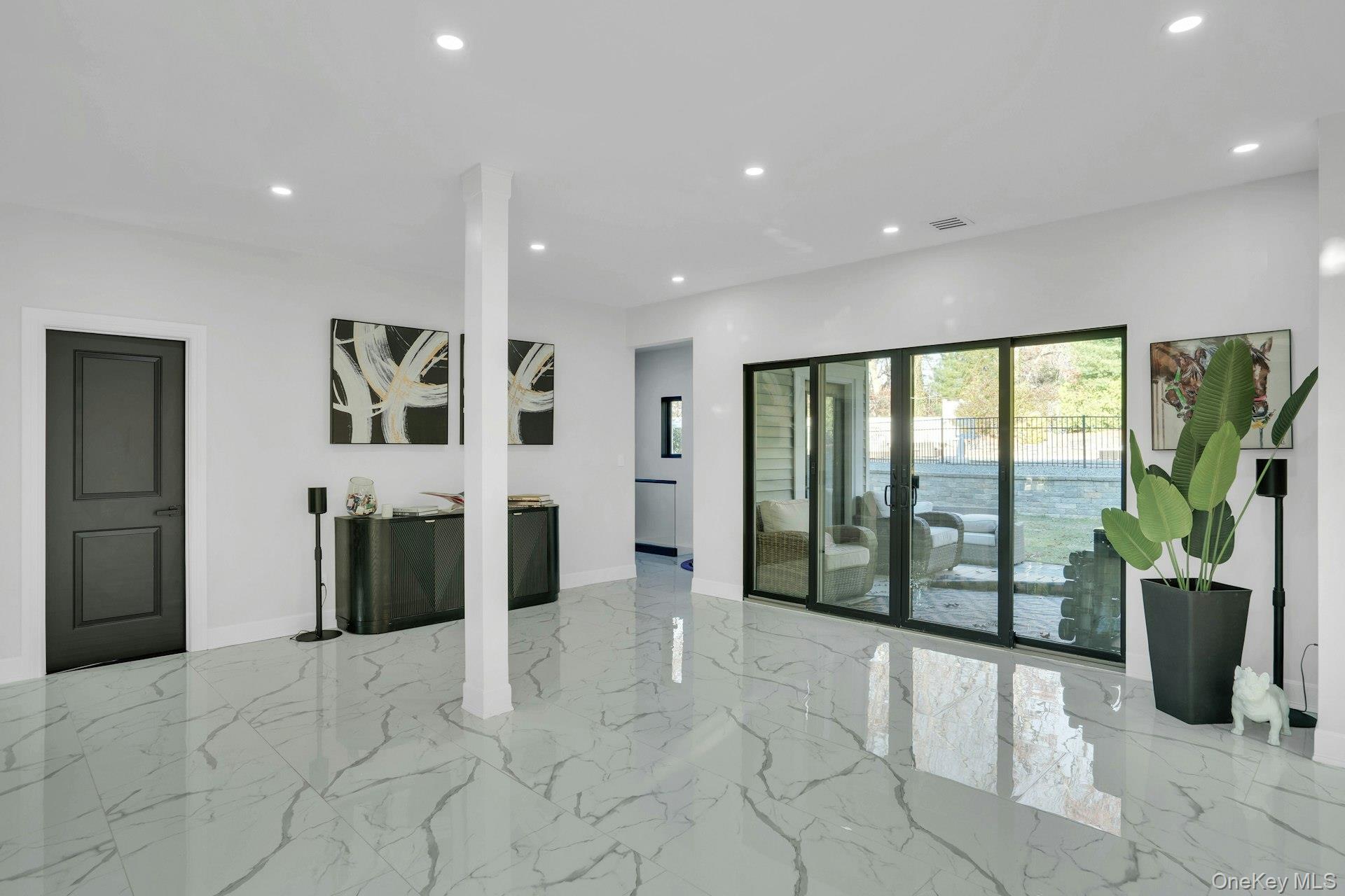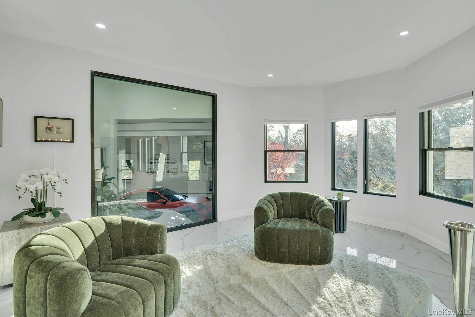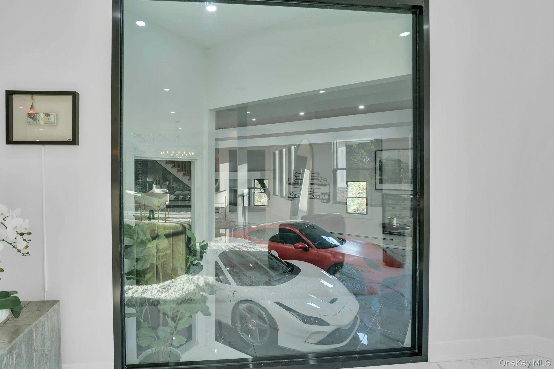 Set on an acre of property, the exterior features a heated saltwater pool, stone patio, dog run, and manicured grounds. The garage is finished with porcelain flooring and interior glass walls designed to showcase vehicles as part of the home's architecture.