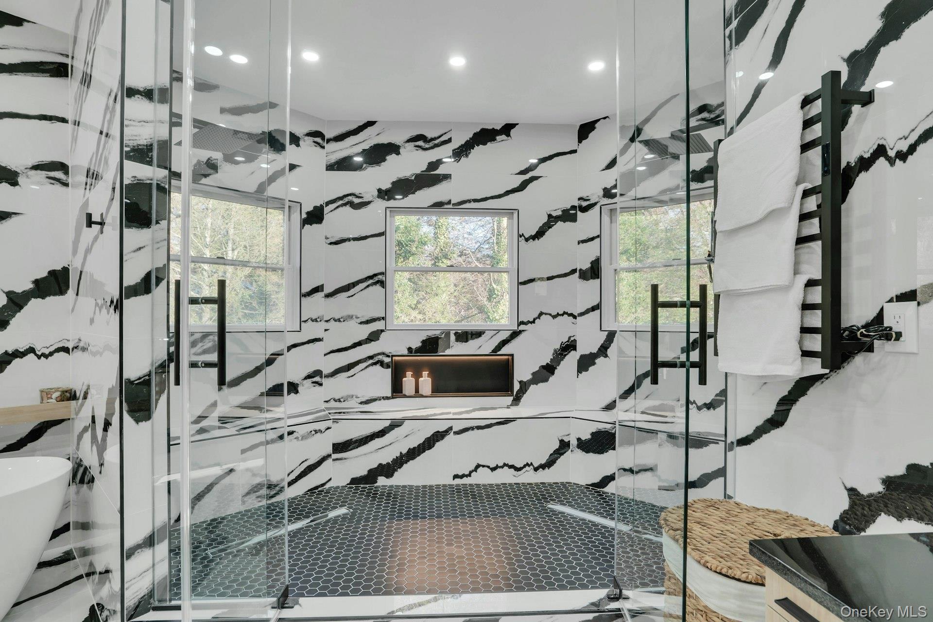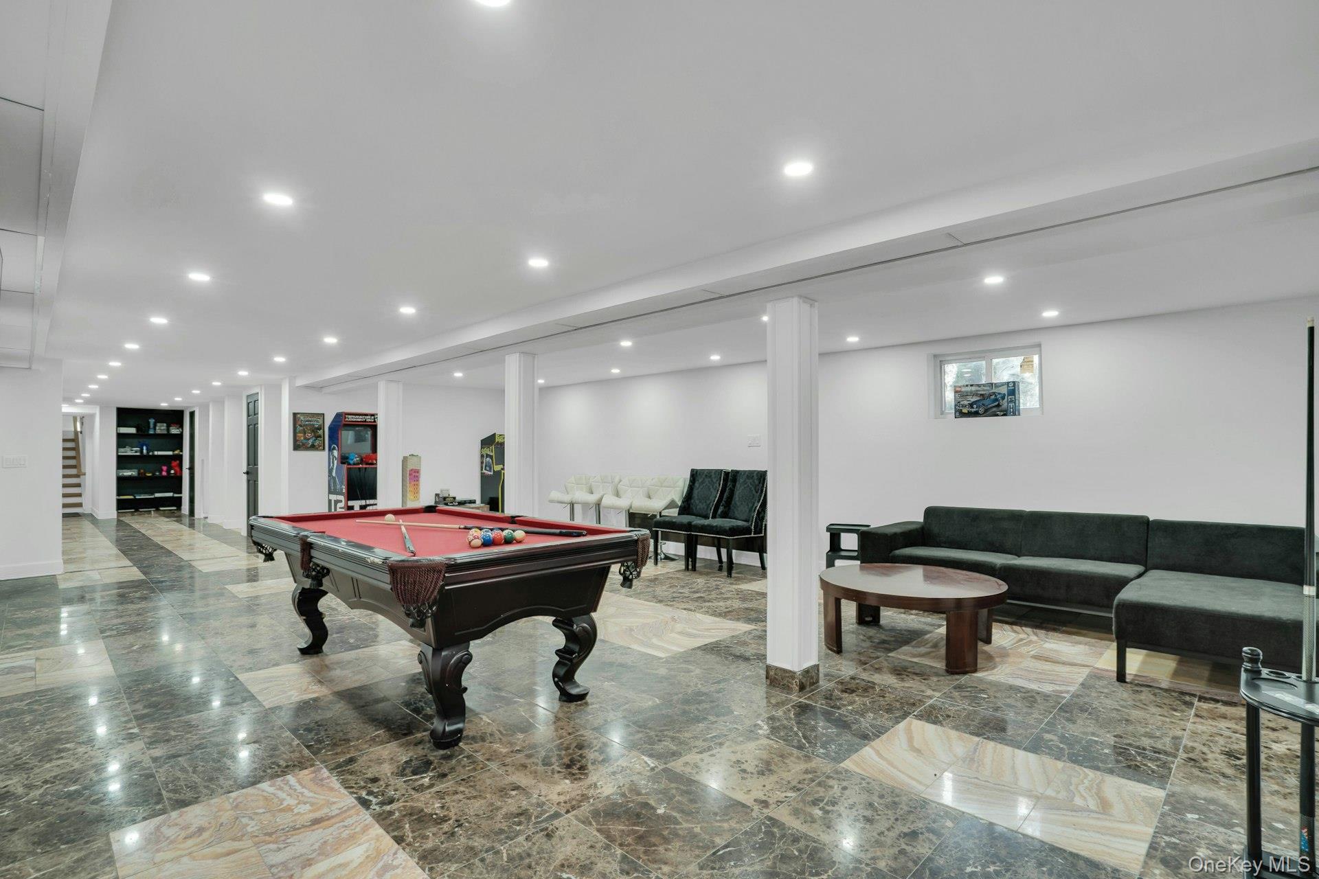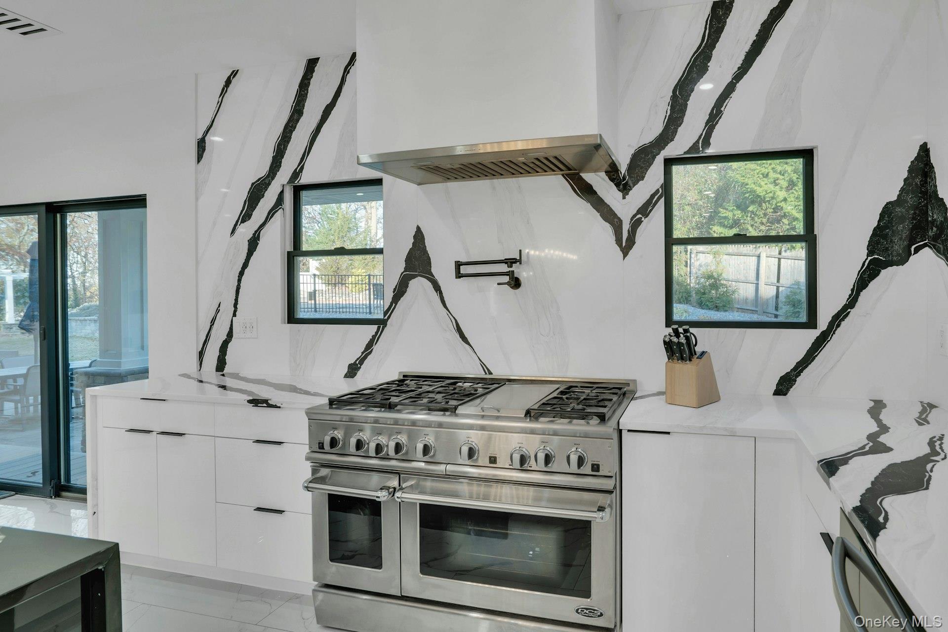 Set on an acre of property, the exterior features a heated saltwater pool, stone patio, dog run, and manicured grounds. The garage is finished with porcelain flooring and interior glass walls designed to showcase vehicles as part of the home's architecture.