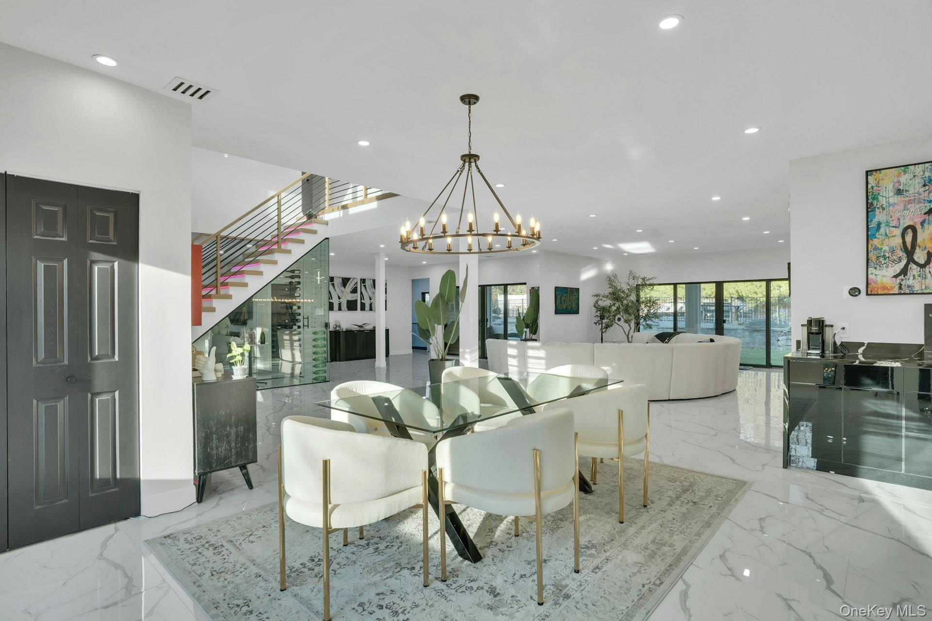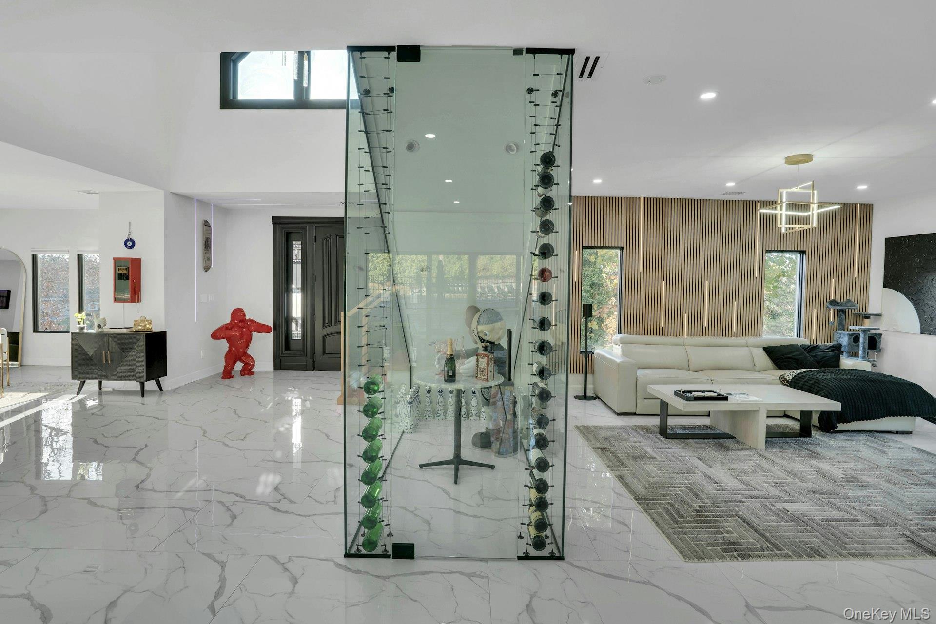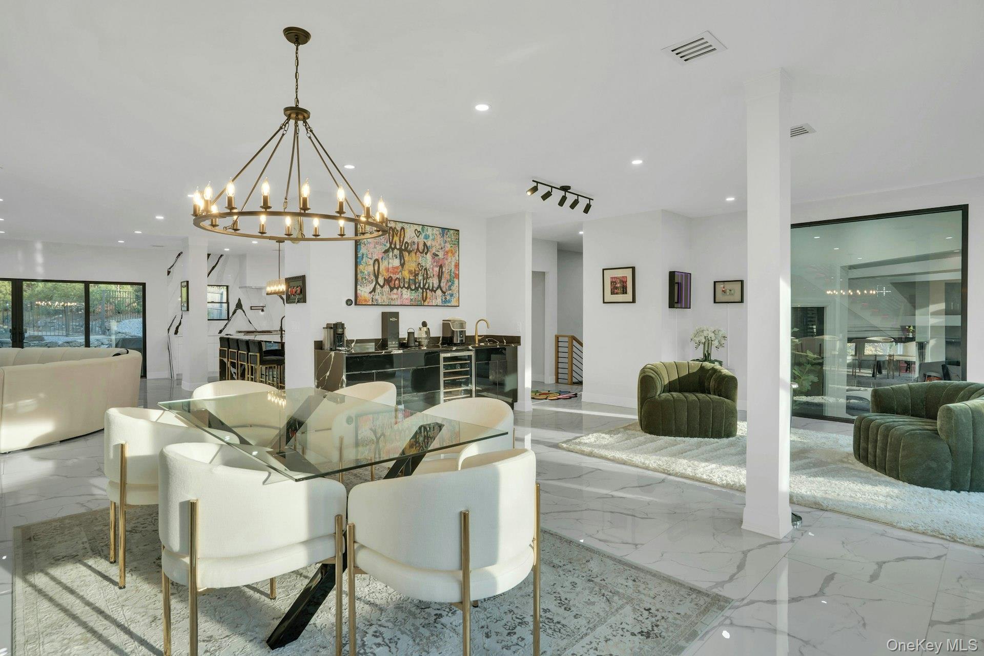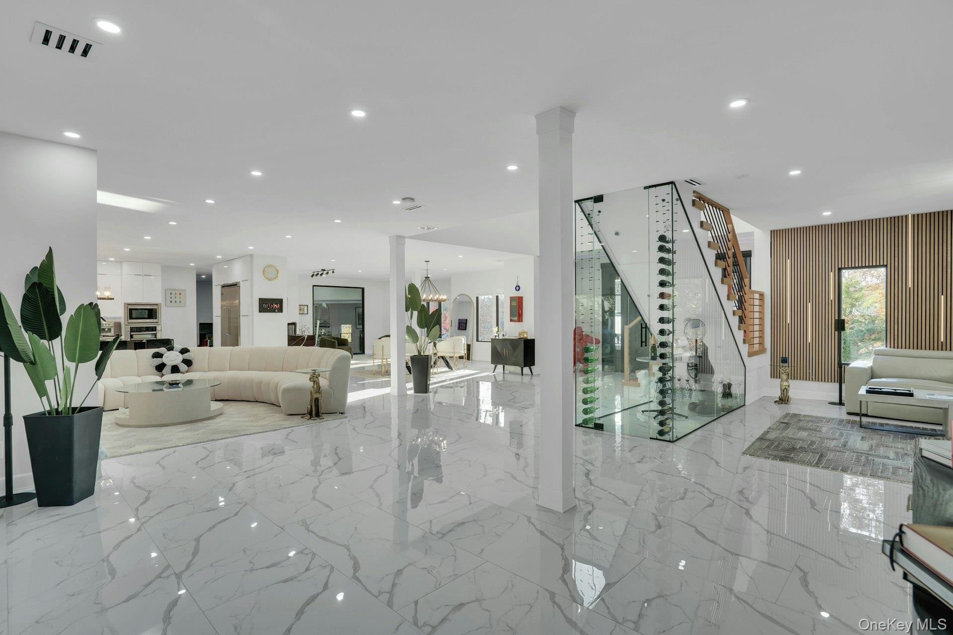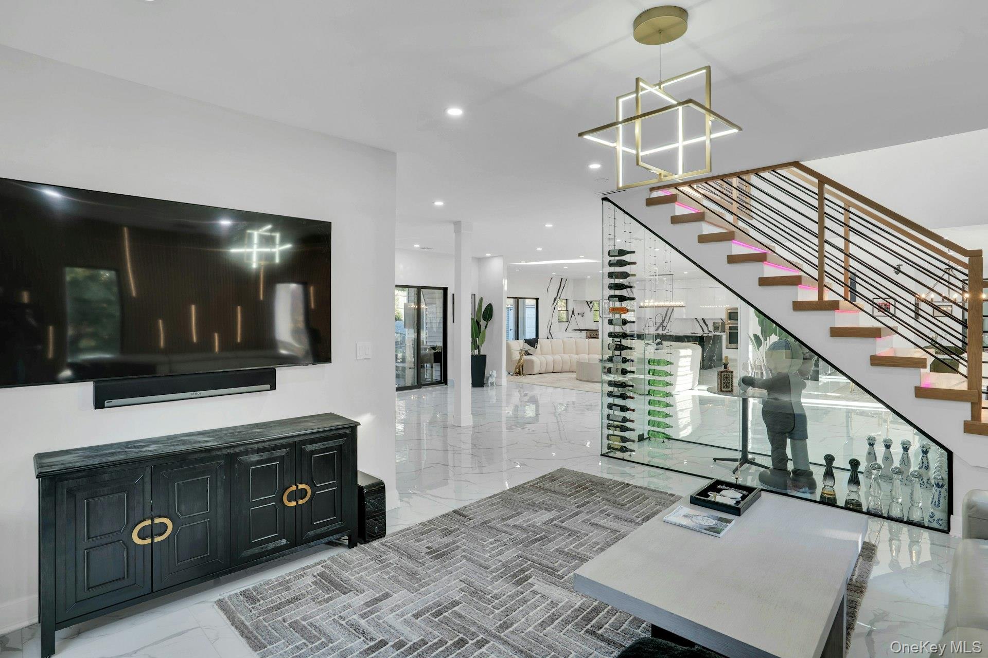 The open-concept main level flows from the formal living and dining rooms into a designer kitchen highlighted by a striking black-and-white marble waterfall island, premium appliances, brass details, and statement lighting. Adjacent to the kitchen is a den wrapped in floor-to-ceiling glass, along with a custom glass-enclosed wine display and a sleek wet bar.