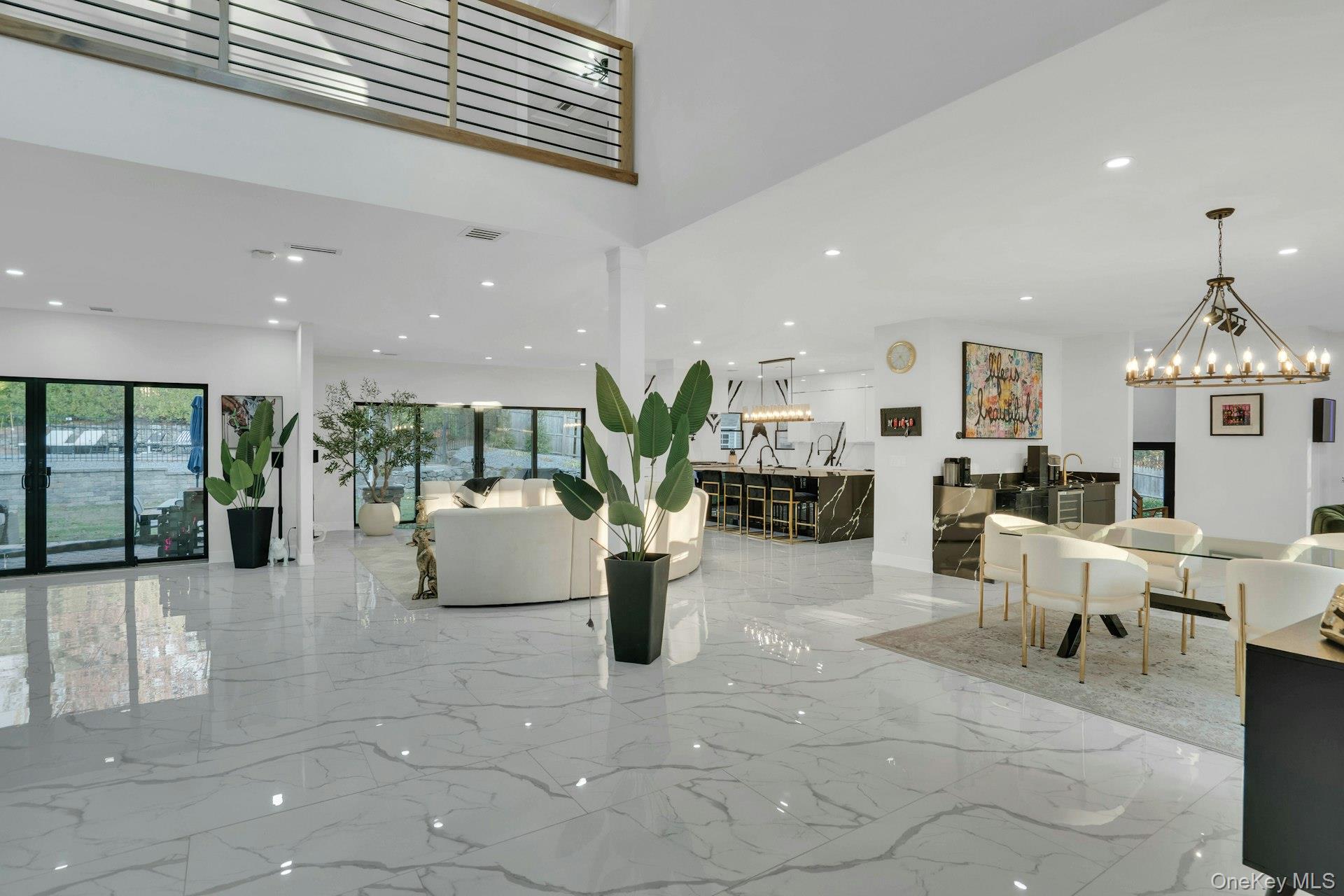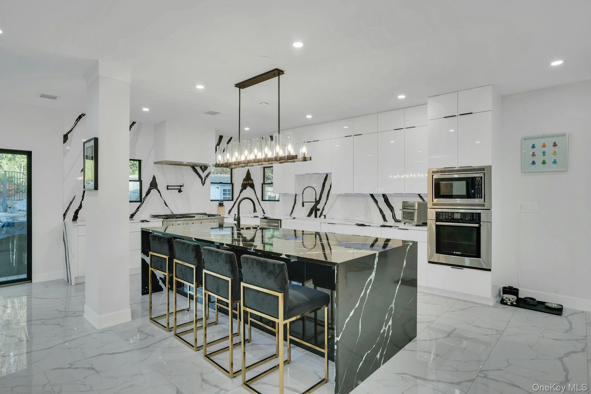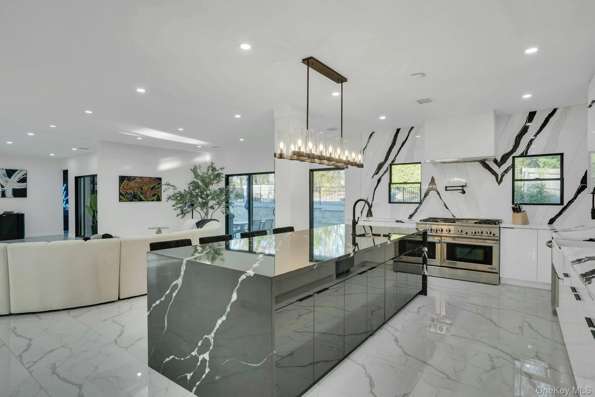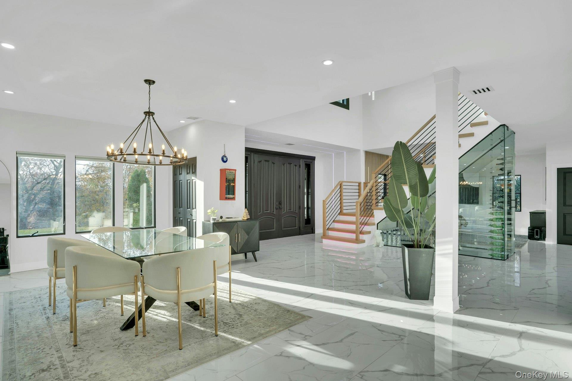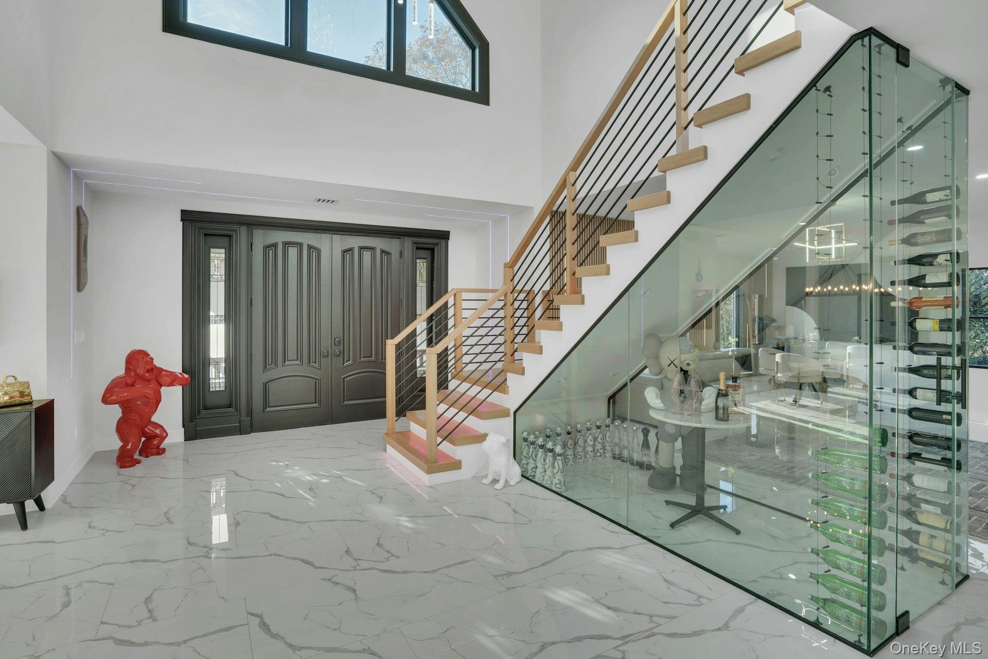 The open-concept main level flows from the formal living and dining rooms into a designer kitchen highlighted by a striking black-and-white marble waterfall island, premium appliances, brass details, and statement lighting. Adjacent to the kitchen is a den wrapped in floor-to-ceiling glass, along with a custom glass-enclosed wine display and a sleek wet bar.