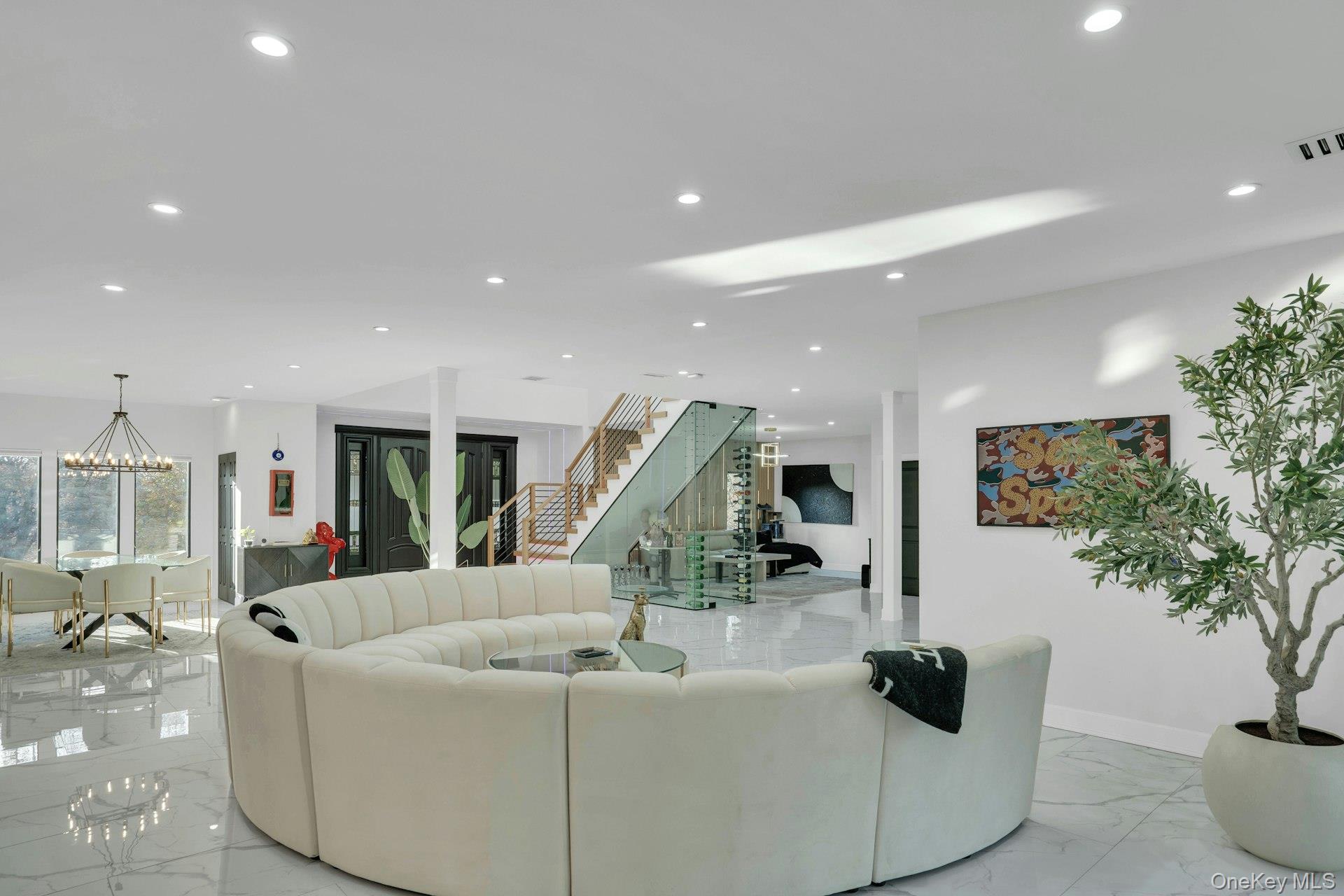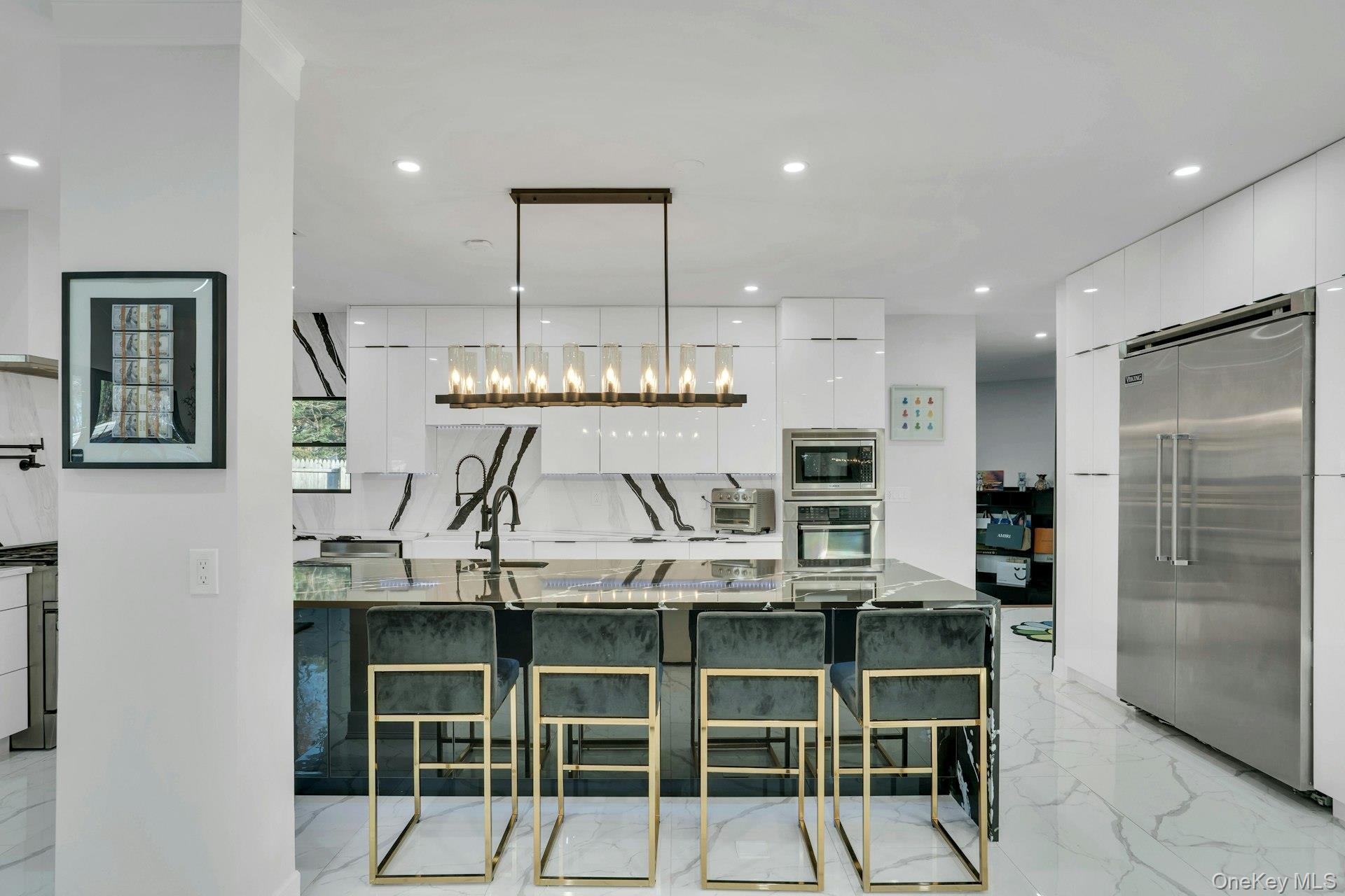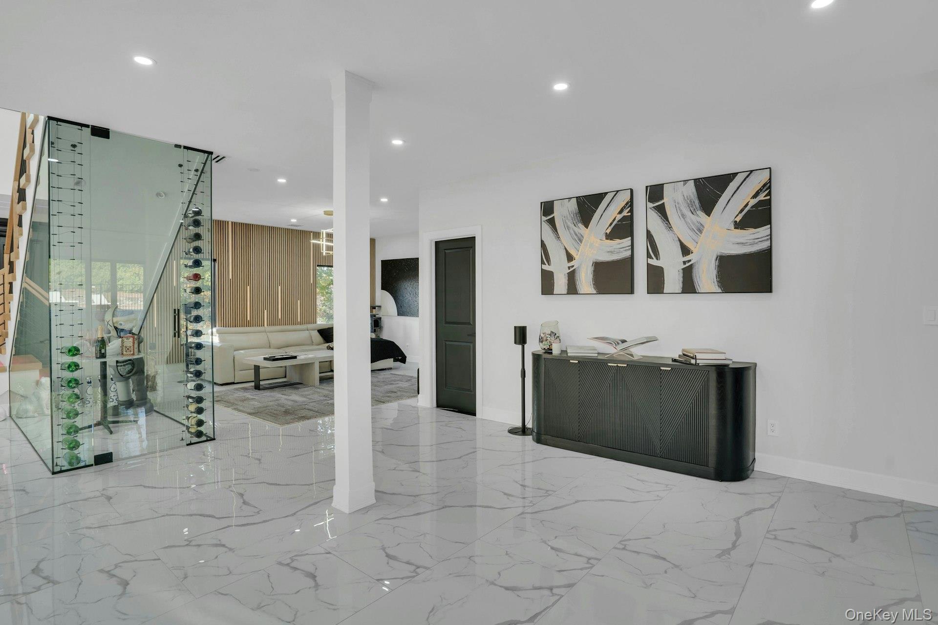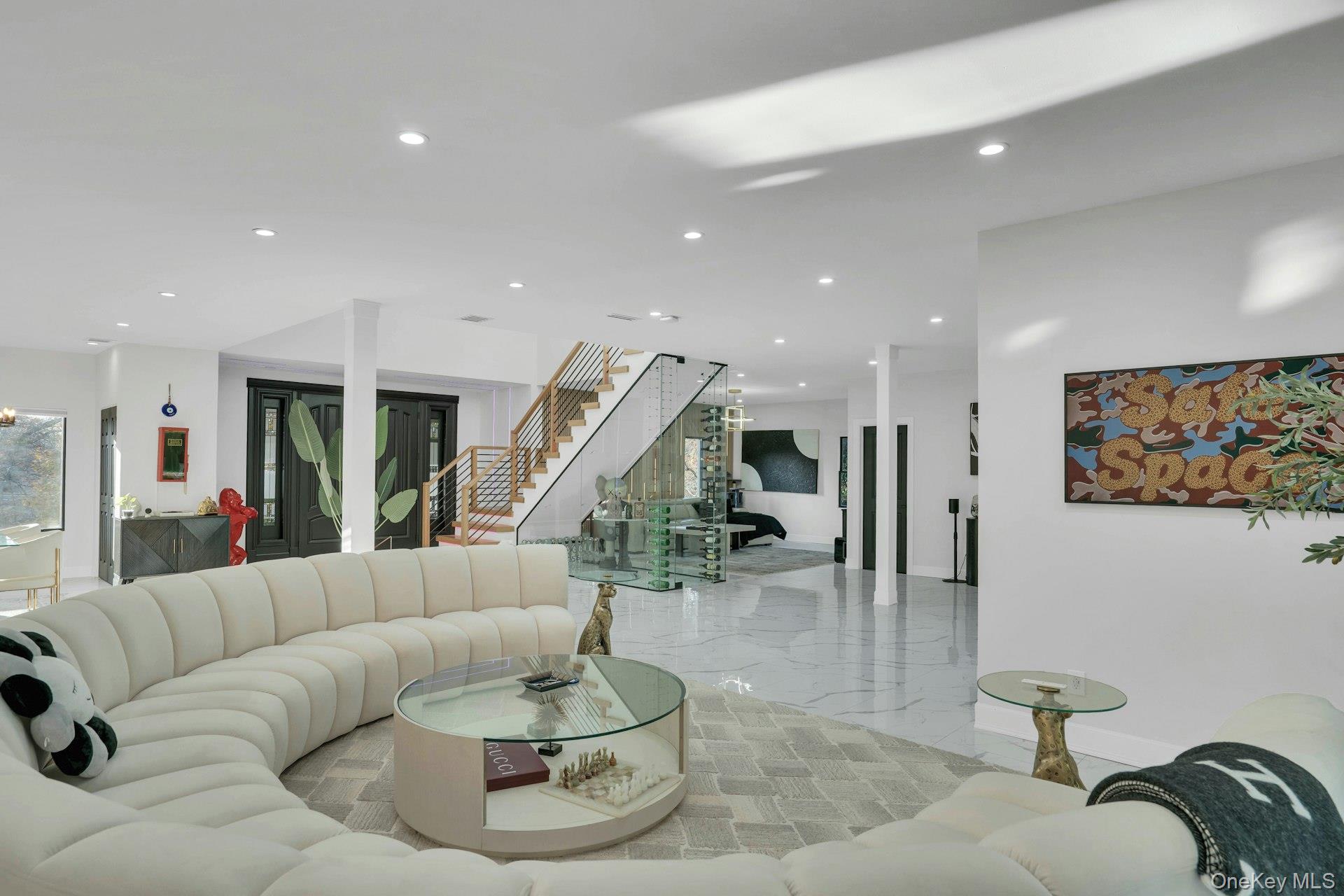 The open-concept main level flows from the formal living and dining rooms into a designer kitchen highlighted by a striking black-and-white marble waterfall island, premium appliances, brass details, and statement lighting. Adjacent to the kitchen is a den wrapped in floor-to-ceiling glass, along with a custom glass-enclosed wine display and a sleek wet bar.