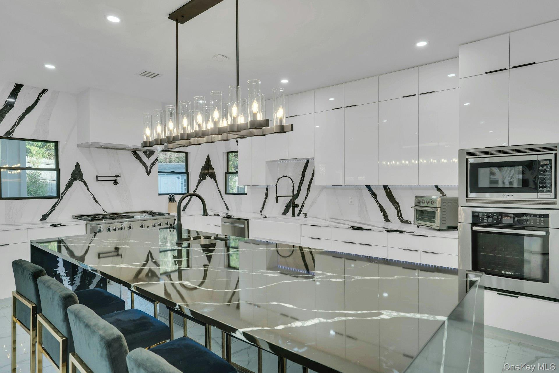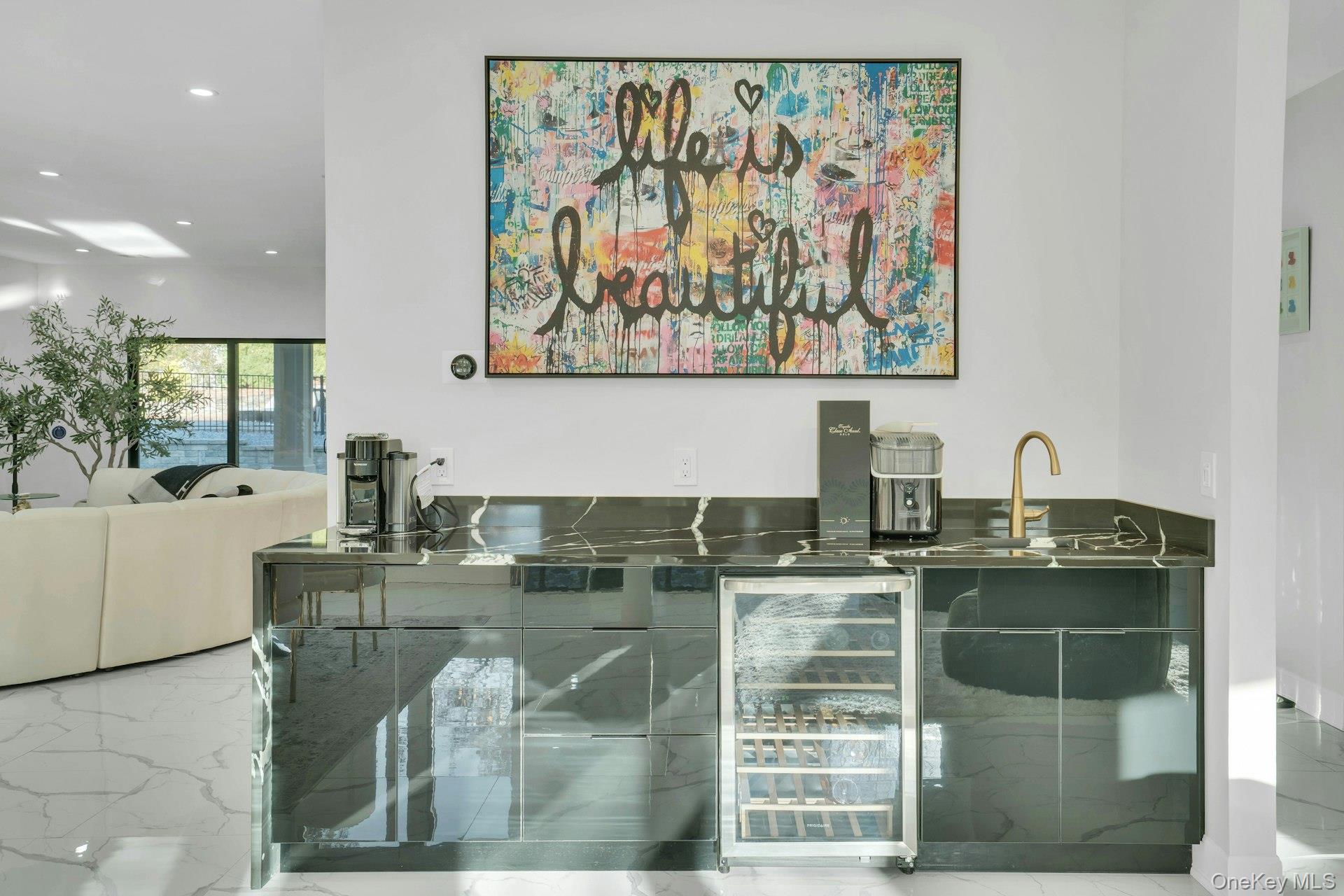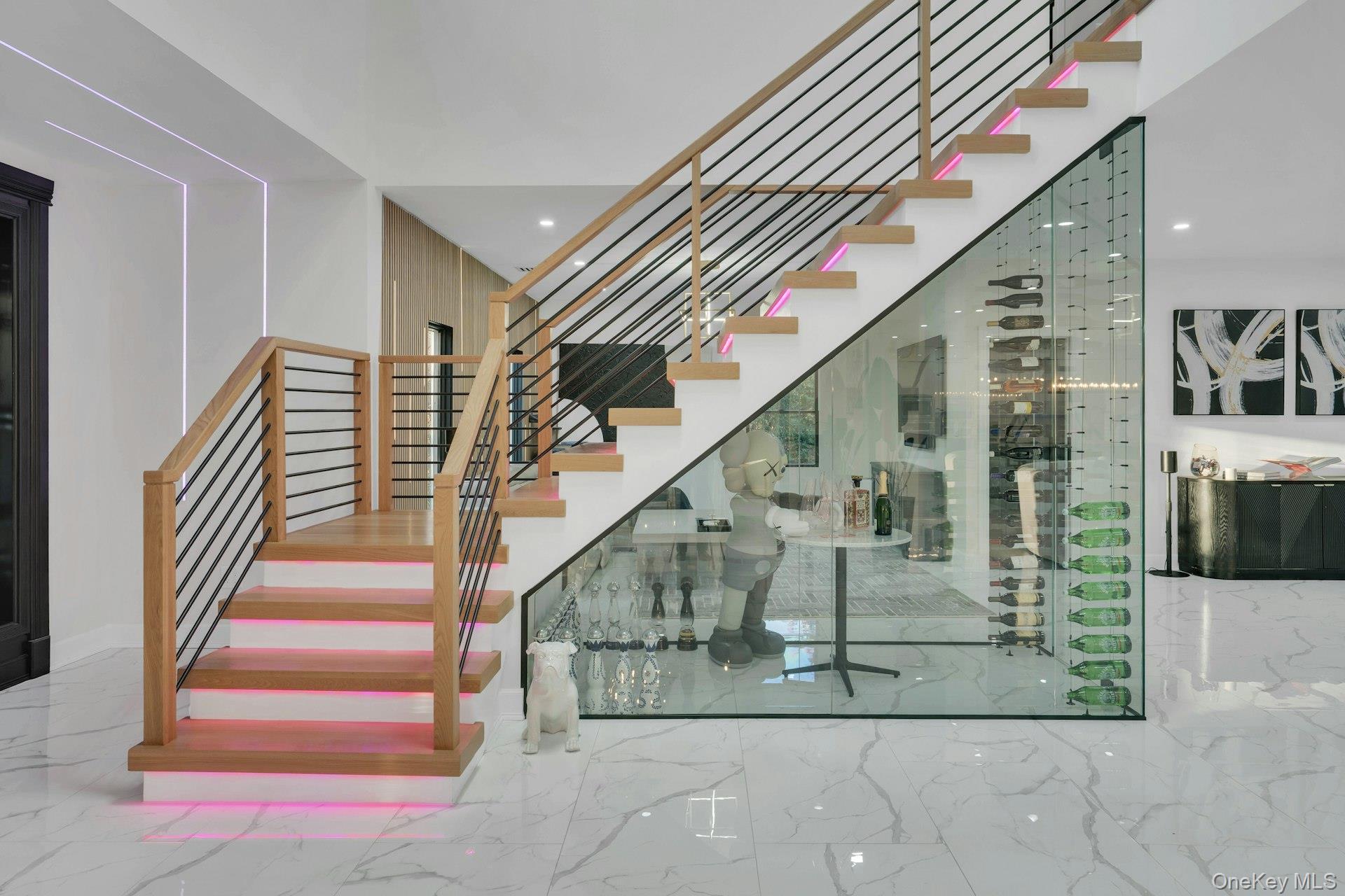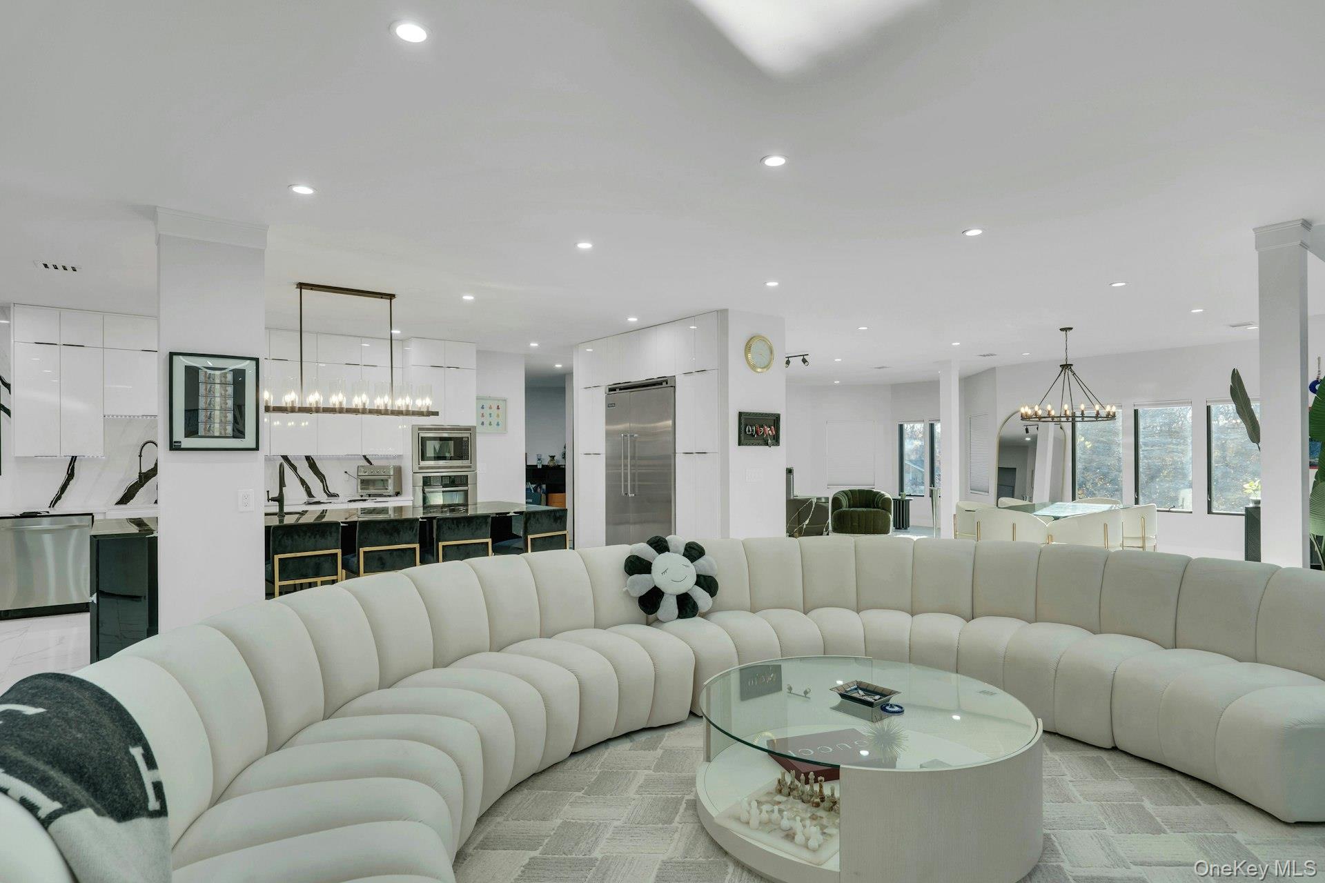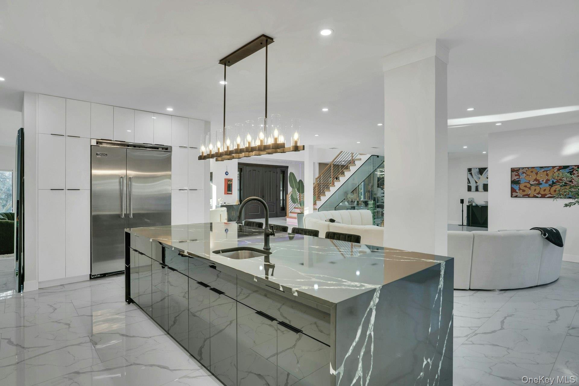 The open-concept main level flows from the formal living and dining rooms into a designer kitchen highlighted by a striking black-and-white marble waterfall island, premium appliances, brass details, and statement lighting. Adjacent to the kitchen is a den wrapped in floor-to-ceiling glass, along with a custom glass-enclosed wine display and a sleek wet bar.