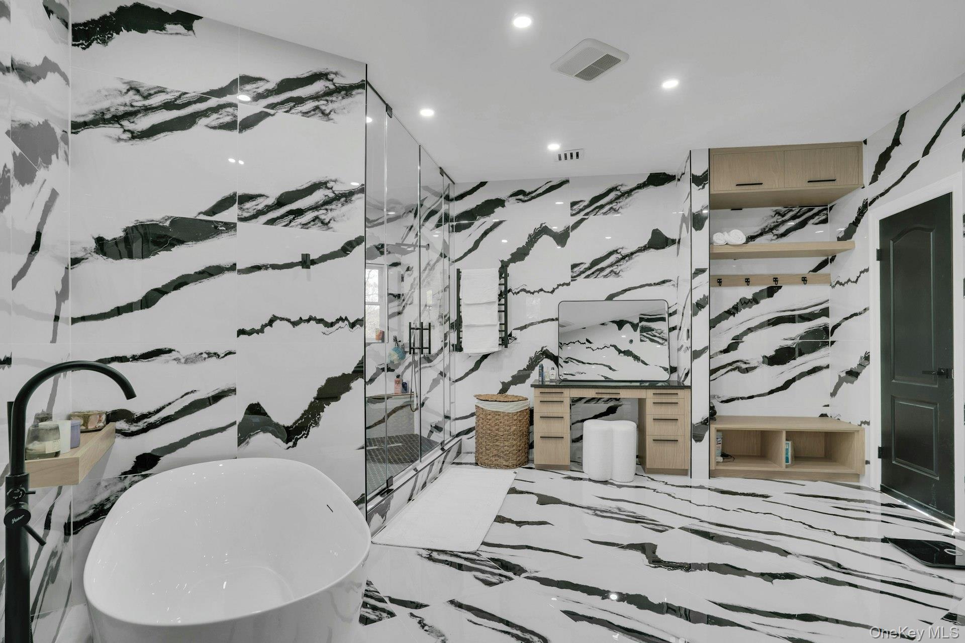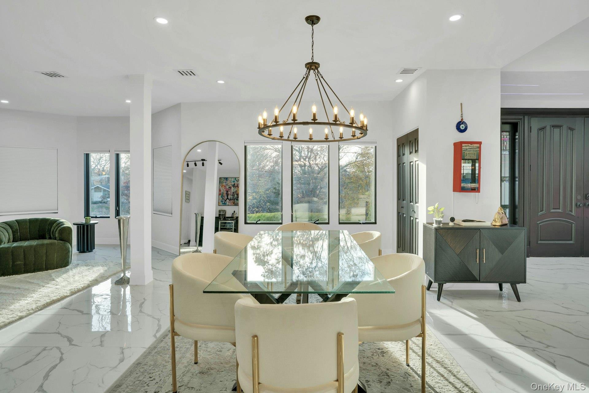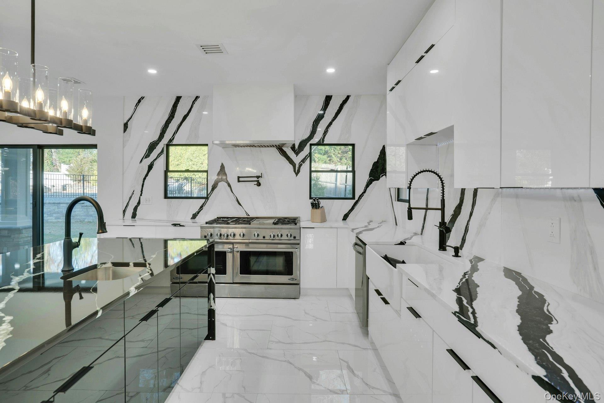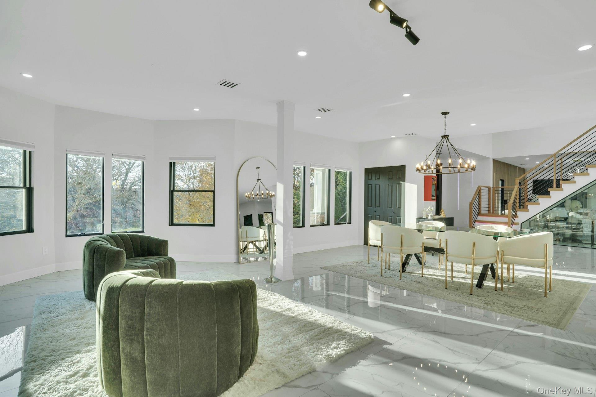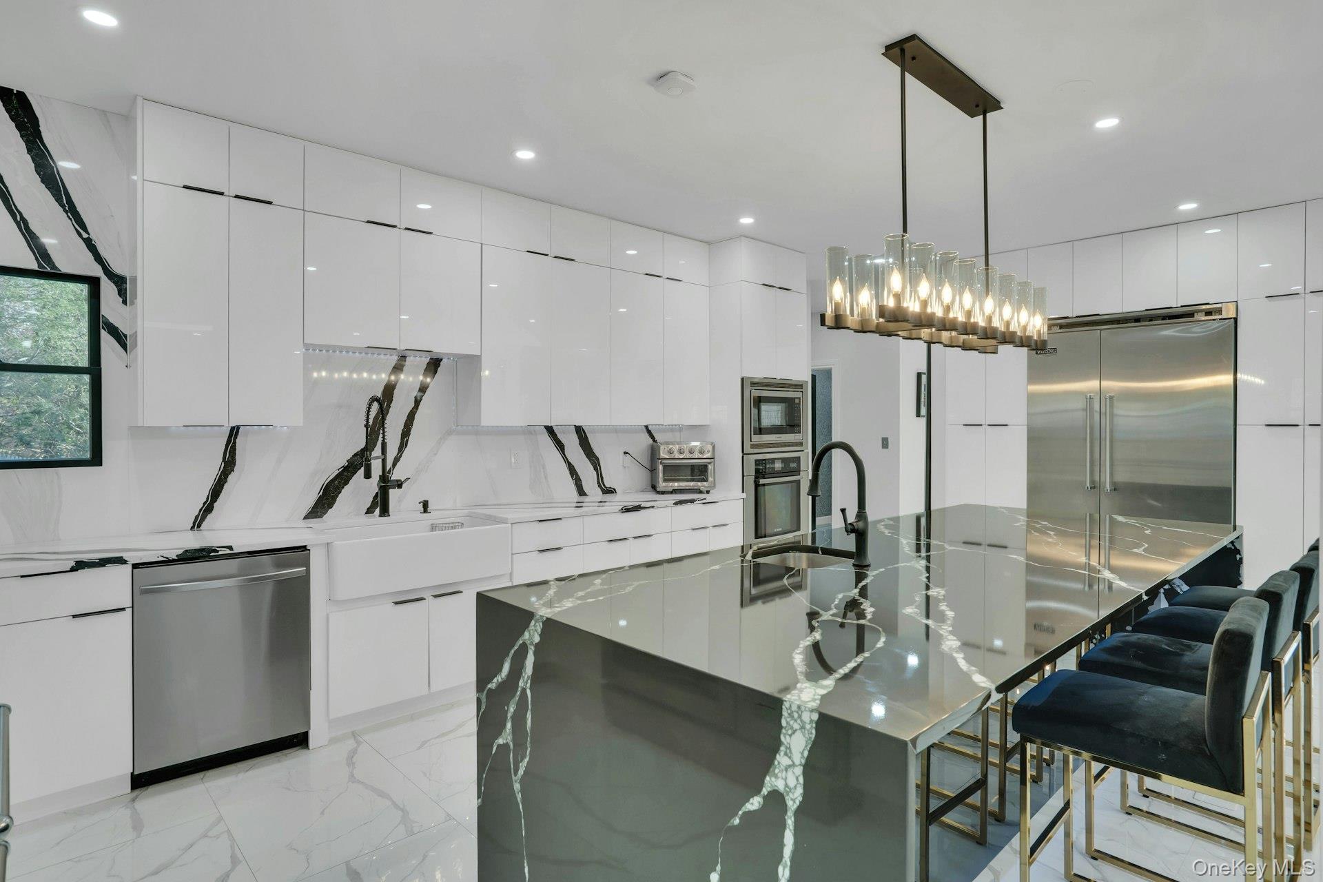 The open-concept main level flows from the formal living and dining rooms into a designer kitchen highlighted by a striking black-and-white marble waterfall island, premium appliances, brass details, and statement lighting. Adjacent to the kitchen is a den wrapped in floor-to-ceiling glass, along with a custom glass-enclosed wine display and a sleek wet bar.