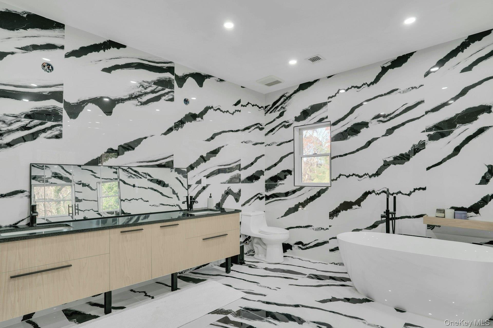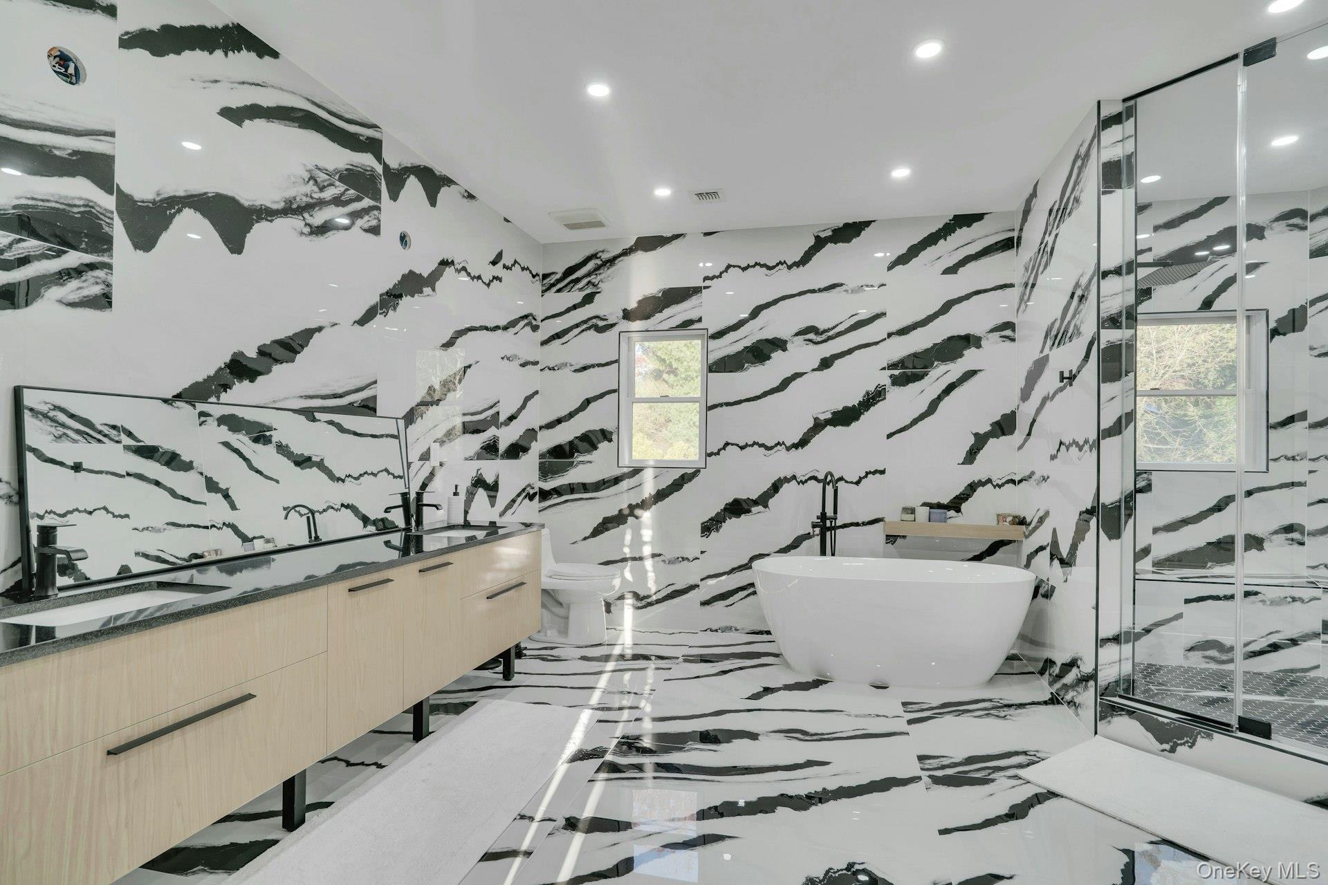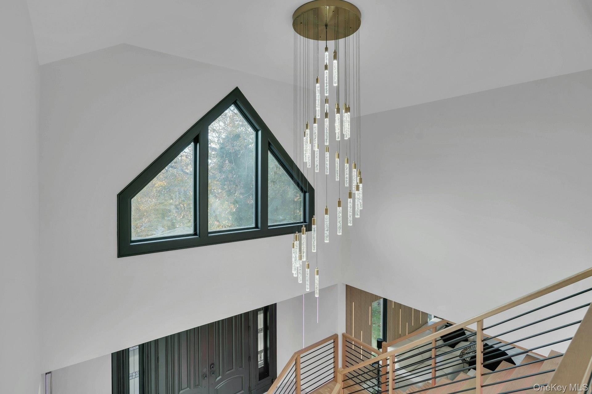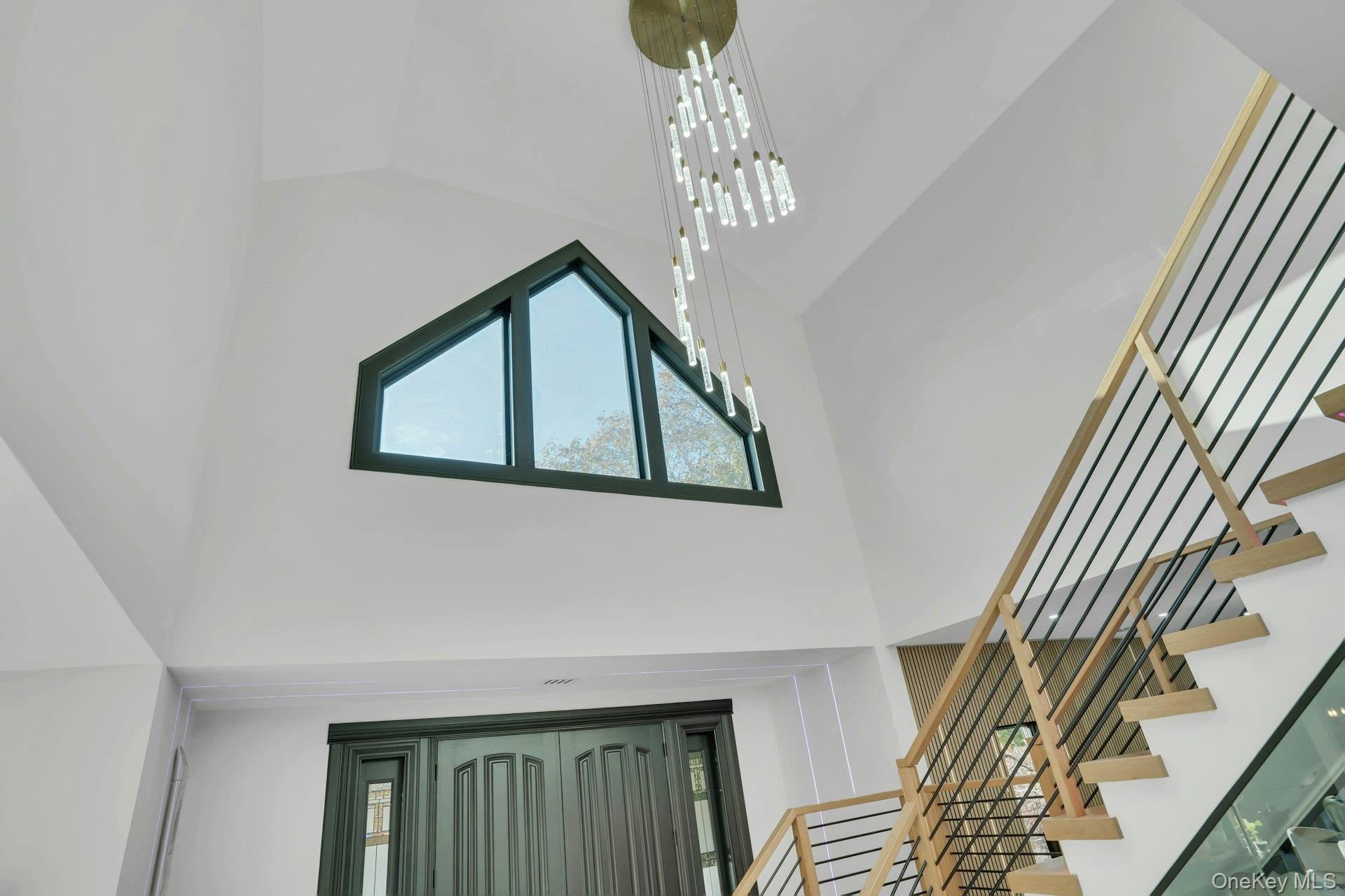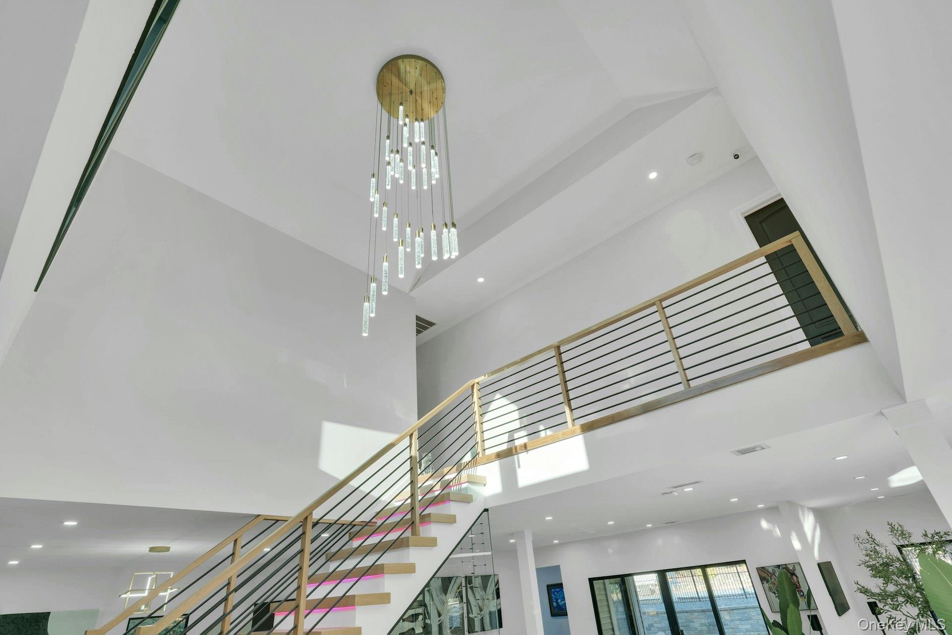Perched high atop a private drive with a cascading waterfall and exceptional elevation, this modern residence blends refined design with thoughtful functionality. A grand double-door entry opens into a two-story foyer featuring Italian porcelain floors and a floating bridal staircase accented by LED lighting.