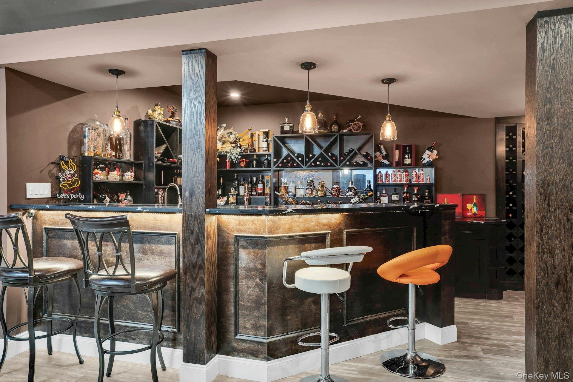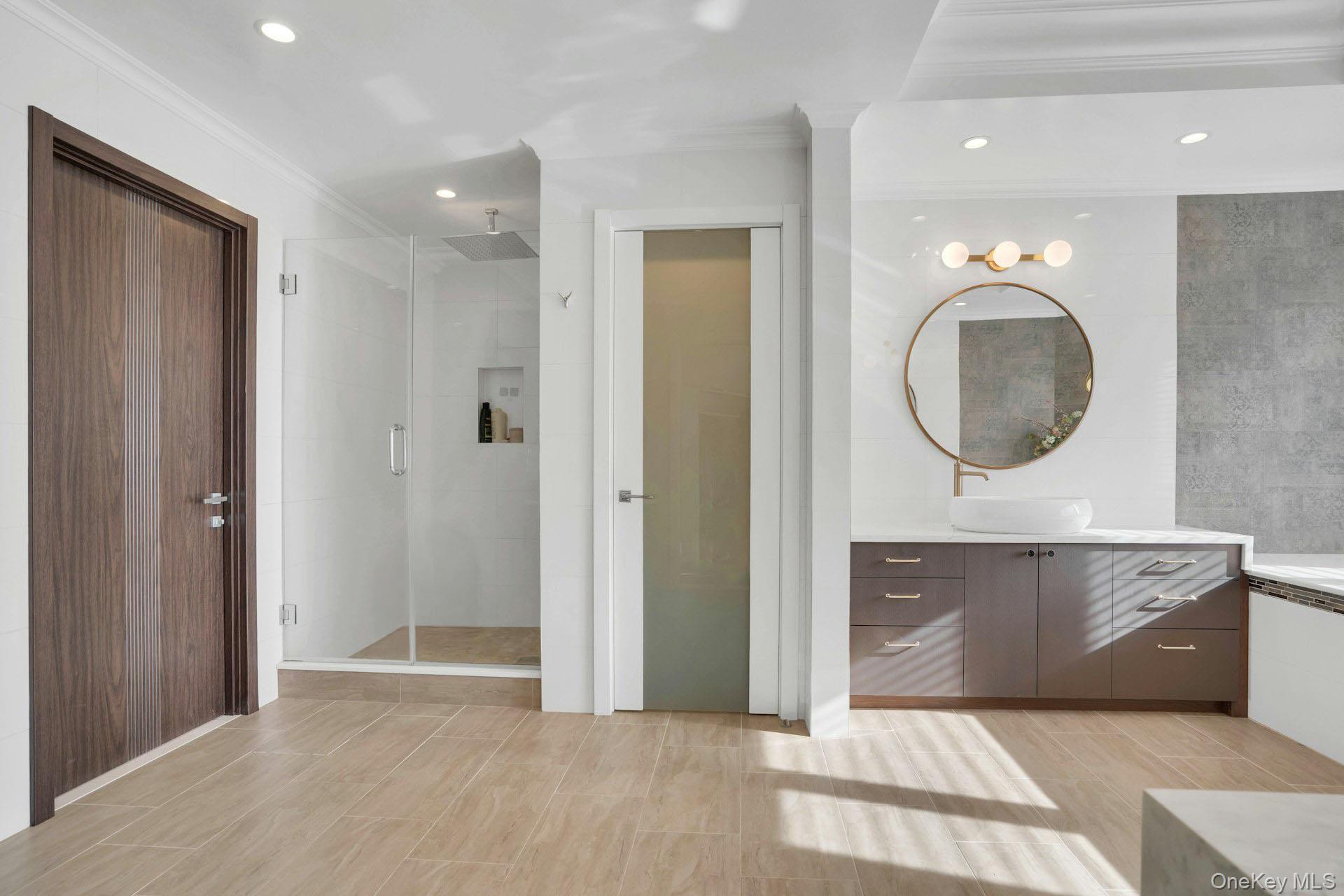 Upstairs, the primary suite offers a spa-like retreat with a designer bath, jacuzzi, double vanities, and custom walk-in dressing room with skylights. Three additional bedrooms each include ensuite bathrooms. The finished basement features a custom wet bar, sauna, home theater, and abundant storage space.