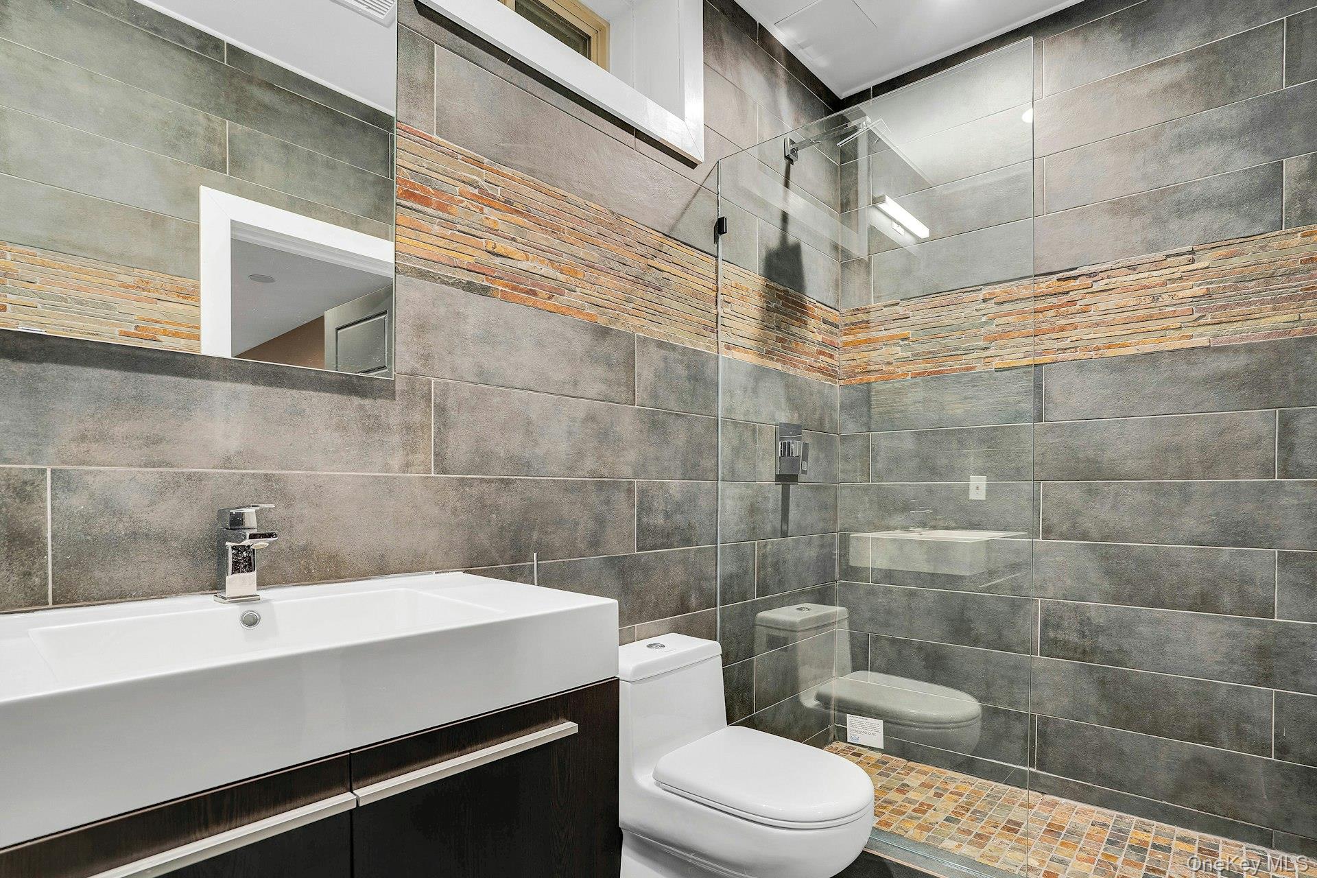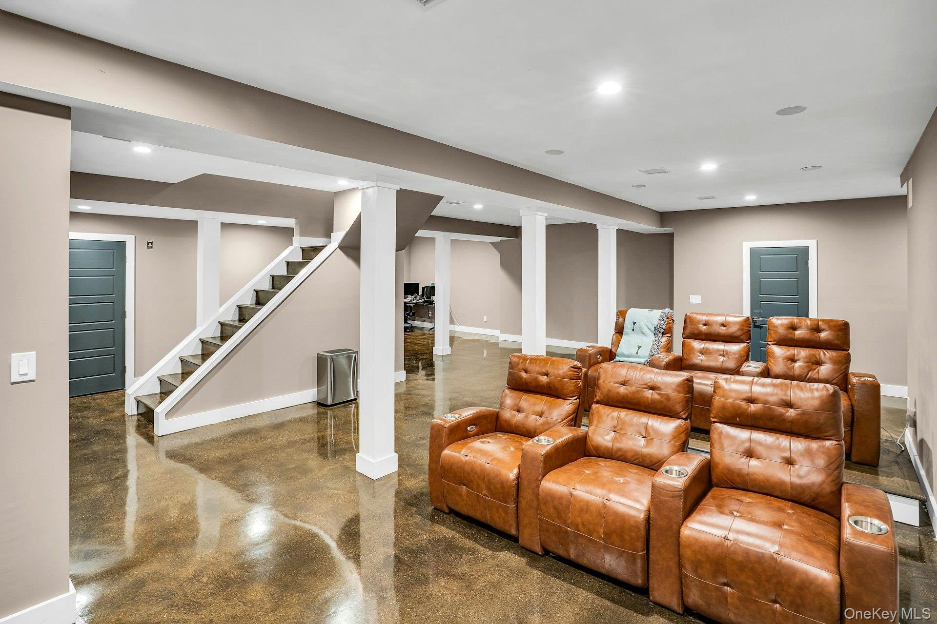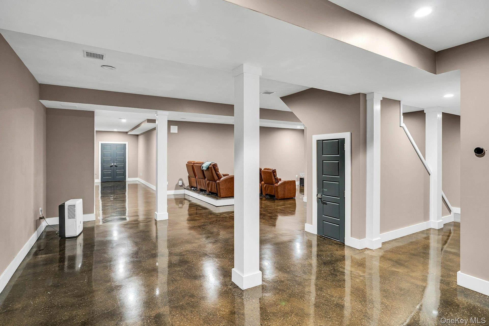 The basement is finished with high ceilings and a designer concrete floor. Theater area, storage, utilities and outside entrance.