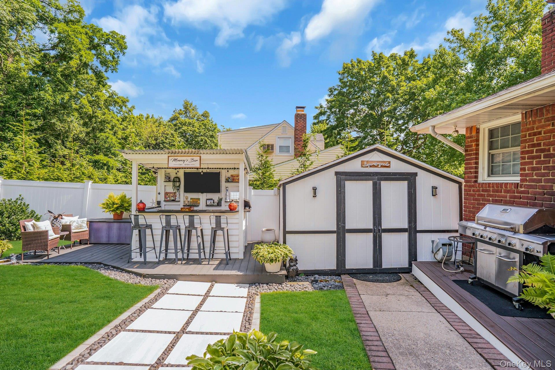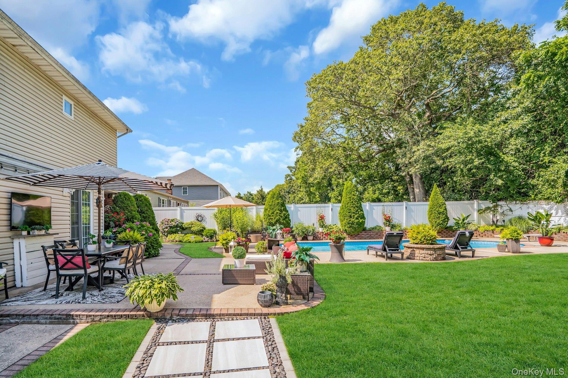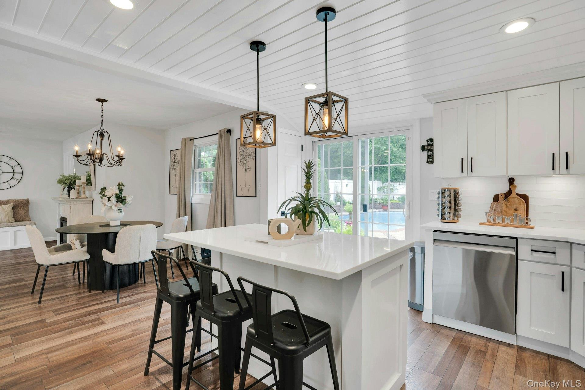 Curb Appeal! This house won't last. Beautifully renovated, roomy, open concept, 2280 sq. ft. colonial offers great entertainment space. Enter the home from the covered porch into the big, bright family room and over-sized dining room. Both rooms have nice chandeliers and lots of natural light form the double hung windows. The kitchen is in the back of the house overlooking the pool. The kitchen was updated 2 years ago and features white cabinets and stainless appliances. There is a small island with seating and a kitchen table area. For those that need a 1st floor bedroom and bathroom, this house has it! The primary bedroom is so pretty with cathedral ceilings and 2 walk-in-closets. The main bathroom has been updated so pretty. The other two bedrooms are also nice and one of them also has high ceilings and a big picture window. The basement is a nice size with a small den area and 3 separate rooms for activities. There is also a storage and utility room. The backyard has a patio, a shed and a really cute cabana. The salt-water pool features a diving board and the vinyl is only 4 years old and the filter and pump are 5 years old. Samsung dishwasher 1 year, Samsung refrigerator 1 year, Washer 7 years, Dryer 4 years, CAC 23 years, Air Handler 11 years, Cesspool has replaced plumbing and an additional tank 2008, 275 Gallon oil tank in basement, Generator (separate). Blinds and drapes stay.
