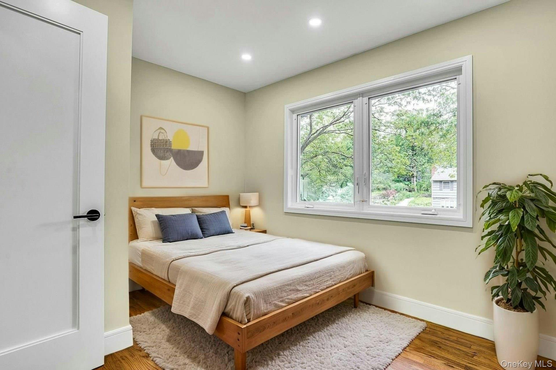 The main floor features rich, dark-stained white oak flooring and an open-concept layout that seamlessly connects the dining room and stunning chef's kitchen--complete with an oversized waterfall island, white oak cabinetry, and stainless steel appliances. The living room is situated at the back of the home with custom built-in shelving and French doors that open to a newly paved patio and a level backyard--perfect for entertaining.