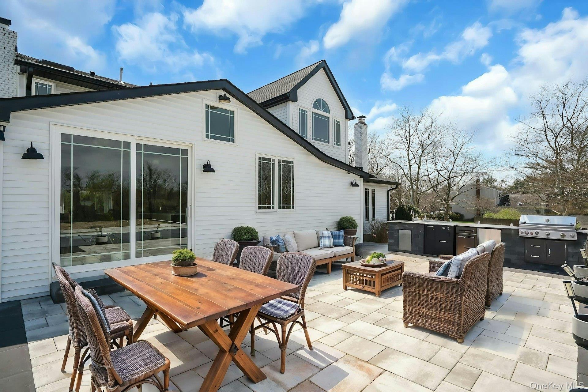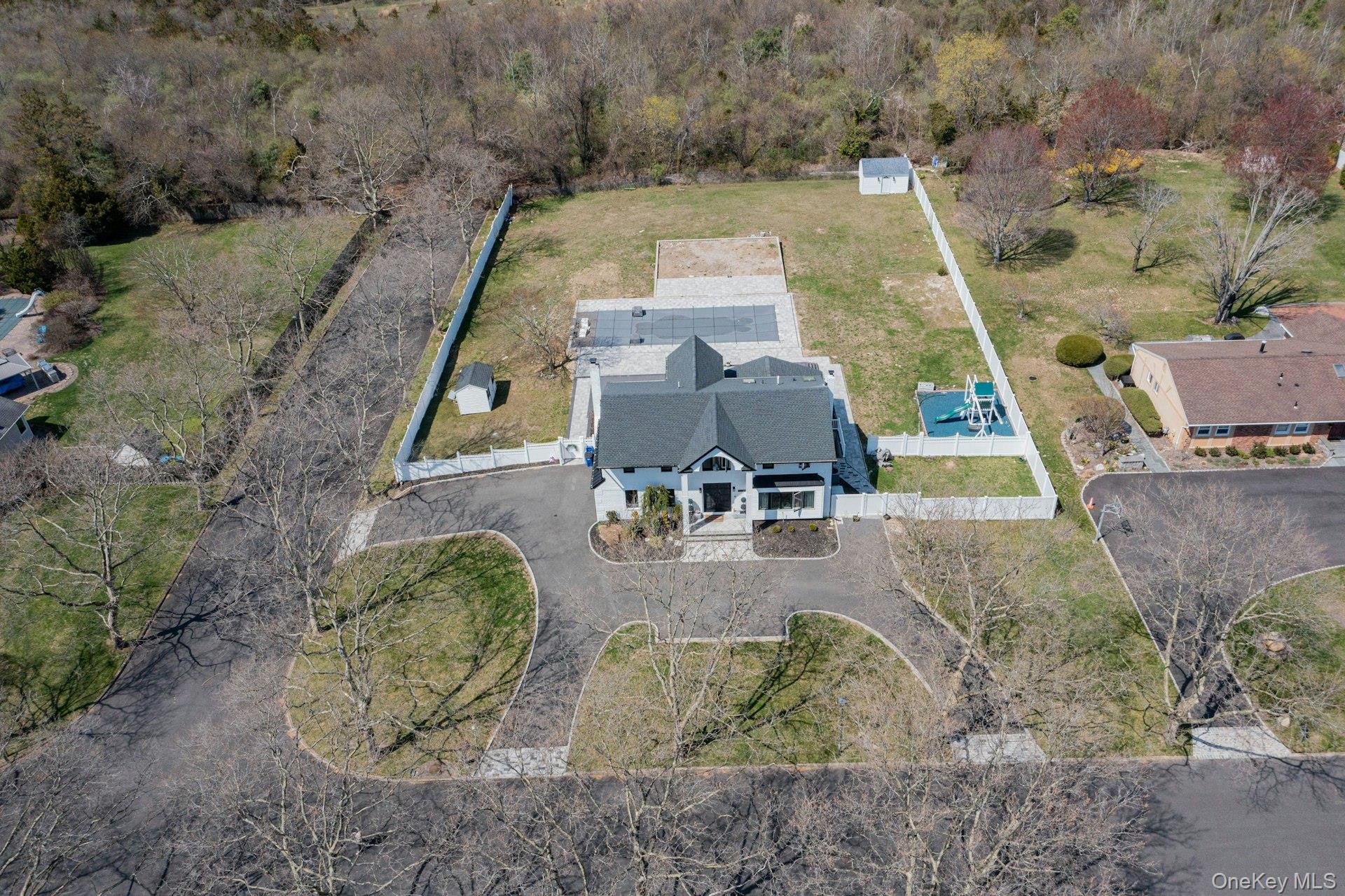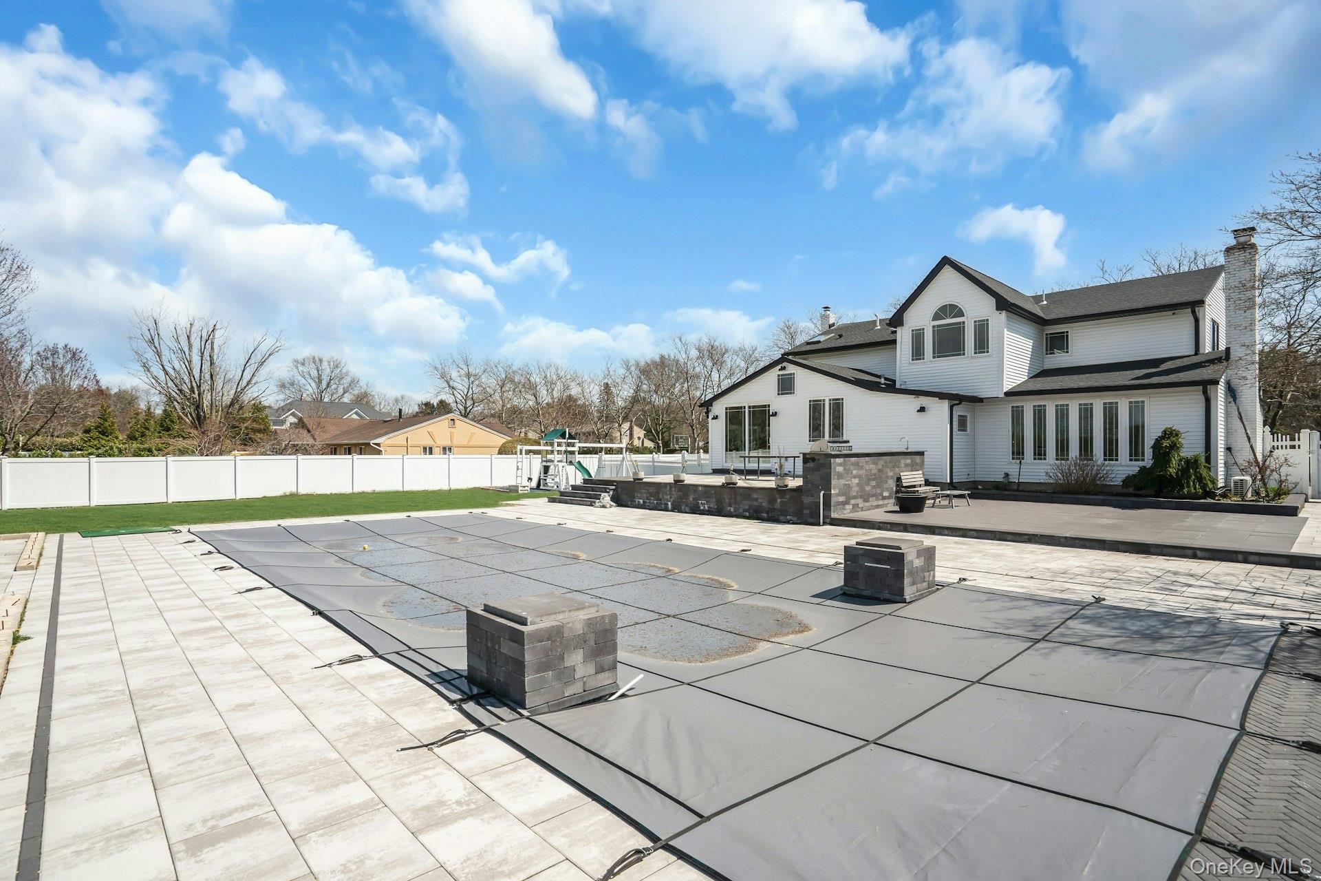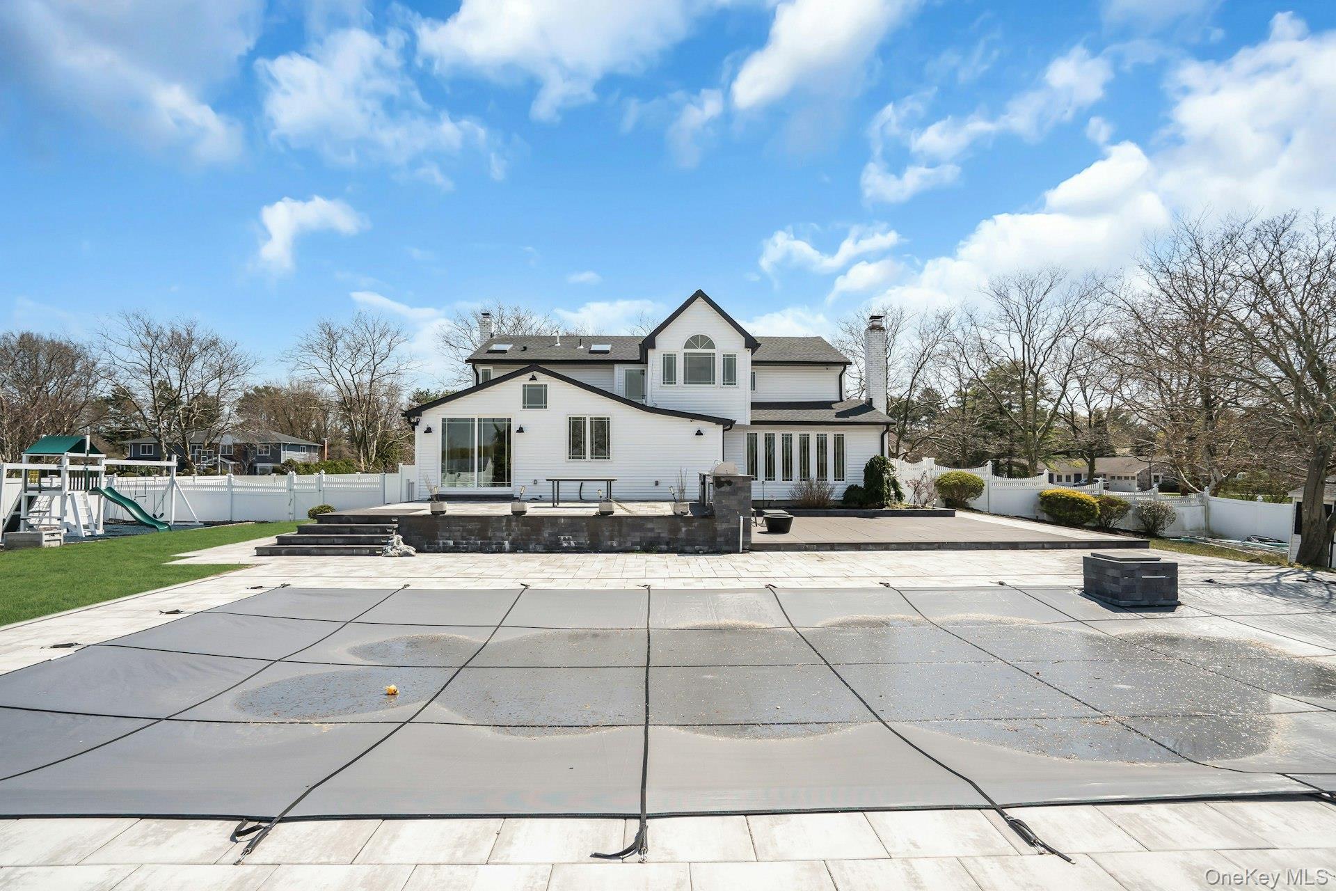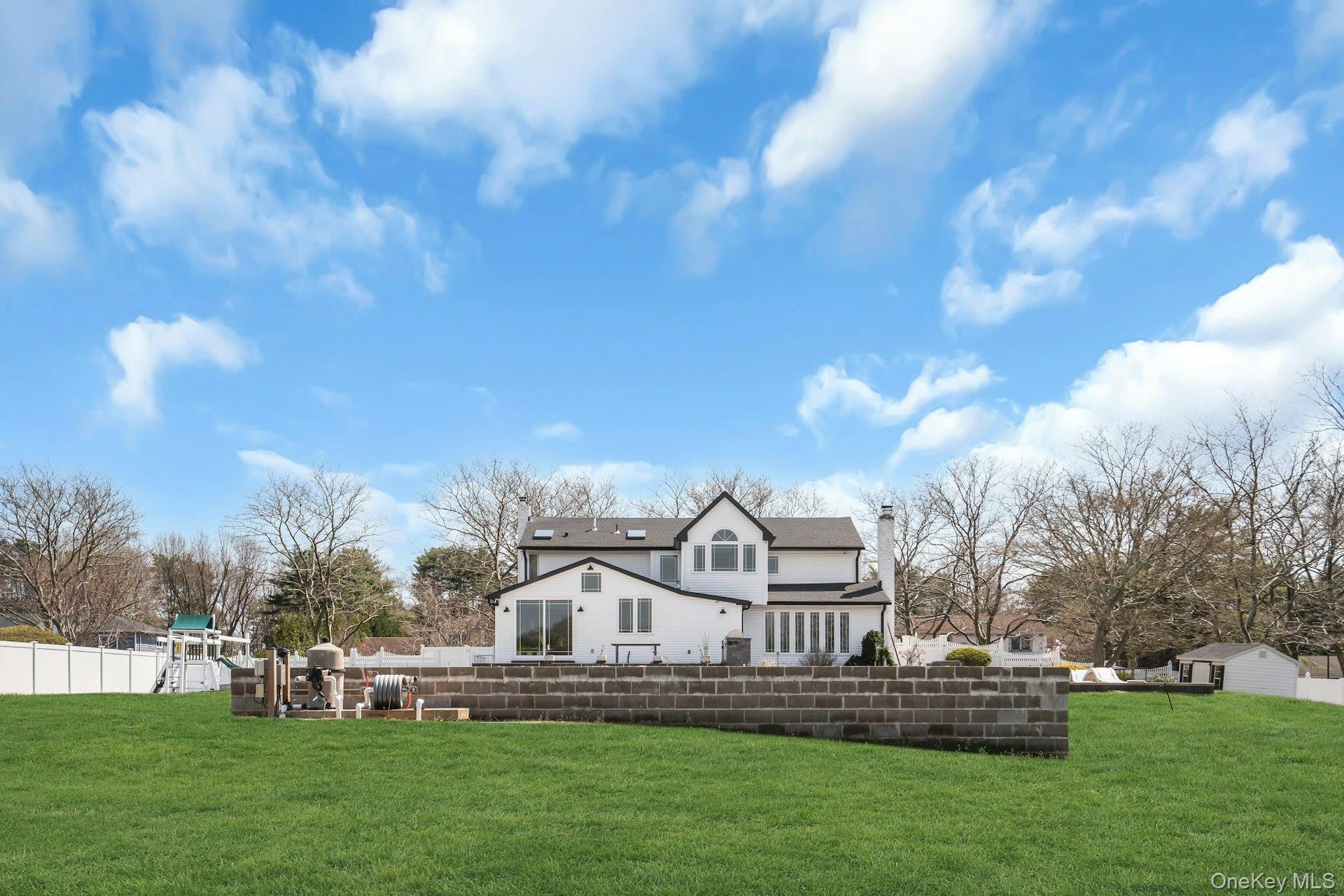 This is the one you have been waiting for! Location, location, fully updated in 2023! This stunning grand colonial with a circular driveway and pillars at the entrance, has a beautiful bluestone porch to greet you. The double entry doors are designer, black steel, show stoppers. Enter the foyer to a beautiful tiled floor with a double coat closet. Then step in to open concept living space that is exactly what you would wish for. The flooring here is Durvana and the entire first floor is radiant heated. The formal living room is drenched with natural light from the bay window. Plenty of space for entertaining. A dining table can be added to this space if needed. Step into the custom kitchen with high ceilings and windows and sliders all around. The cabinets are modern with glass doors, slow close drawers and a center island with a waterfall quartzite counter. All of the counters waterfall in this stunning kitchen! Of course there is a 6 Burner Wolf stove and oven, Sub-Zero Refrigerator, Microwave Drawer and Cove Dishwasher! My favorite room in the house is the PANTRY with a glass barn door! The pantry feautres a coffe bar and shelving, shelving, shelving! Such an Instagram moment! Love it! The family room is tucked away for a bit of privacy when needed. This room features a GAS fireplace and built-ins. It has a wall of the most beautiful Pella casement windows. Ascending the staircase to the 2nd floor, you reach the most inviting study with lovely windows overlooking the yard. You can work in this office all day! It has built-in bookcases and a desk. The stackable washing maching and dryer are also tucked in the corner so you never have to bring your laundry downstairs. Bonus! The primary bedroom feautures high ceilings and 2 large walk-in-closests for the clothes horse! The room also has a private ensuite bathroom with skylight. The other 3 bedrooms are all good sizes and the main bathroom with skylight has been updated too. The full basement is finished and has an outside entrance. The backyard has been professionally designed by the Stasi Brothers. There are multiple patios and an in-ground gunite pool with a vinyl liner all done in 2023. The pool has a sun deck for lounging in the water as well 2 waterfalls. The pool gradually goes to 6 feet and is gas heated and salt-water. There is a fabulous outdoor kitchen for those summer barbecues. There is also a $10,000 Wood Kingdom playground set up and ready to go. Roof 2022. Gas Boiler 2024. Air Conditioner 2025. Cesspool age not verified but it was pumped two years ago and is in good working order. 2 car garage is ready for the fancy car person. 200 Amp.