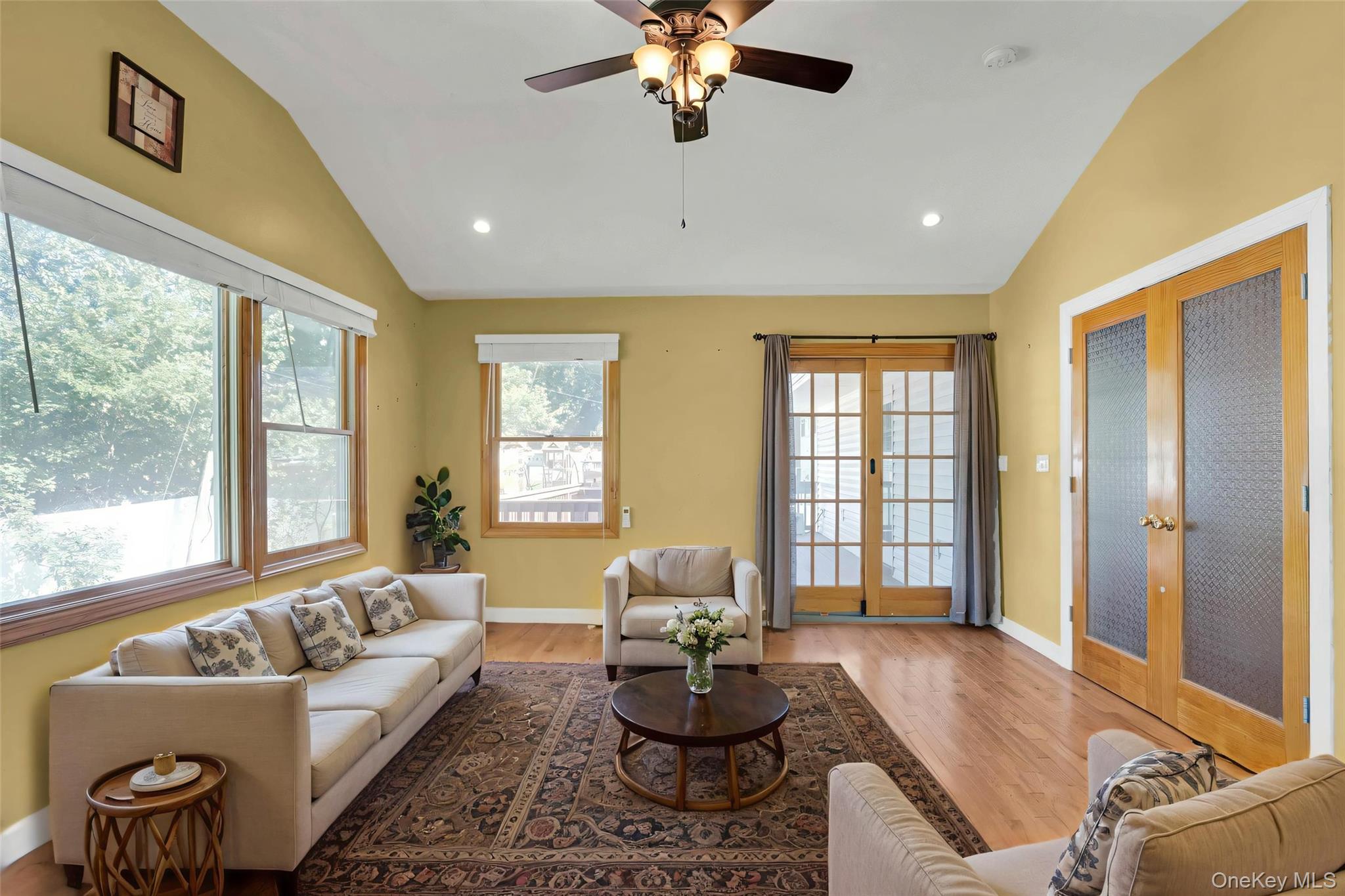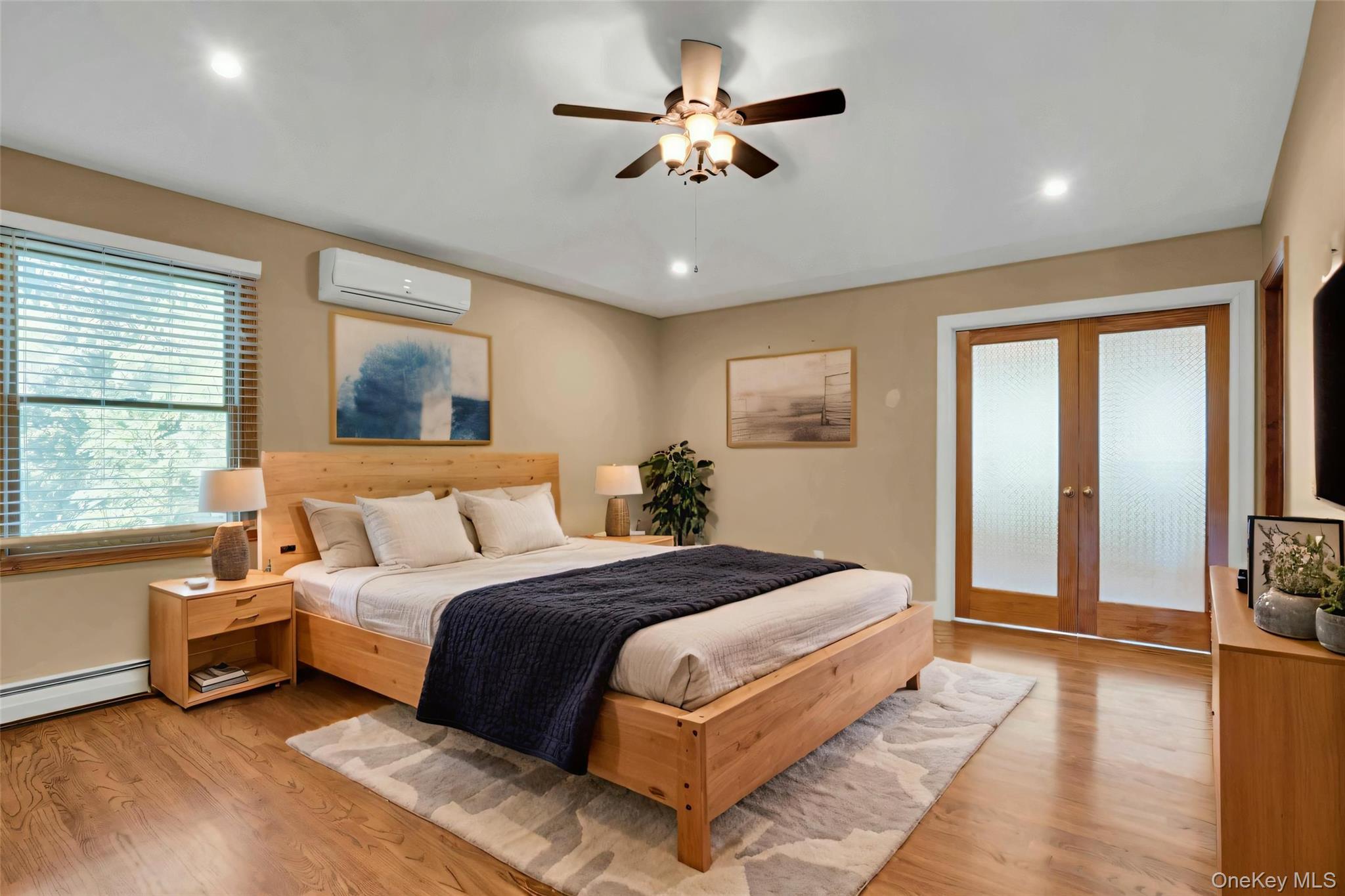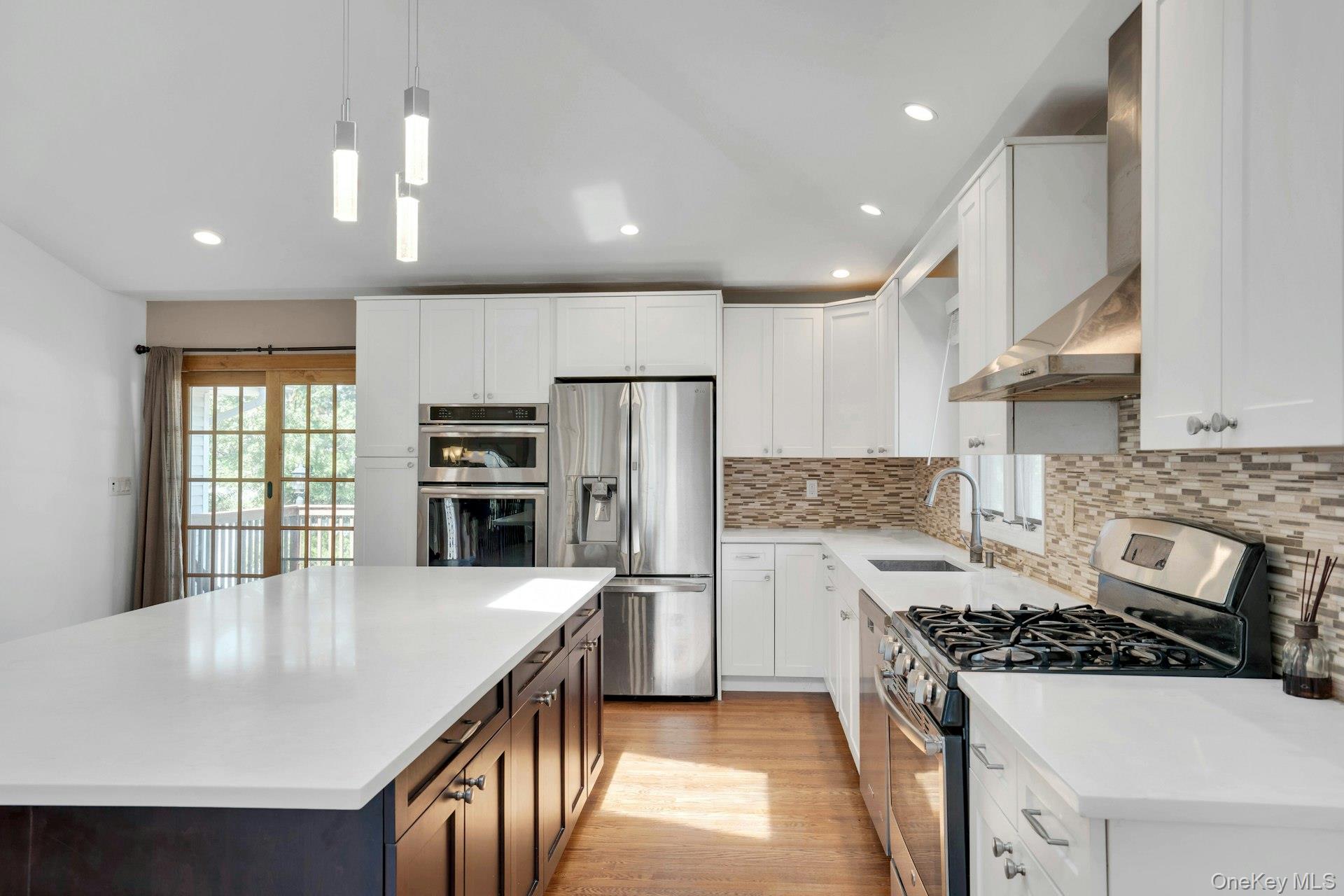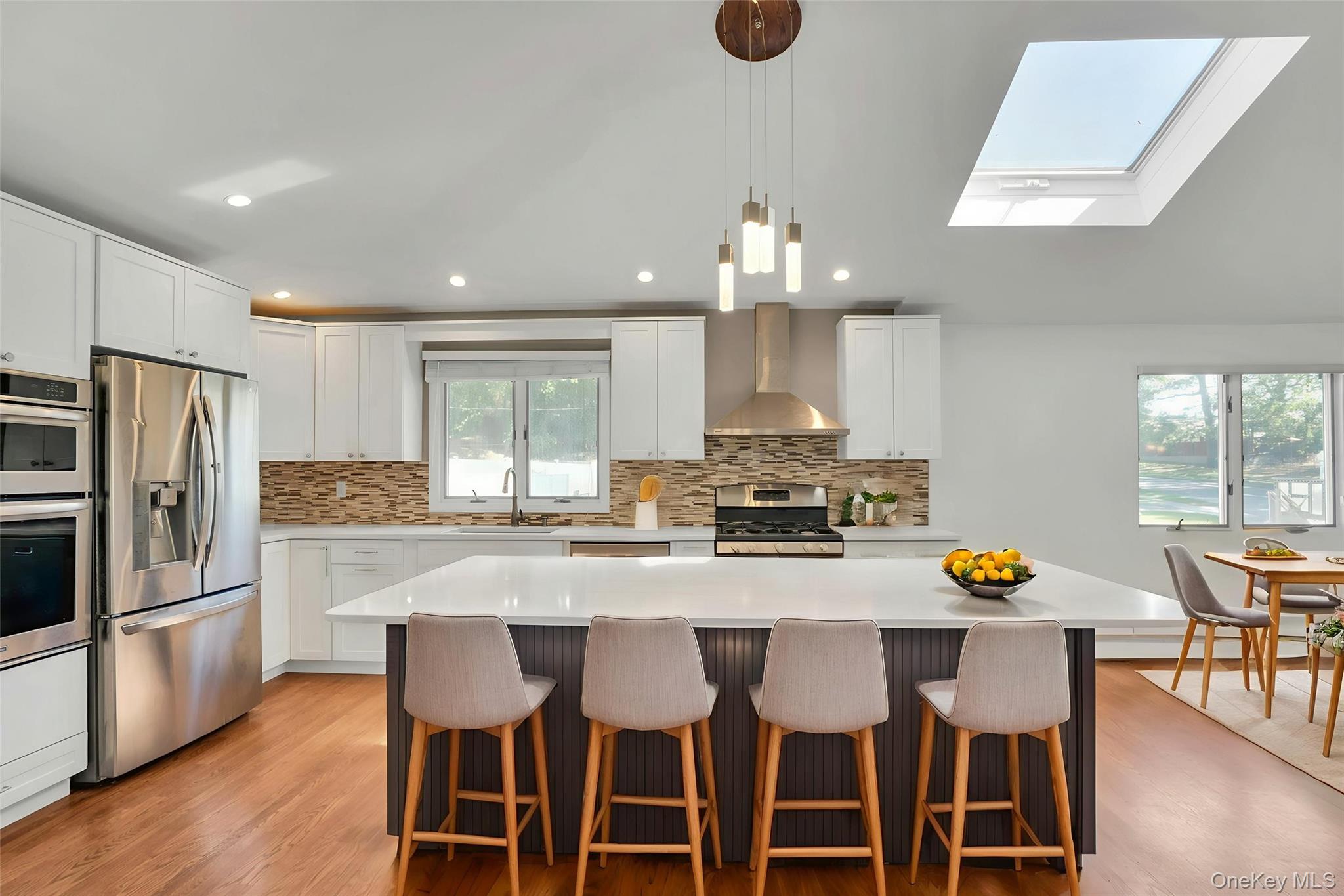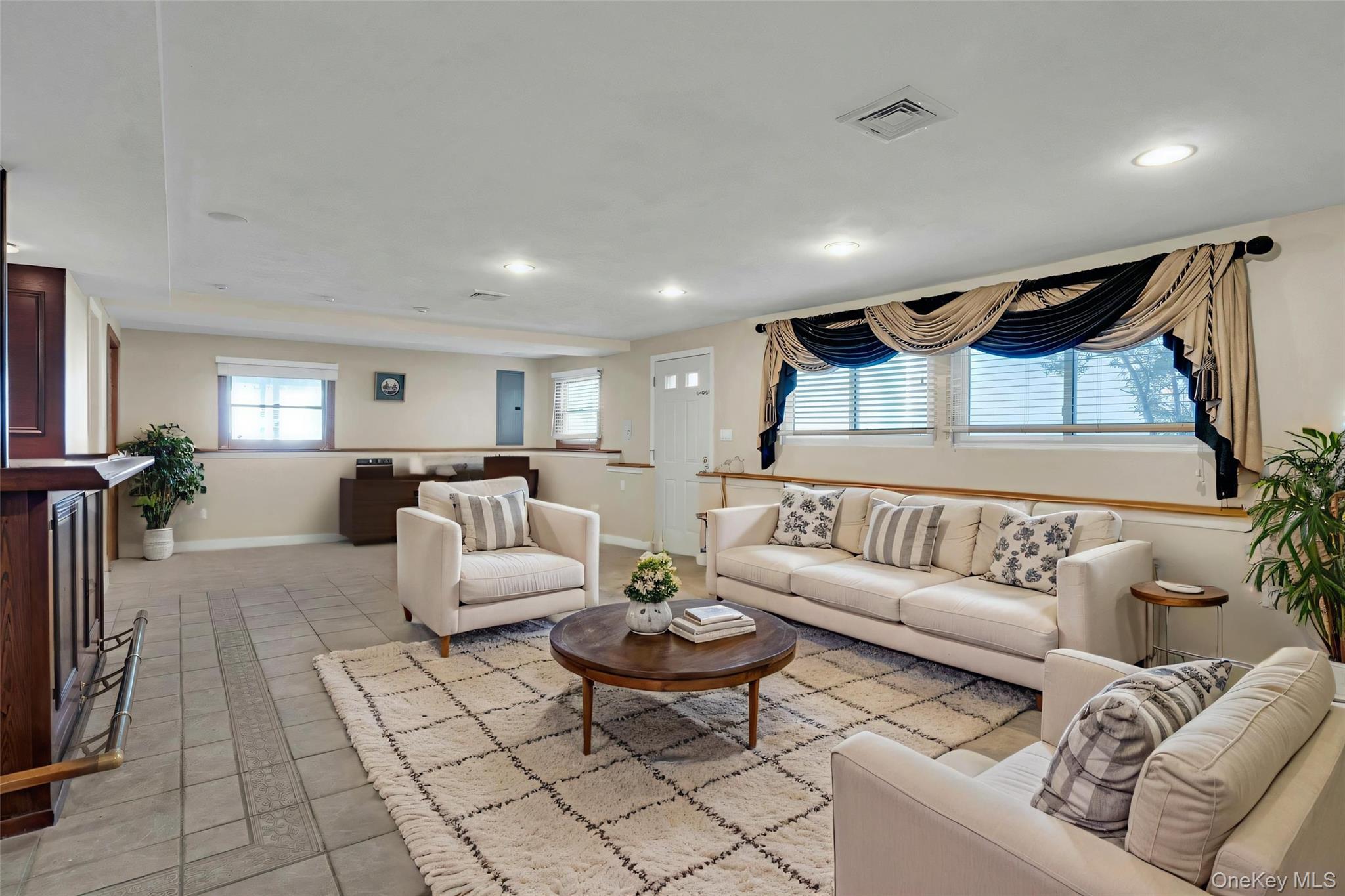 Welcome to 33 Pittoni Drive in the heart of Commack. This is an expanded high ranch with beautiful hardwood flooring and a fabulous open concept layout that features a cathedral ceiling with a skylight in the living room and kitchen. The gourmet kitchen was updated and renovated with the CHEF in mind. The 10ft Center Island anchors the space with quartz counters and plenty of storage. This is a GAS HOUSE so you have gas stove cooking with an oven and then there is also a wall oven for those bigger celebrations! You can be in before the holidays begin! For those beautiful summer, spring and fall days you can enjoy your diner on the deck overlooking the green lawn and garden. The primary bedroom is a true retreat with an extra room added onto the back of the house with access to the deck. You can use this extra space as a private office, dressing room, gym, nursery, or all of thee above over time! The primary bathroom has soaring ceilings and a skylight so this home is always bright! The lower level is an entertainers dream featuring the mahogany wet bar and large family room. There is also a bedroom and full bathroom as well as an outside entrance to the yard. The 2 car garage has plenty of space for extra storage. The yard is a nice flat piece of property with a large garden and room for a pool. 5 Split System A/C units, Roof 10 years, Cesspool 25 years and regularly maintained, Boiler 10 years, HWH 7 Years.