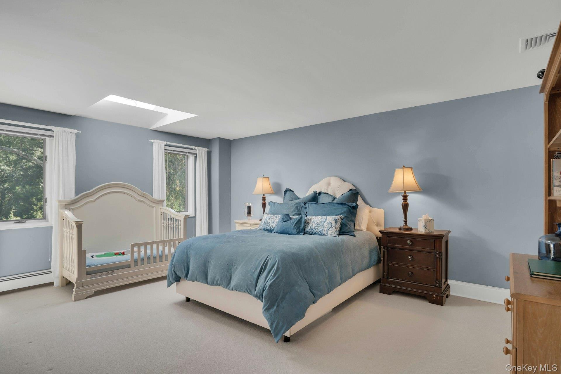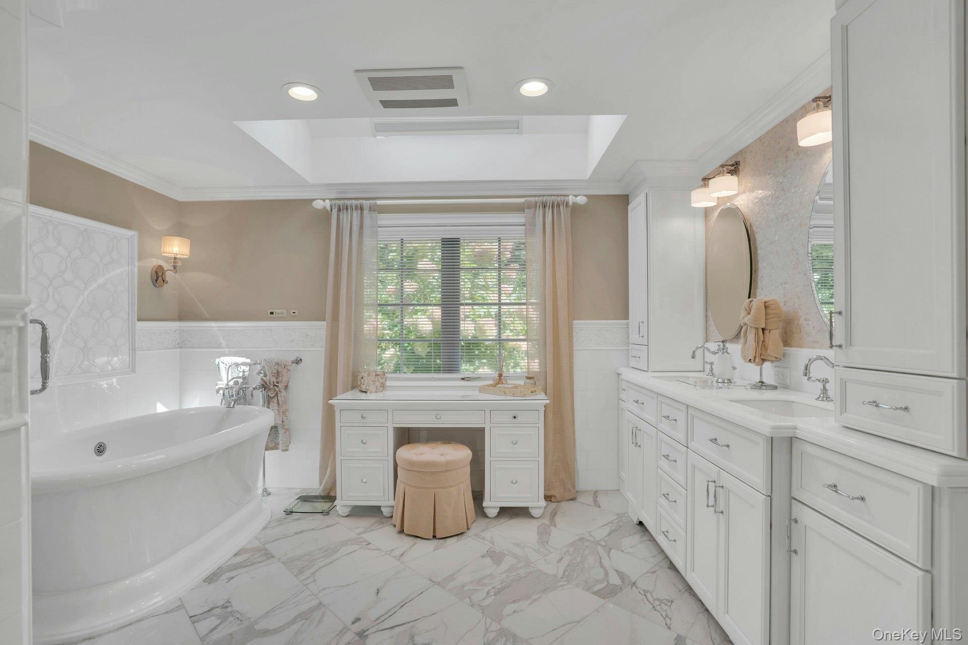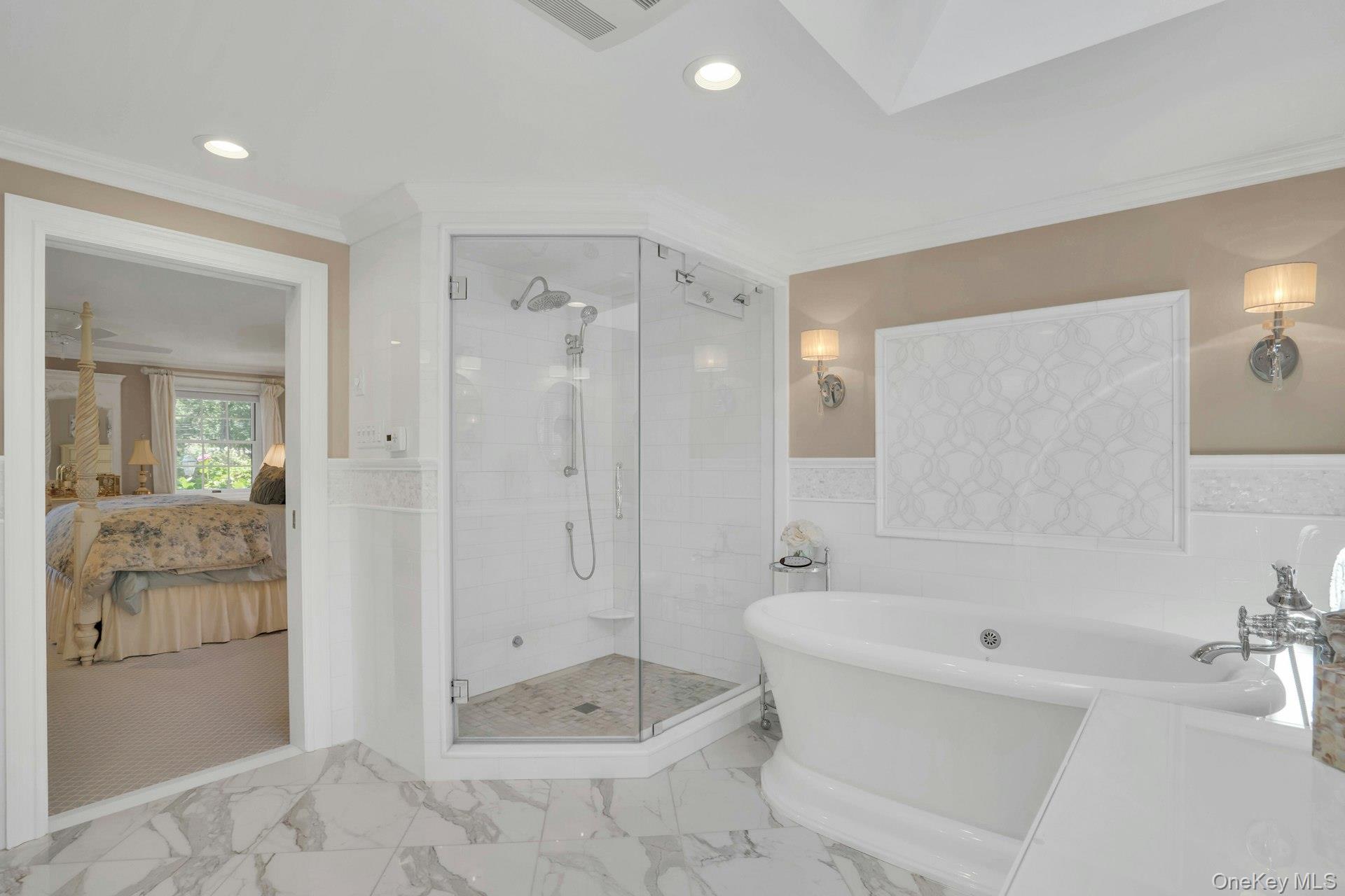 The primary bedroom is on the first floor and is a quiet retreat with a marble ensuite bathroom. There is a large walk-in closet with a middle island and 2 additional closets. The bathroom features a steam shower, double vanity with double towers for storage, a Bain Ultra Spa Tub and radiant heated floors. Let Calgon take you away! Before heading upstairs, the first floor offers another spacious bedroom with a full ensuite bathroom for guests, along with an additional den with a wood burning fireplace and a stunning four-season sunroom. This sunroom is a true showpiece, featuring three full walls of windows, soaring cathedral ceilings, multiple skylights, radiant heated floors, and its own gas fireplace--creating a bright, warm, and inviting space to enjoy year-round. Ascend the bridal staircase and there you will find three beautifully decorated oversized bedrooms with gorgeous windows and skylights and a full bath with marble tile.