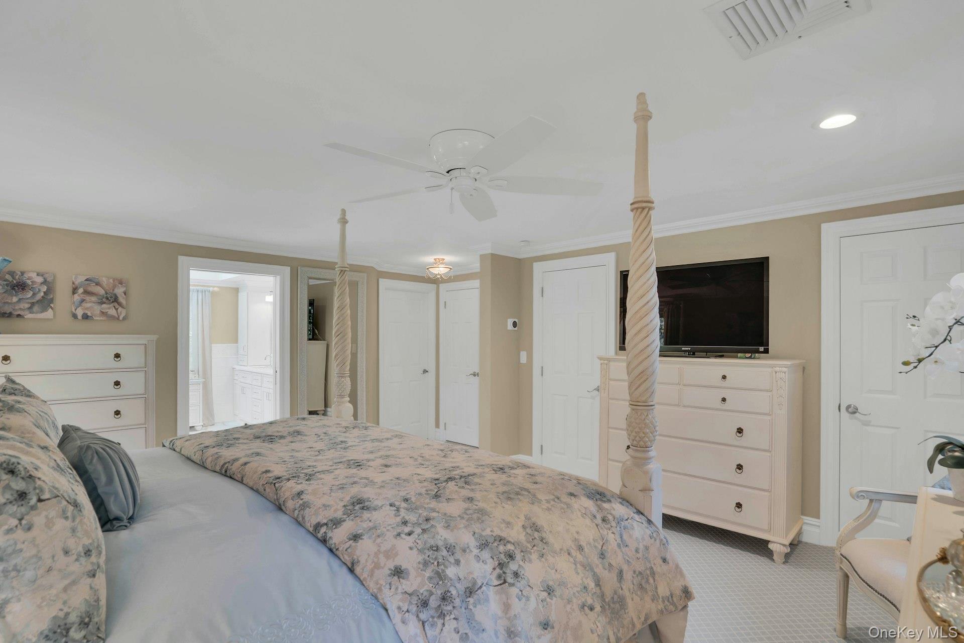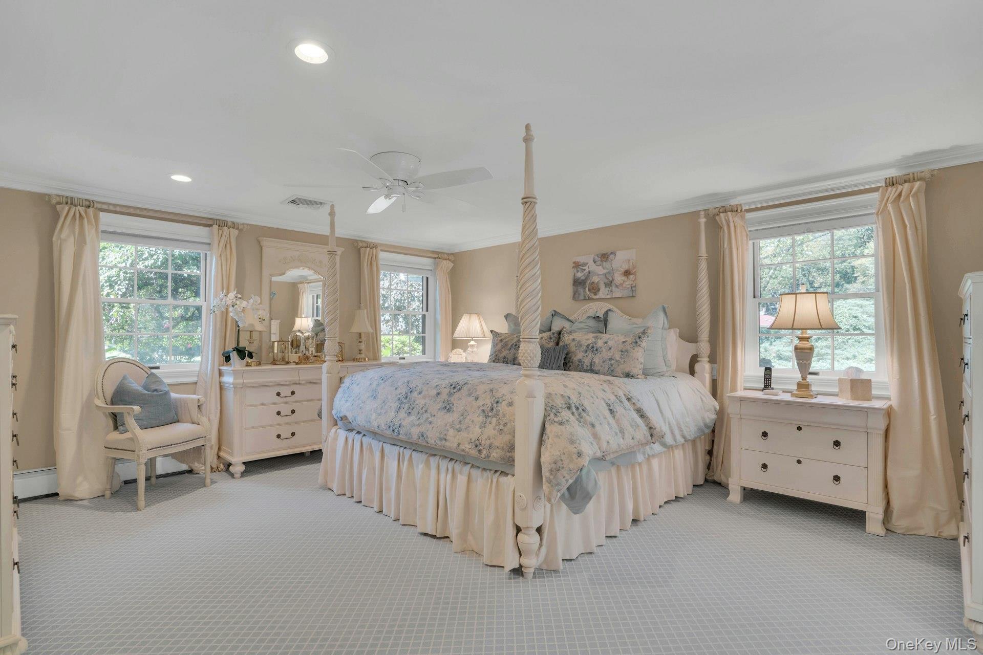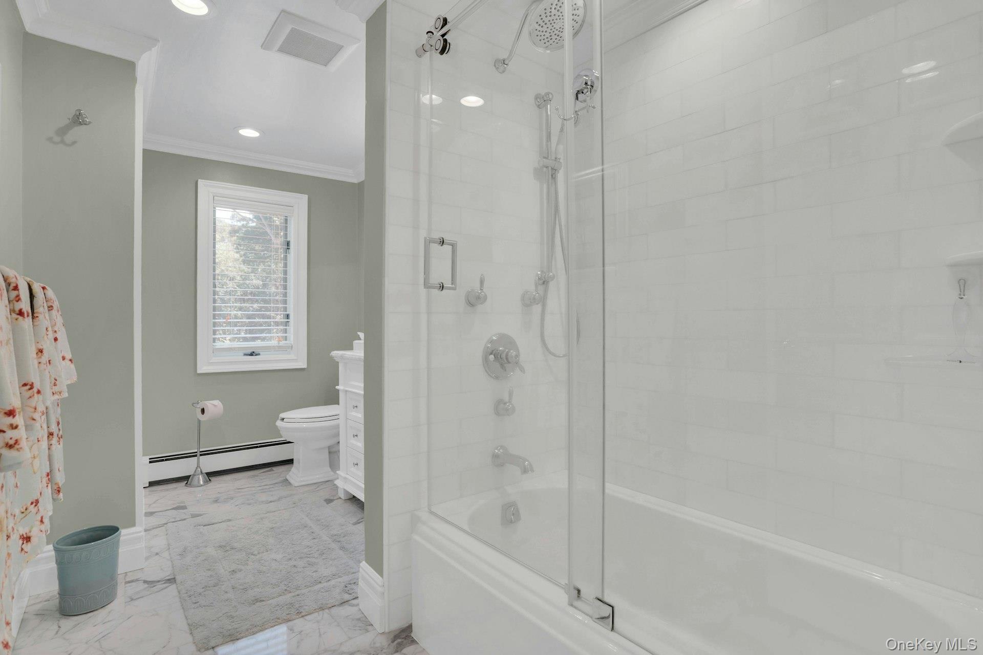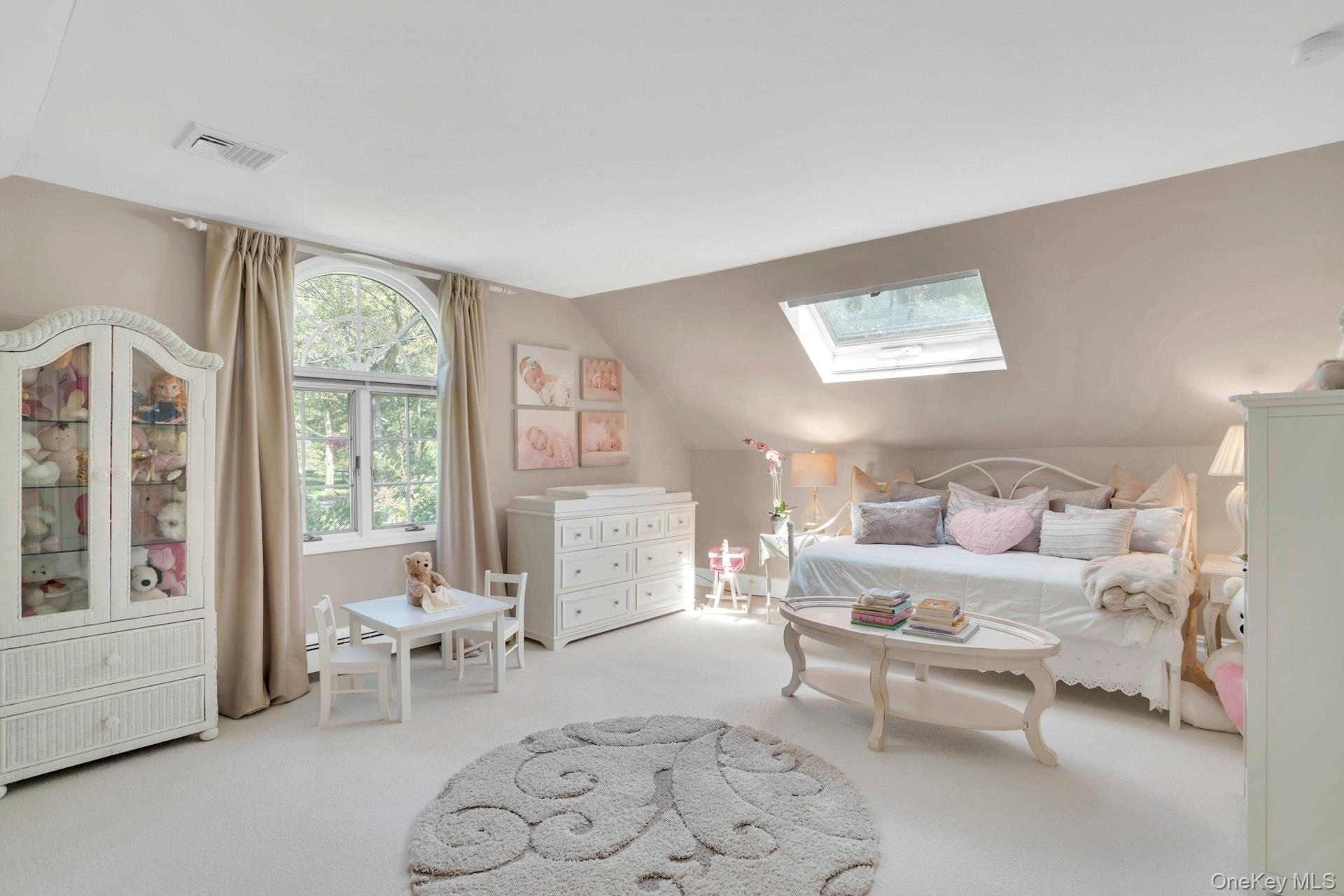 The primary bedroom is on the first floor and is a quiet retreat with a marble ensuite bathroom. There is a large walk-in closet with a middle island and 2 additional closets. The bathroom features a steam shower, double vanity with double towers for storage, a Bain Ultra Spa Tub and radiant heated floors. Let Calgon take you away! Before heading upstairs, the first floor offers another spacious bedroom with a full ensuite bathroom for guests, along with an additional den with a wood burning fireplace and a stunning four-season sunroom. This sunroom is a true showpiece, featuring three full walls of windows, soaring cathedral ceilings, multiple skylights, radiant heated floors, and its own gas fireplace--creating a bright, warm, and inviting space to enjoy year-round. Ascend the bridal staircase and there you will find three beautifully decorated oversized bedrooms with gorgeous windows and skylights and a full bath with marble tile.