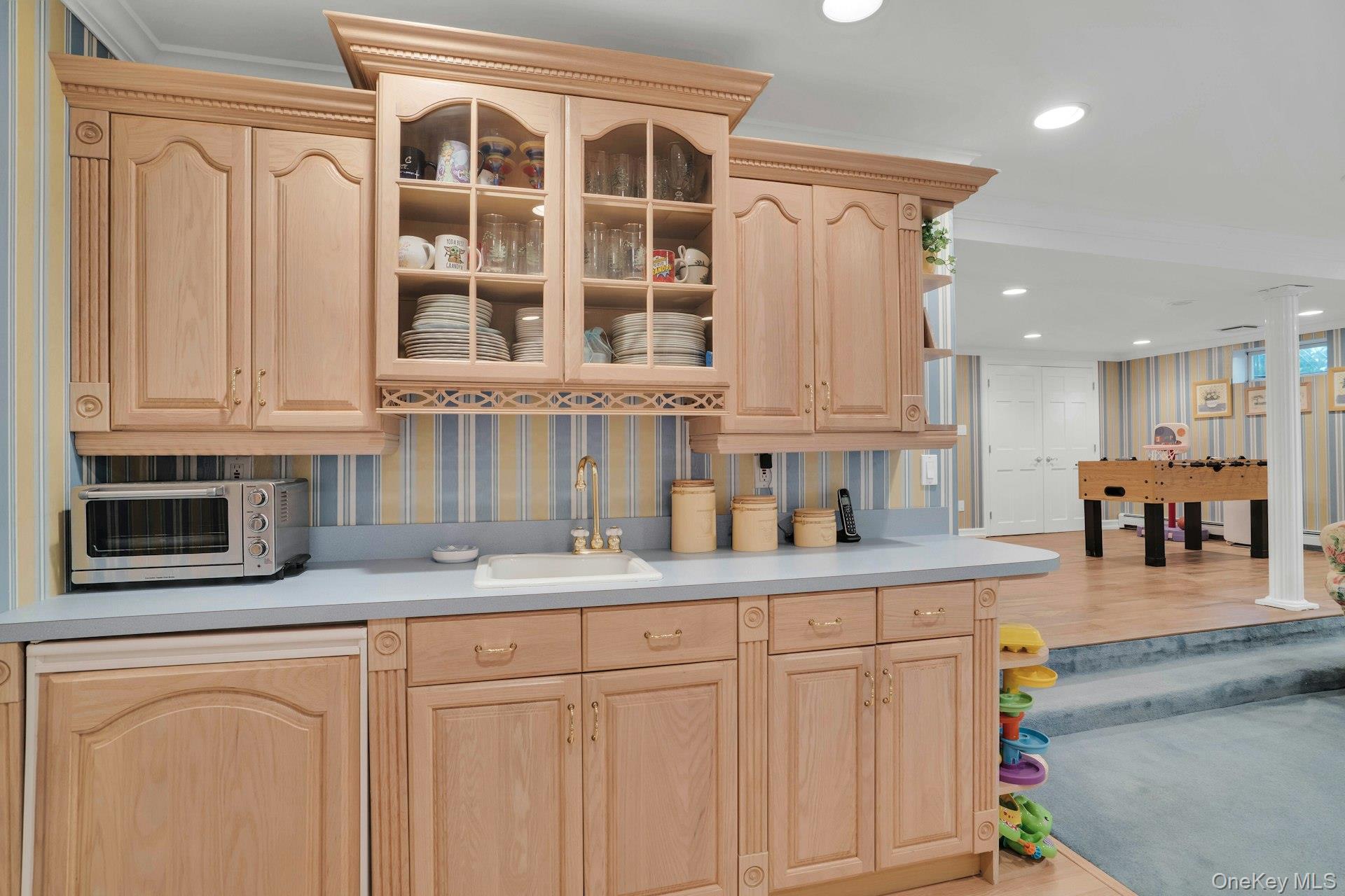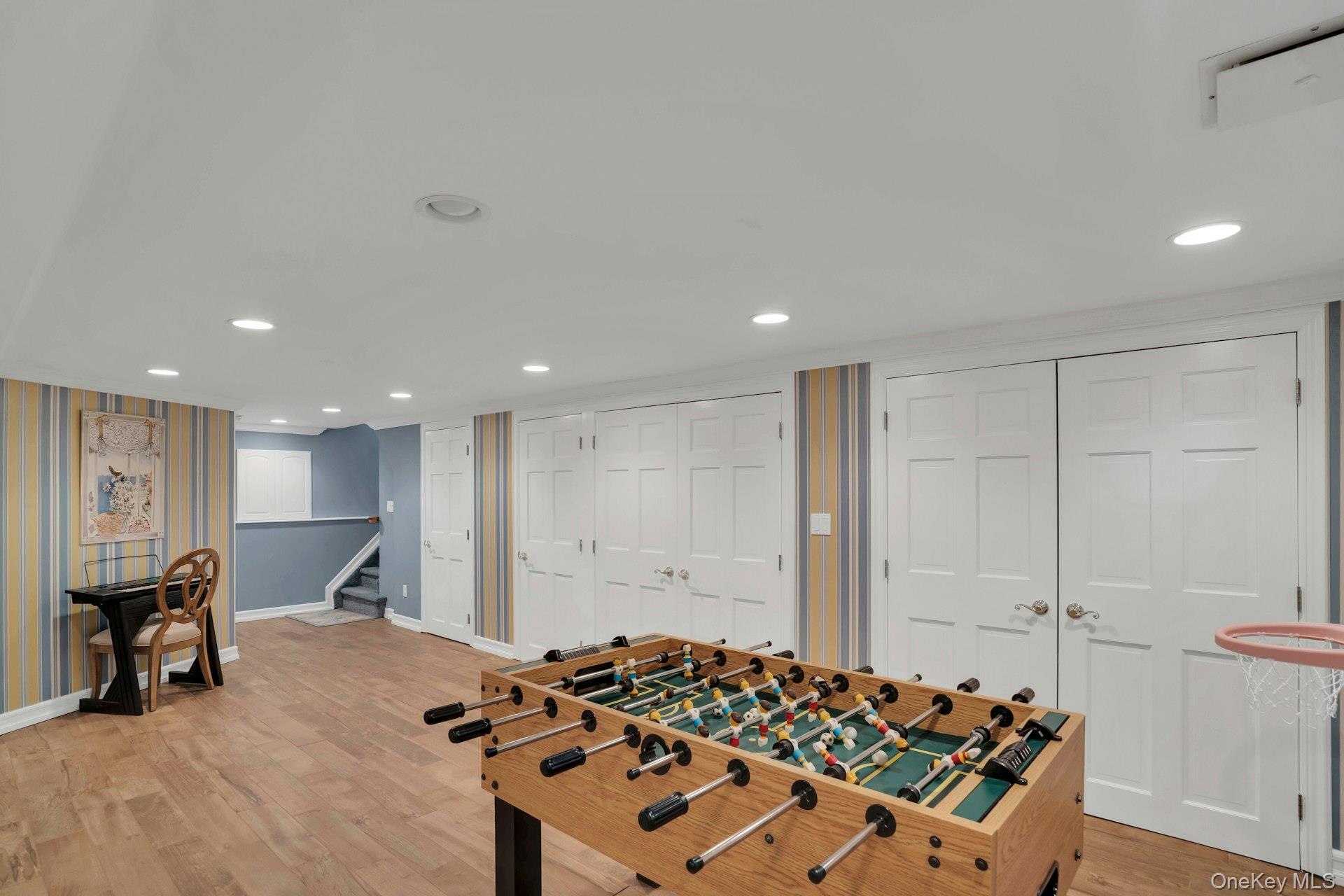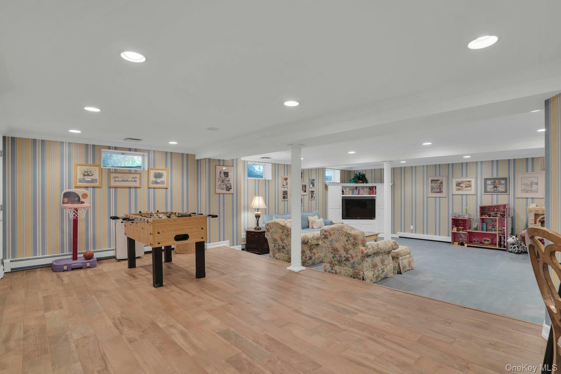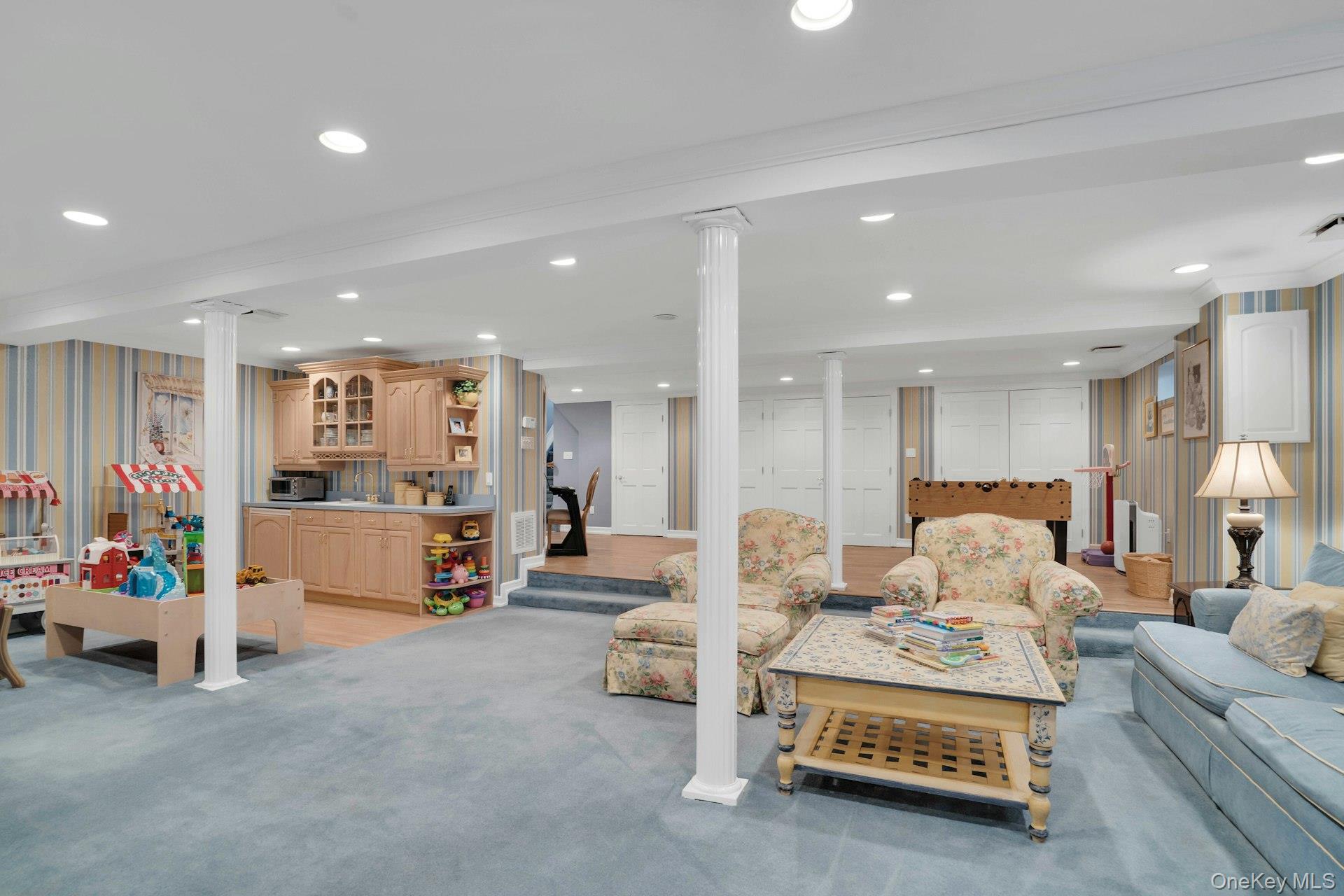 The basement is so homey and inviting with its own heating and air conditioning. Finished with tile flooring, decorative columns and carpeting, featuring a game room area and a cozy den and playroom, with 8ft ceilings. There is a small wet bar with storage cabinets for snacks. Closets and more closets! Then you have your laundry room with Electrolux washer and dryer.