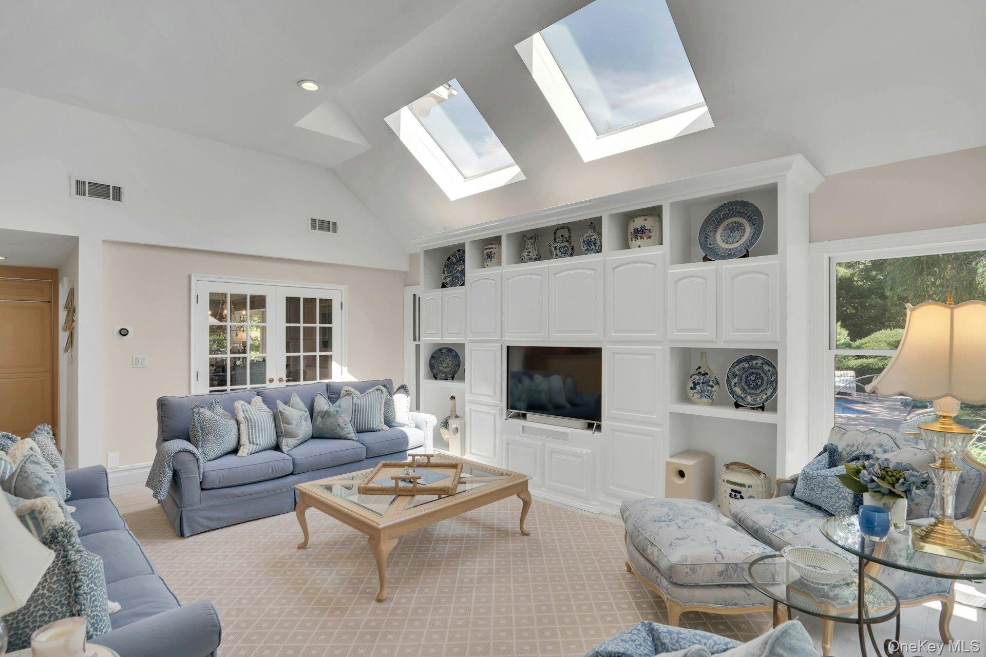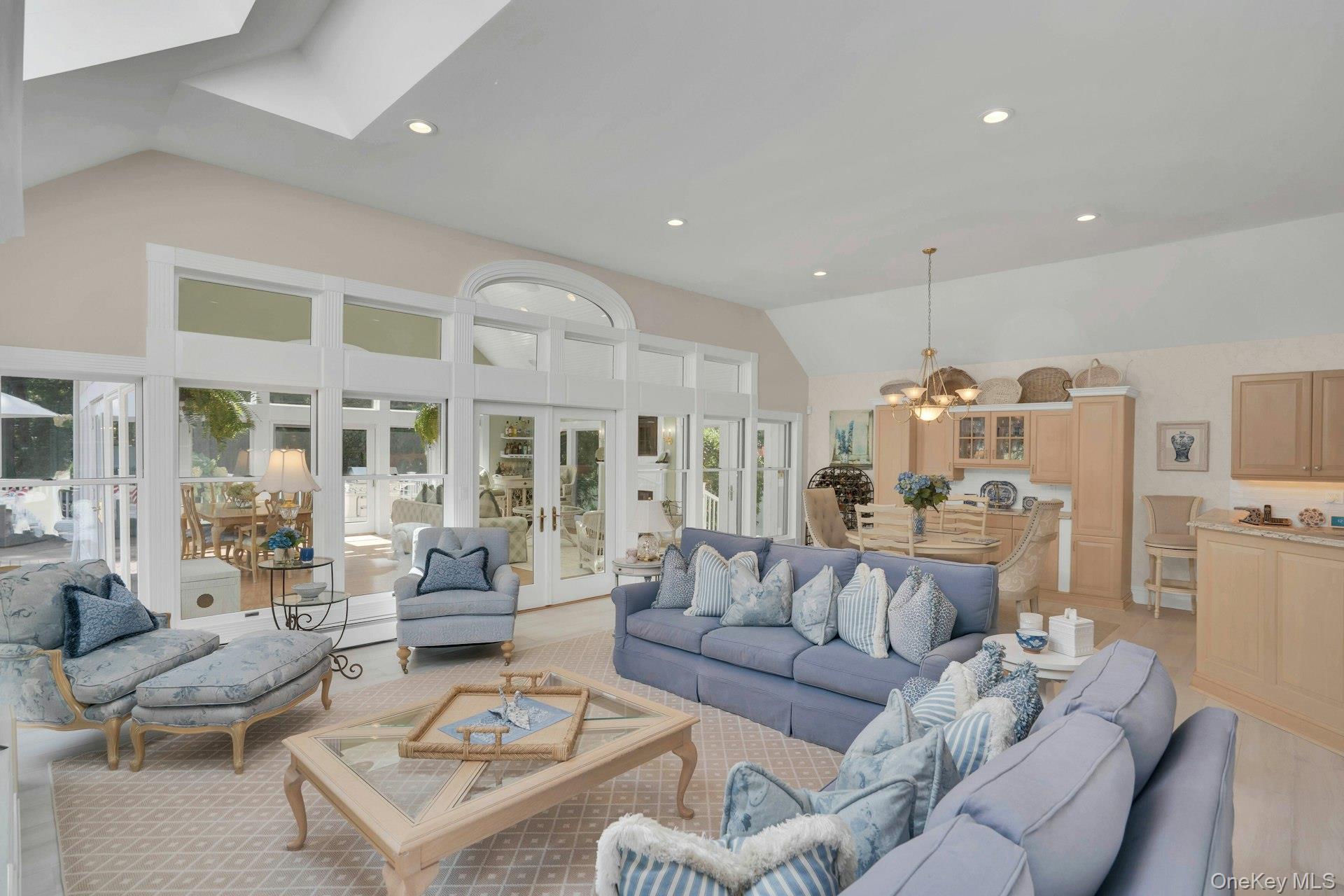 As you approach this stunning farm house ranch you are greeted by the gardens all leading up to the covered porch. Enter through the gorgeous front door into the 2 story hallway with the catwalk bridal staircase, custom wainscoting, marble floor, and the first 2 of 13 skylights. Then step into the living room and dining room with hardwood floors and a wall of windows. The kitchen is an open floor plan that gives options to the discerning chef. There is a gas stove and an electric induction stove and of course, a double oven. Double islands means there can't be too many cooks in the kitchen! A Wet Bar with lots of cabinets service the kitchen table. The kitchen is open to a large Great Room with built-ins for storage and TV and 2 skylights that brighten the room.