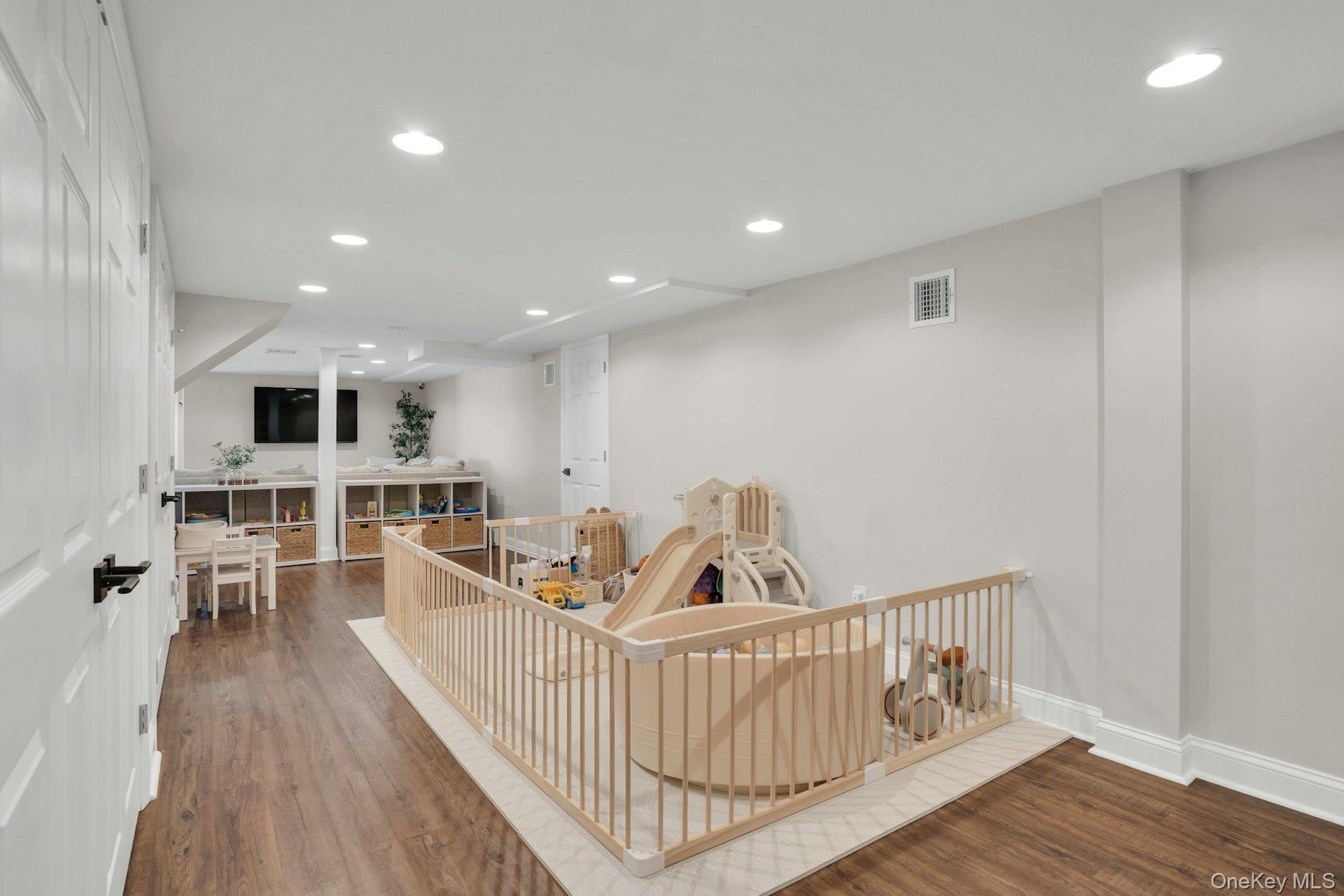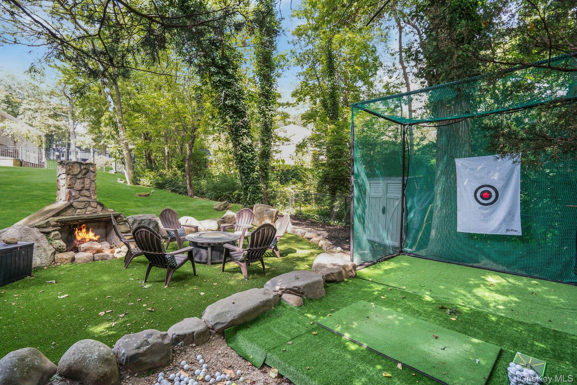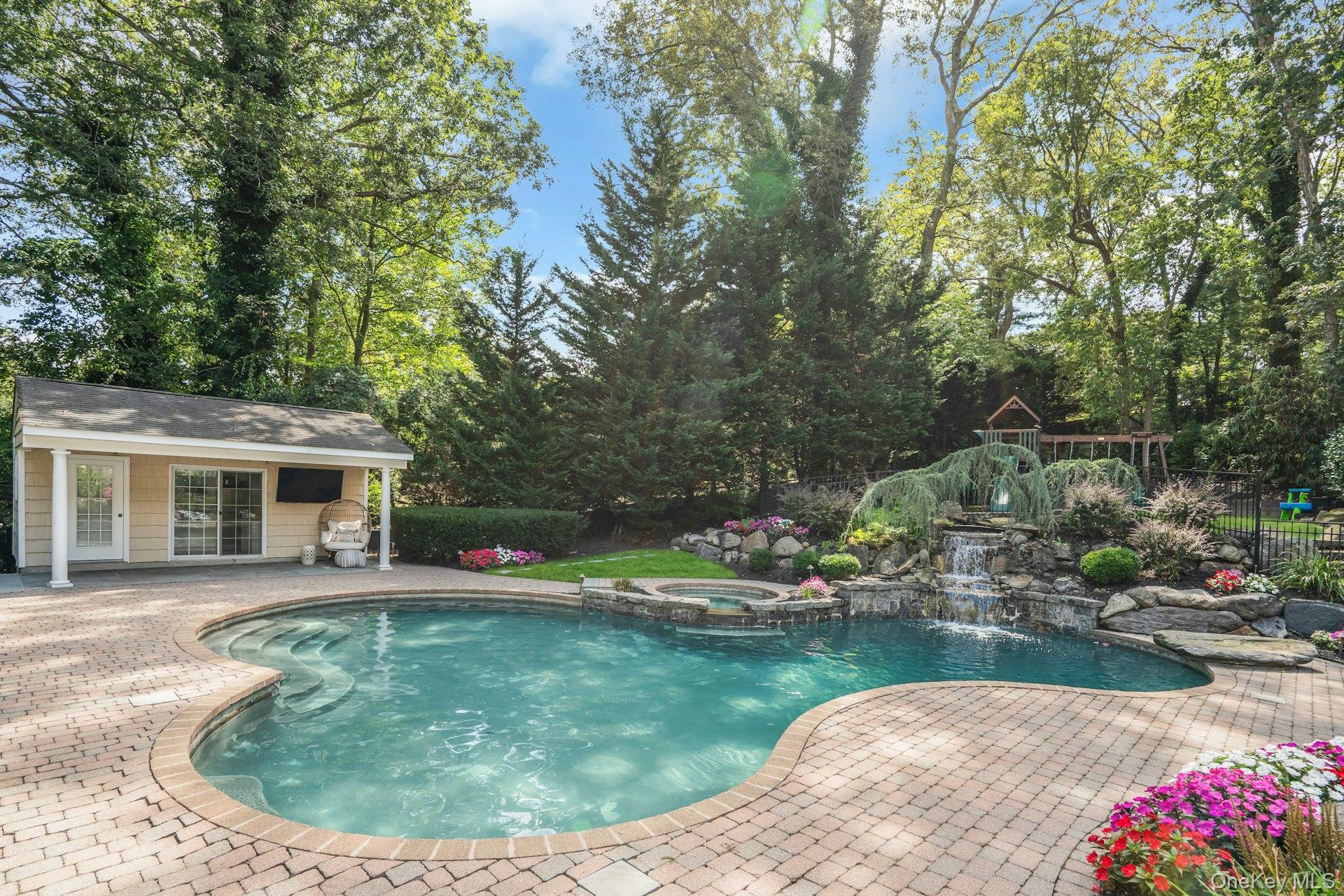 Step outside to your own private resort. The backyard boasts a heated in-ground, salt-water, gunite pool, hot tub, and cascading waterfall feature framed by vibrant landscaping. A charming pool house with covered seating and an outdoor kitchen area create the perfect setting for summer entertaining. There is an elevated turf playground area (playground not included) and down below you will find an outdoor fireplace and a firepit area with a golfing net! The expansive patio and lush yard provide endless opportunities for recreation and relaxation. Let us not forget that there is also a turf dog-run right out the side door of the kitchen for your furry friends.