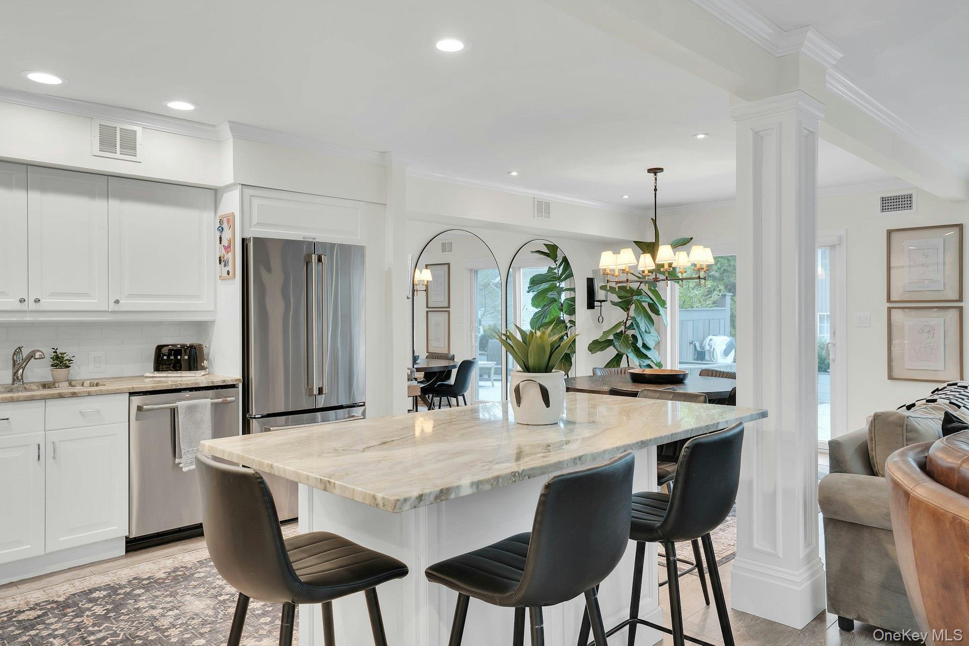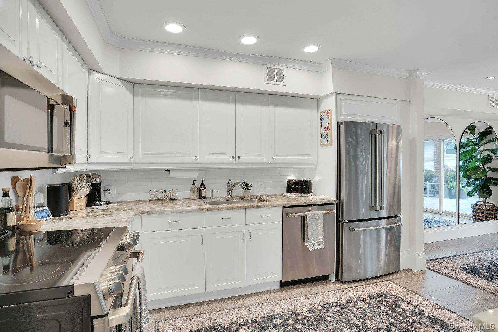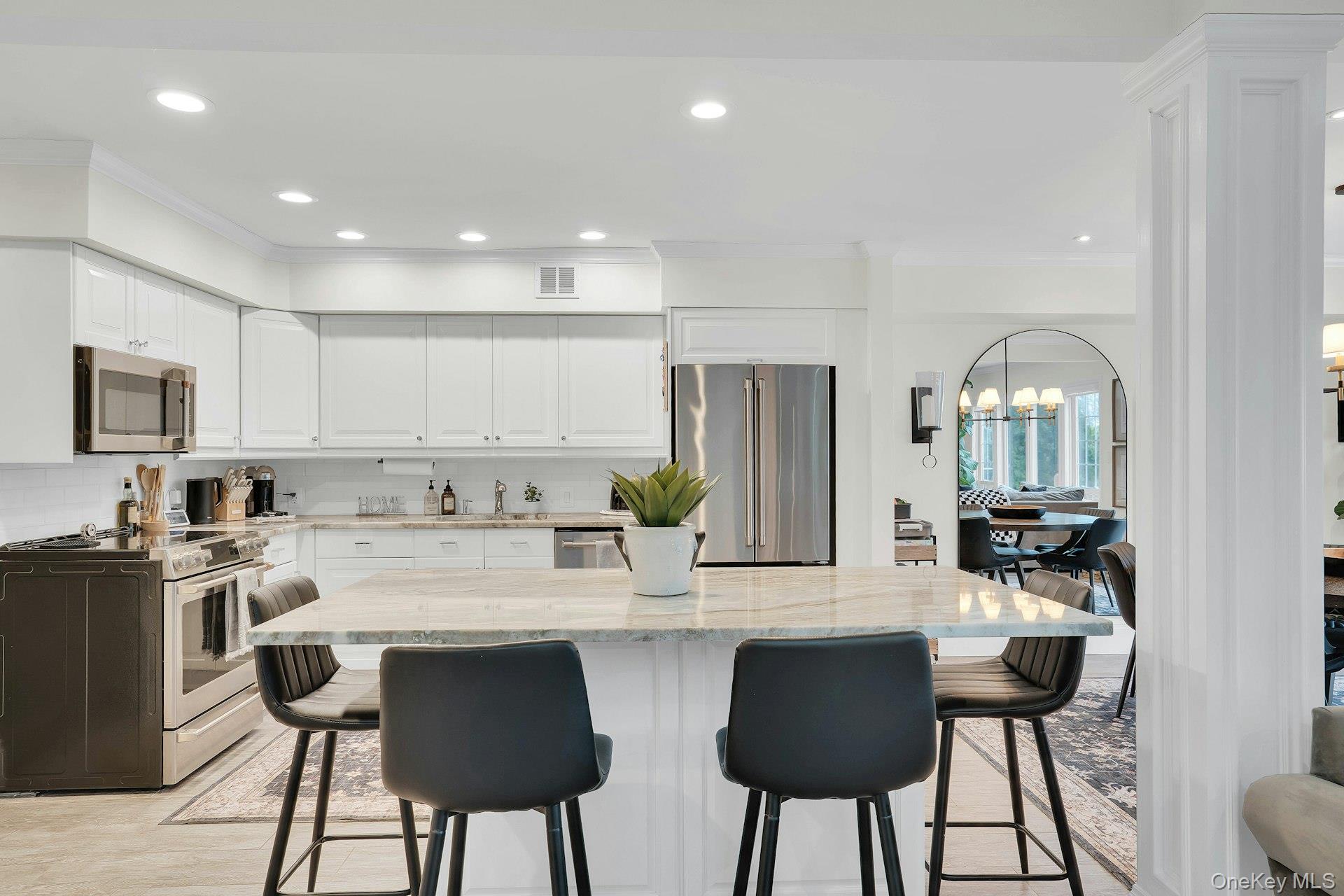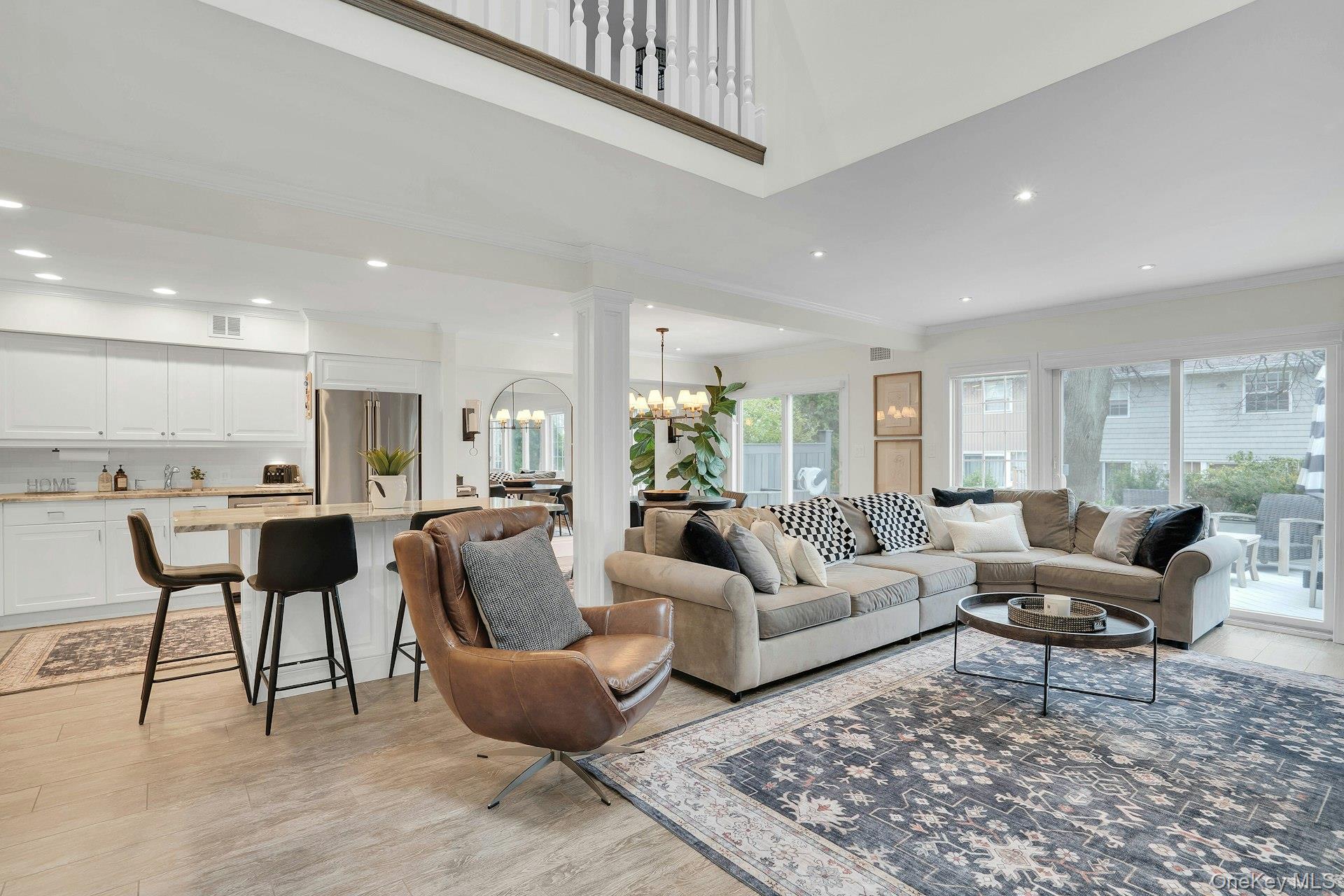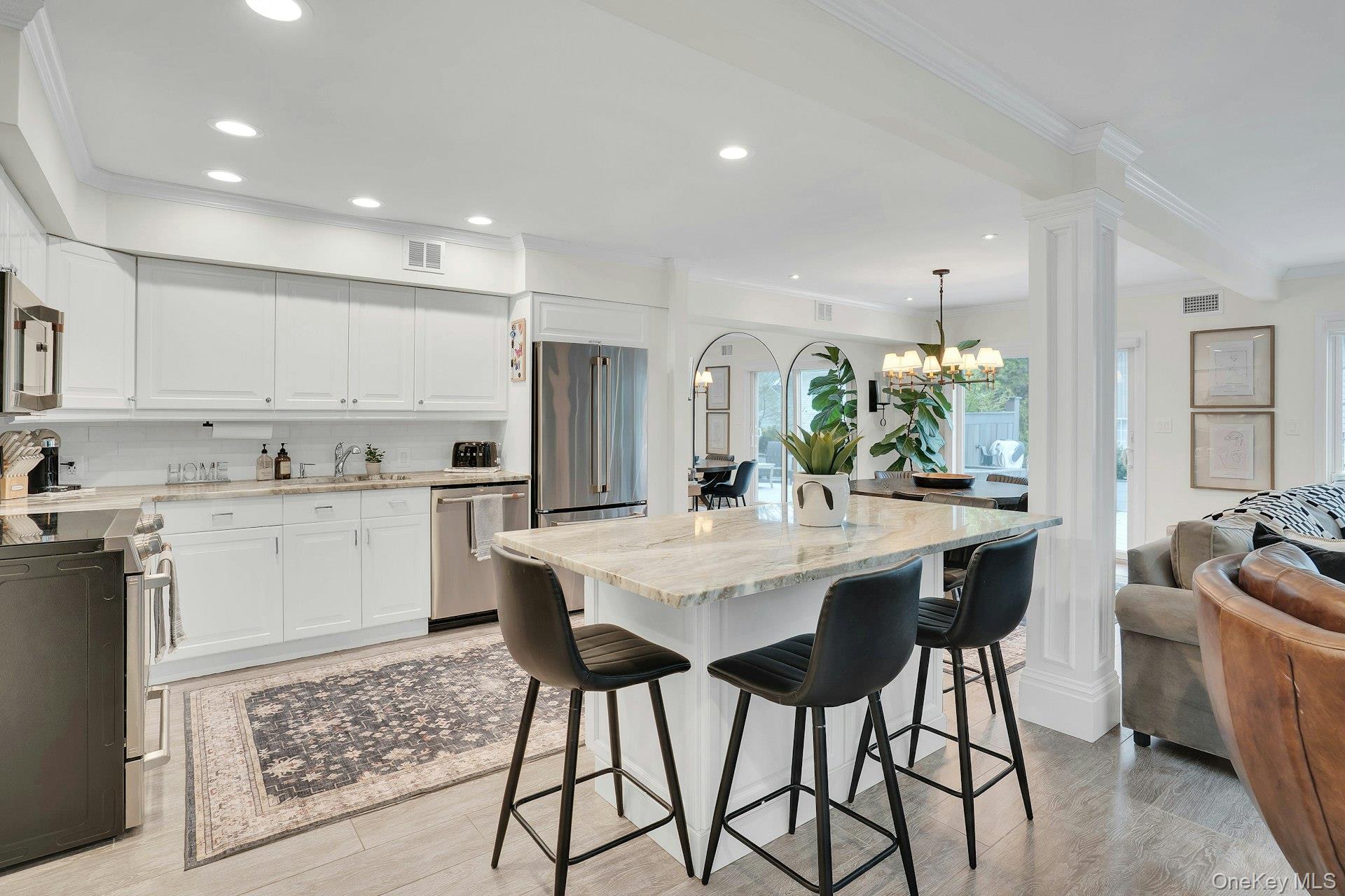 The home features a luxurious open floor plan highlighted by a renovated eat-in kitchen with quartzite countertops, designer tile backsplash, updated flooring, and LED lighting throughout. A first-floor full bath with shower adds convenience and flexibility for guests or extended living.