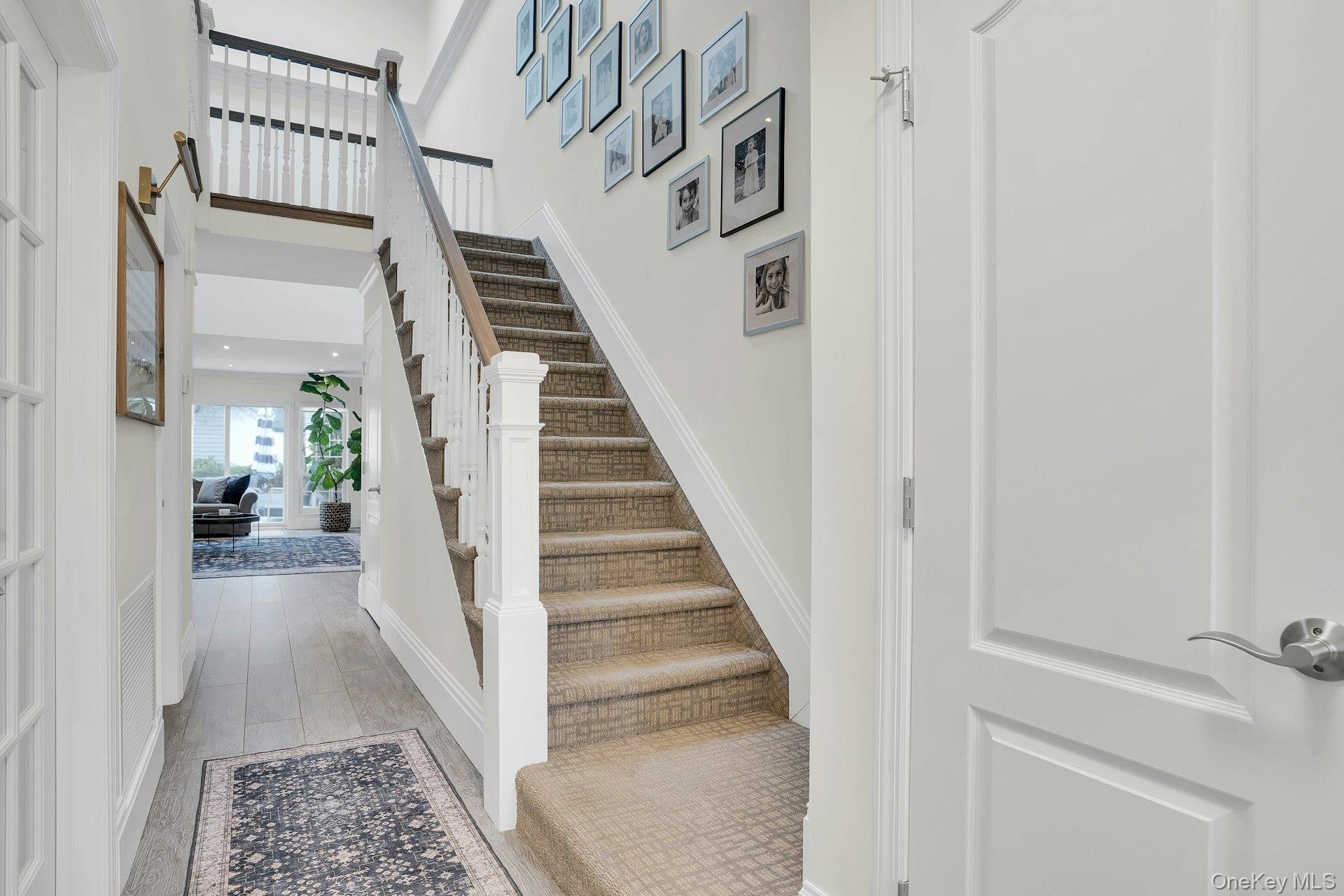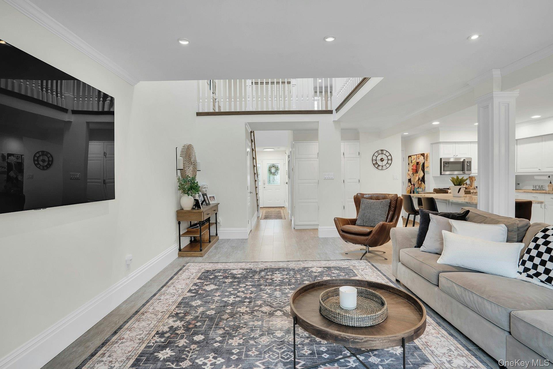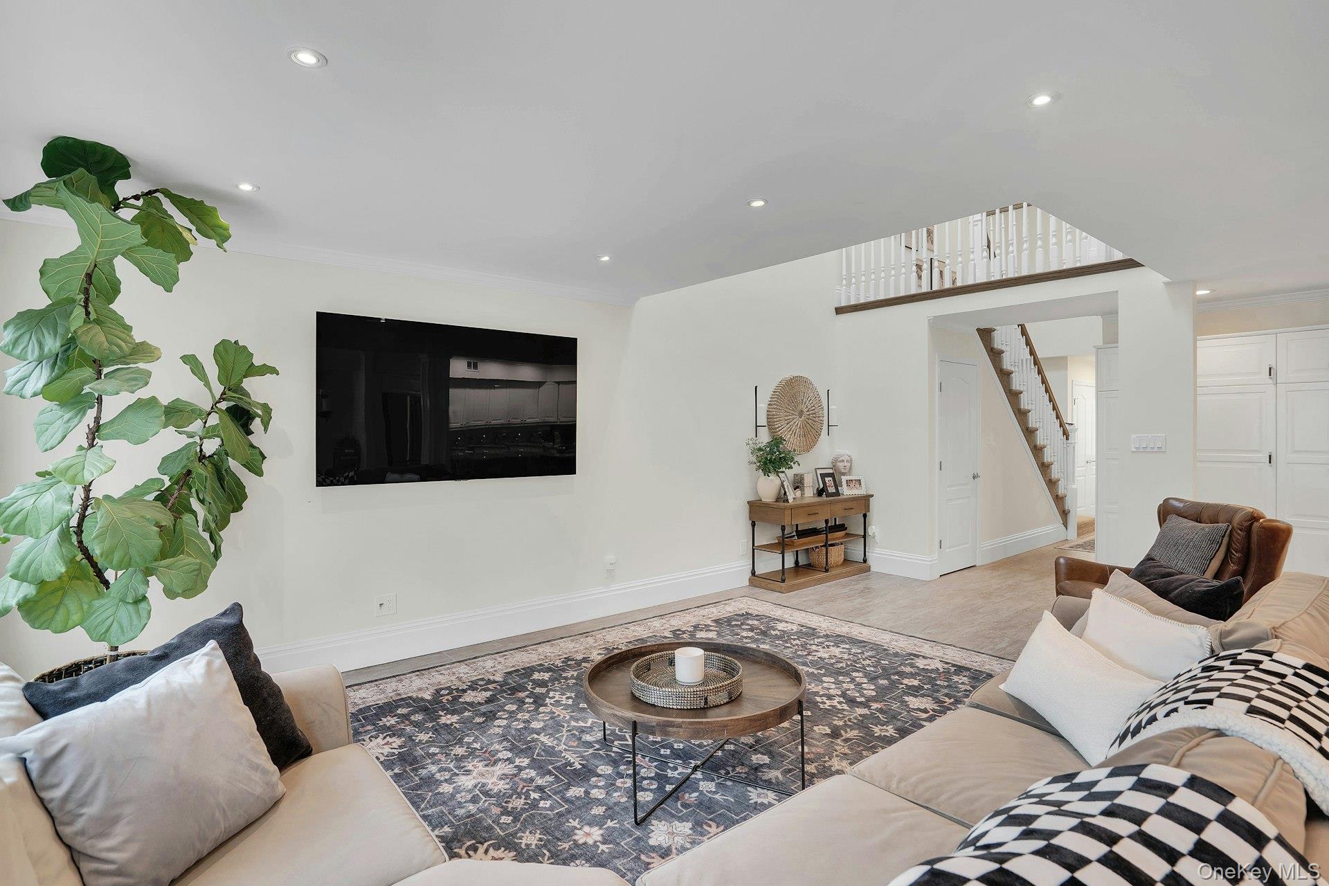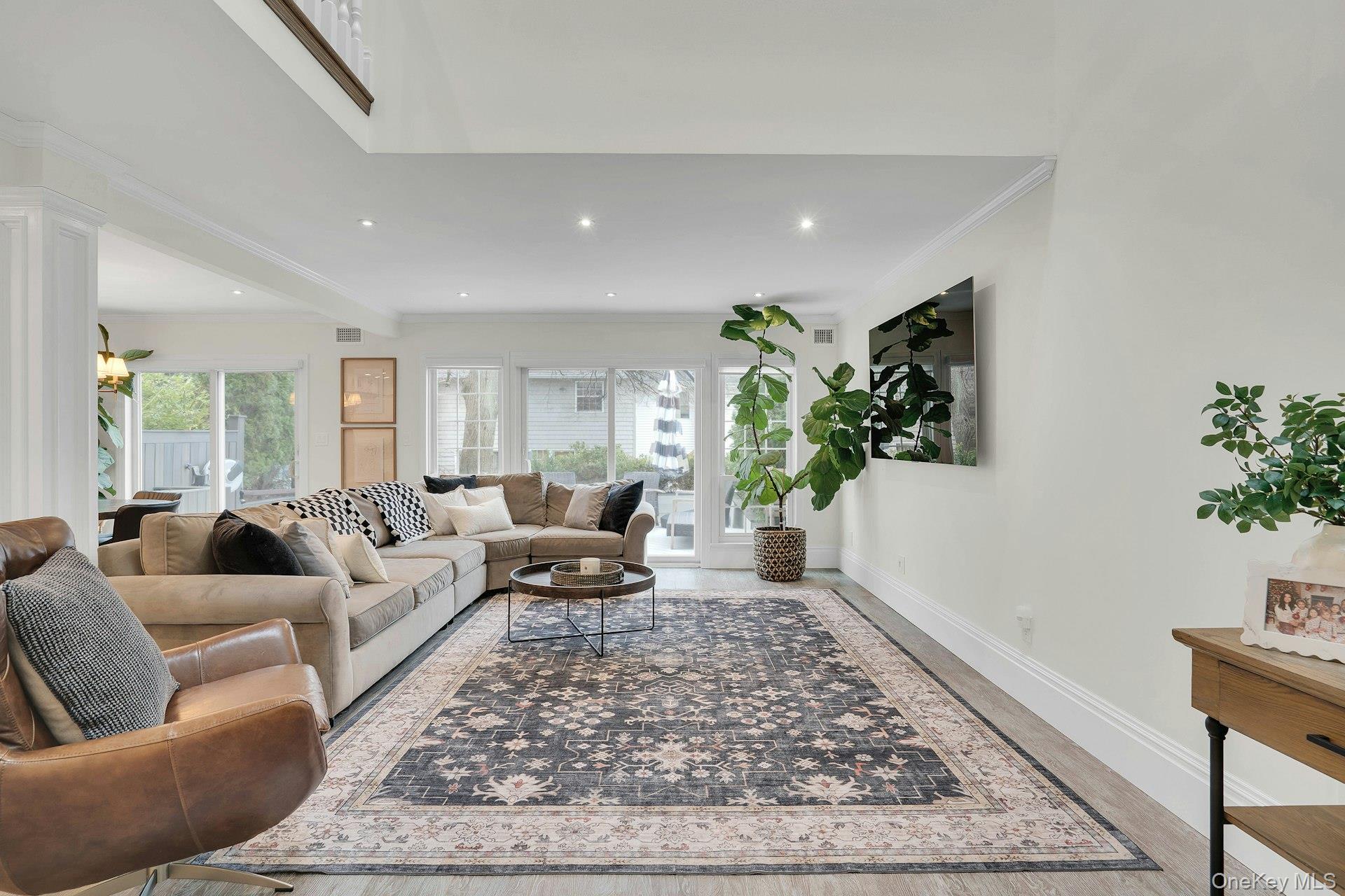 The home features a luxurious open floor plan highlighted by a renovated eat-in kitchen with quartzite countertops, designer tile backsplash, updated flooring, and LED lighting throughout. A first-floor full bath with shower adds convenience and flexibility for guests or extended living.