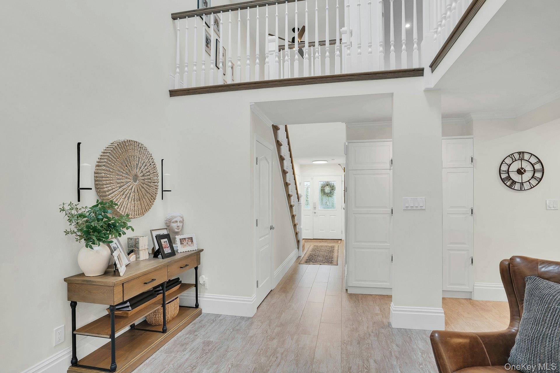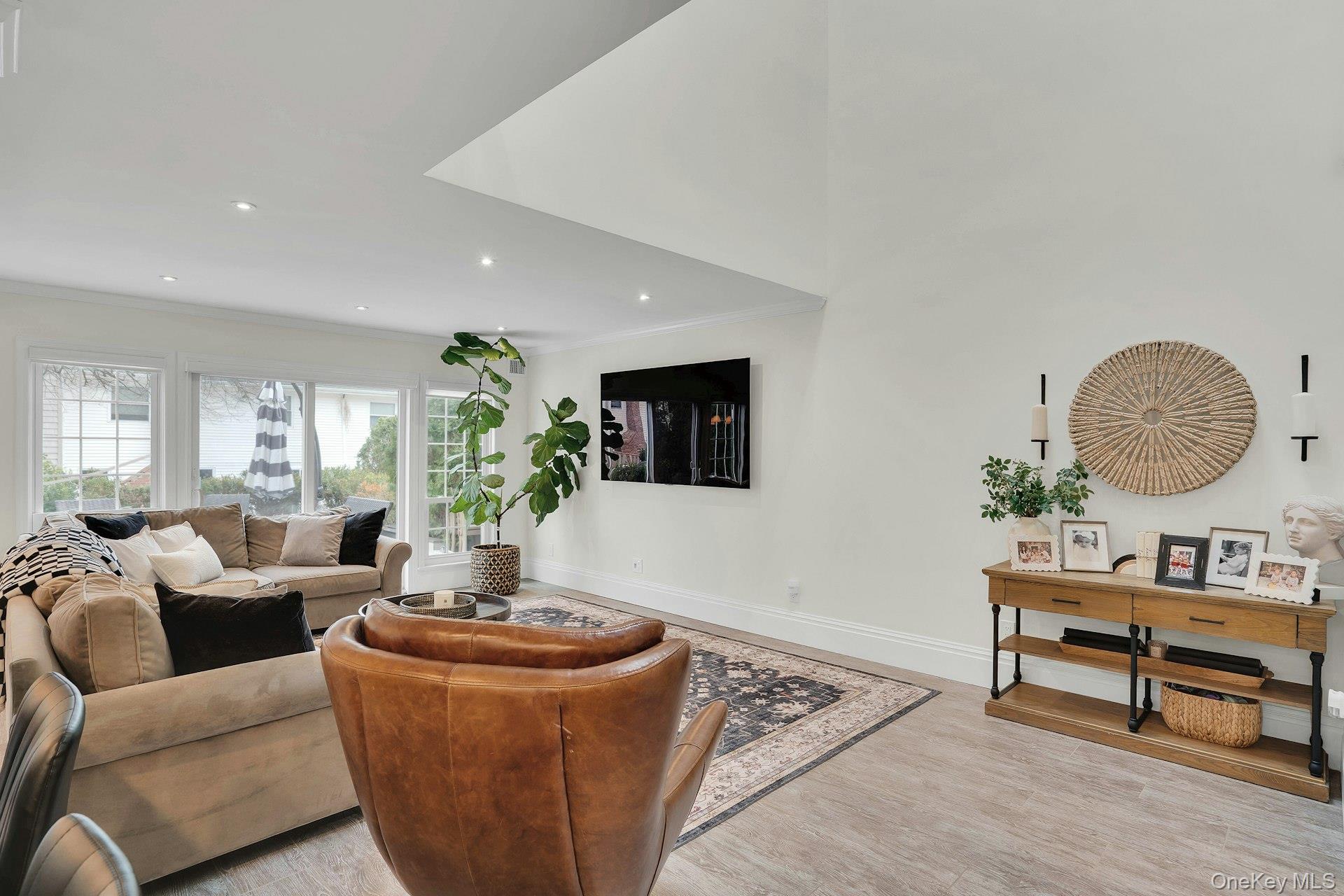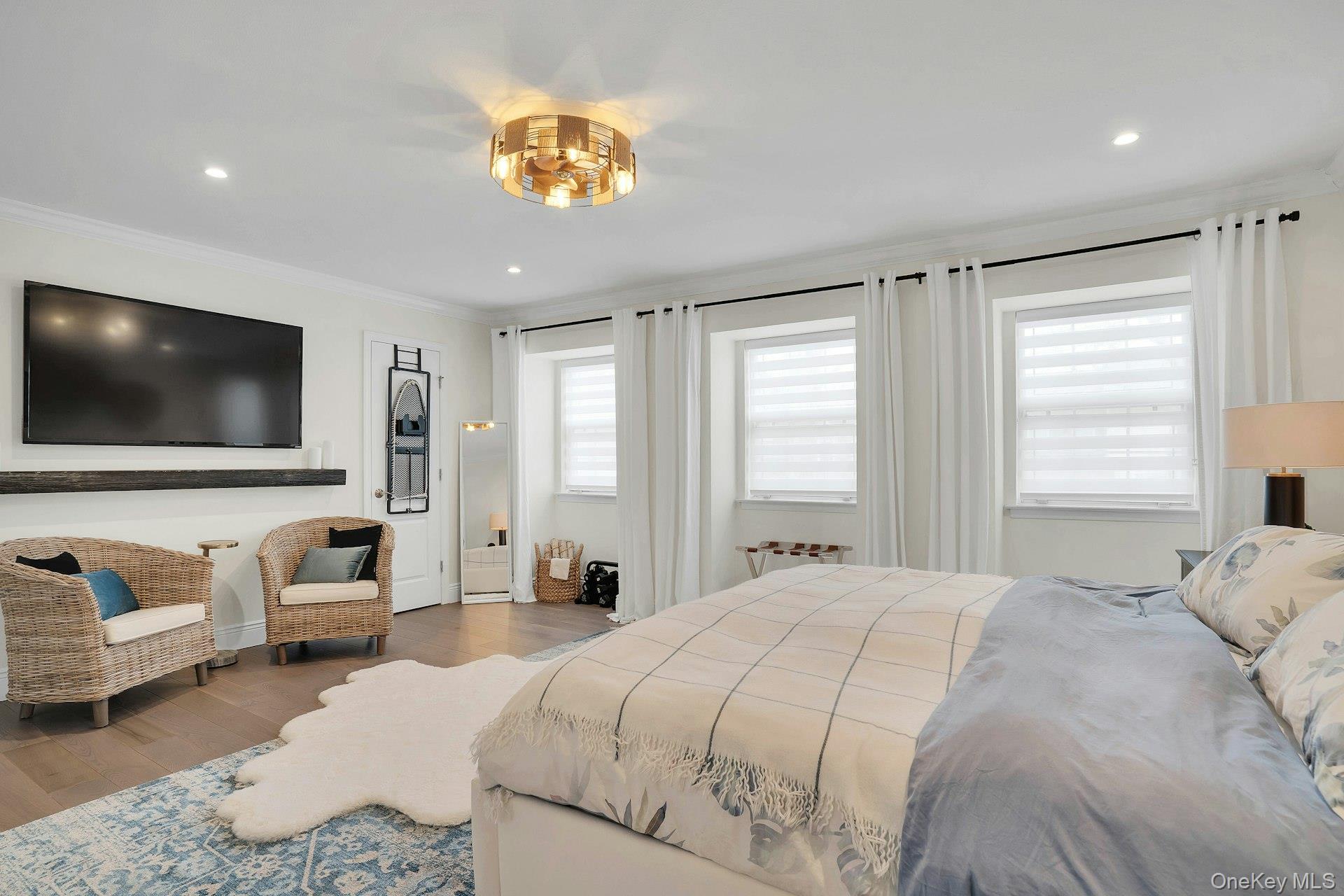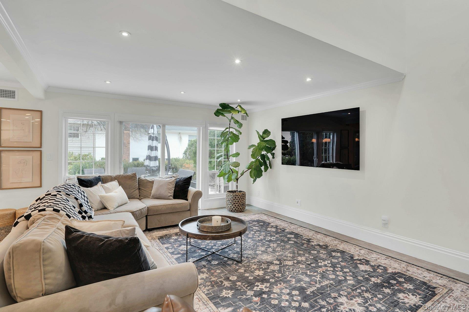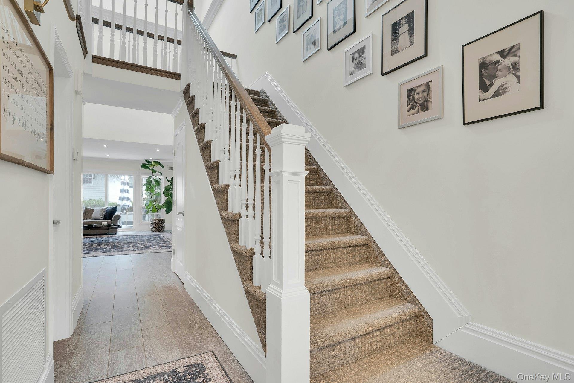 The home features a luxurious open floor plan highlighted by a renovated eat-in kitchen with quartzite countertops, designer tile backsplash, updated flooring, and LED lighting throughout. A first-floor full bath with shower adds convenience and flexibility for guests or extended living.