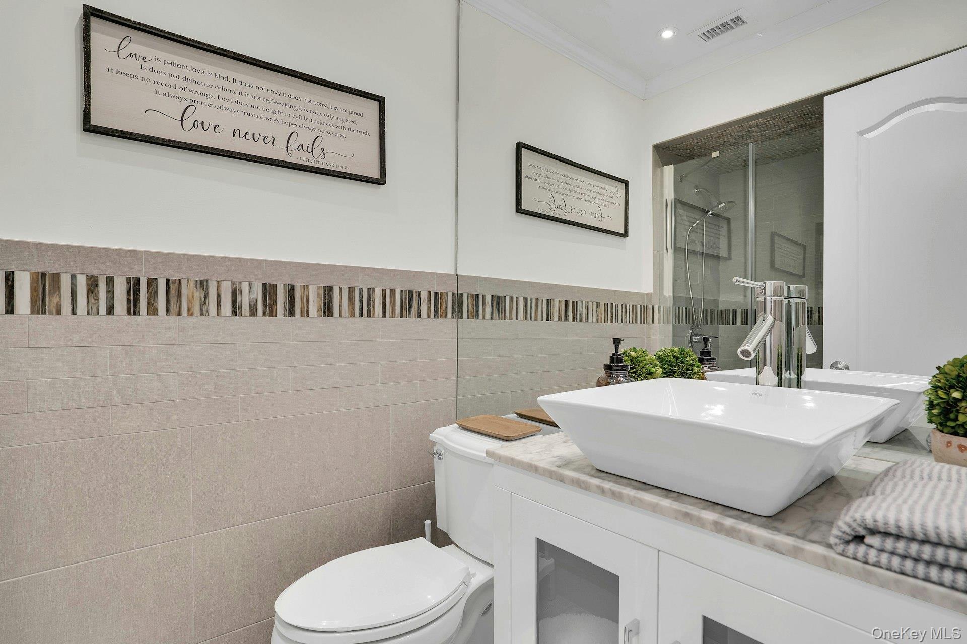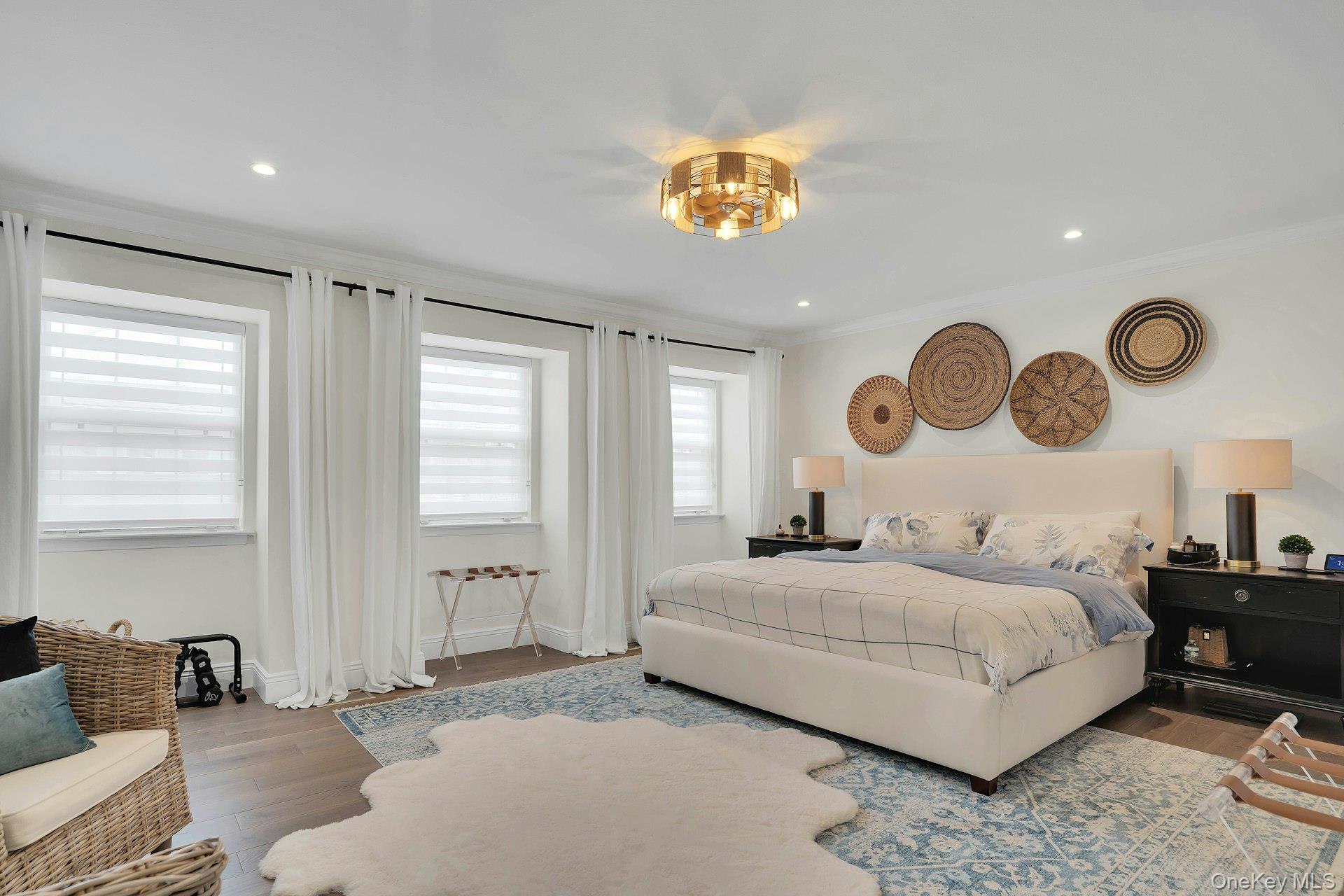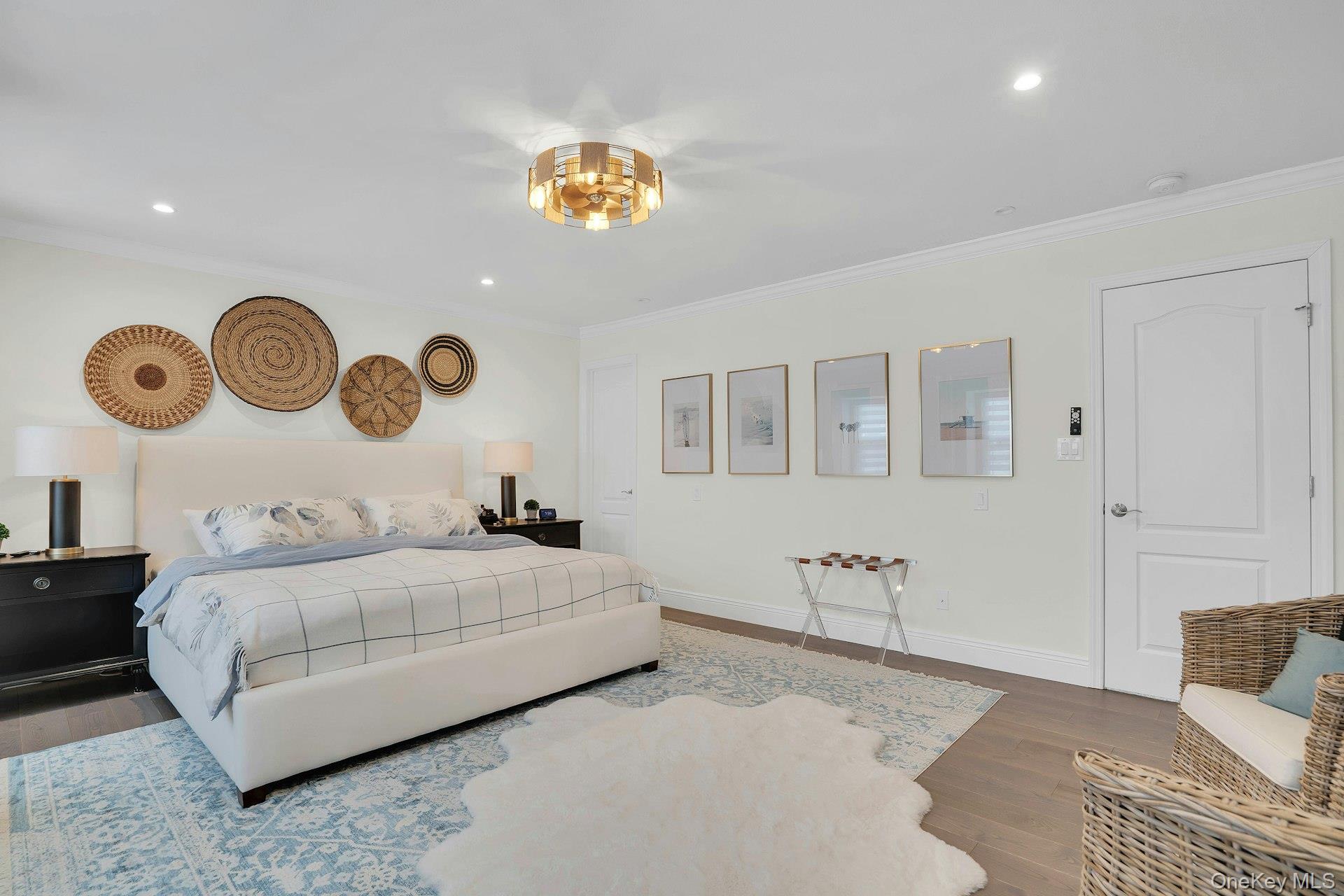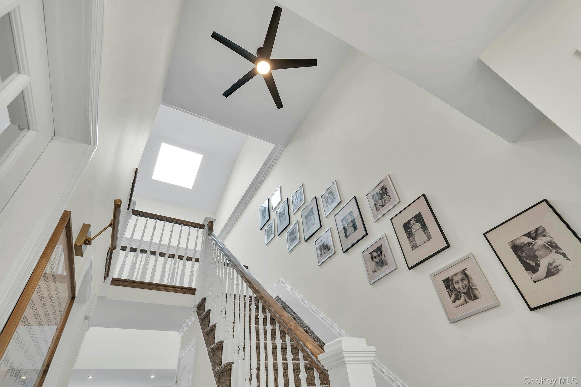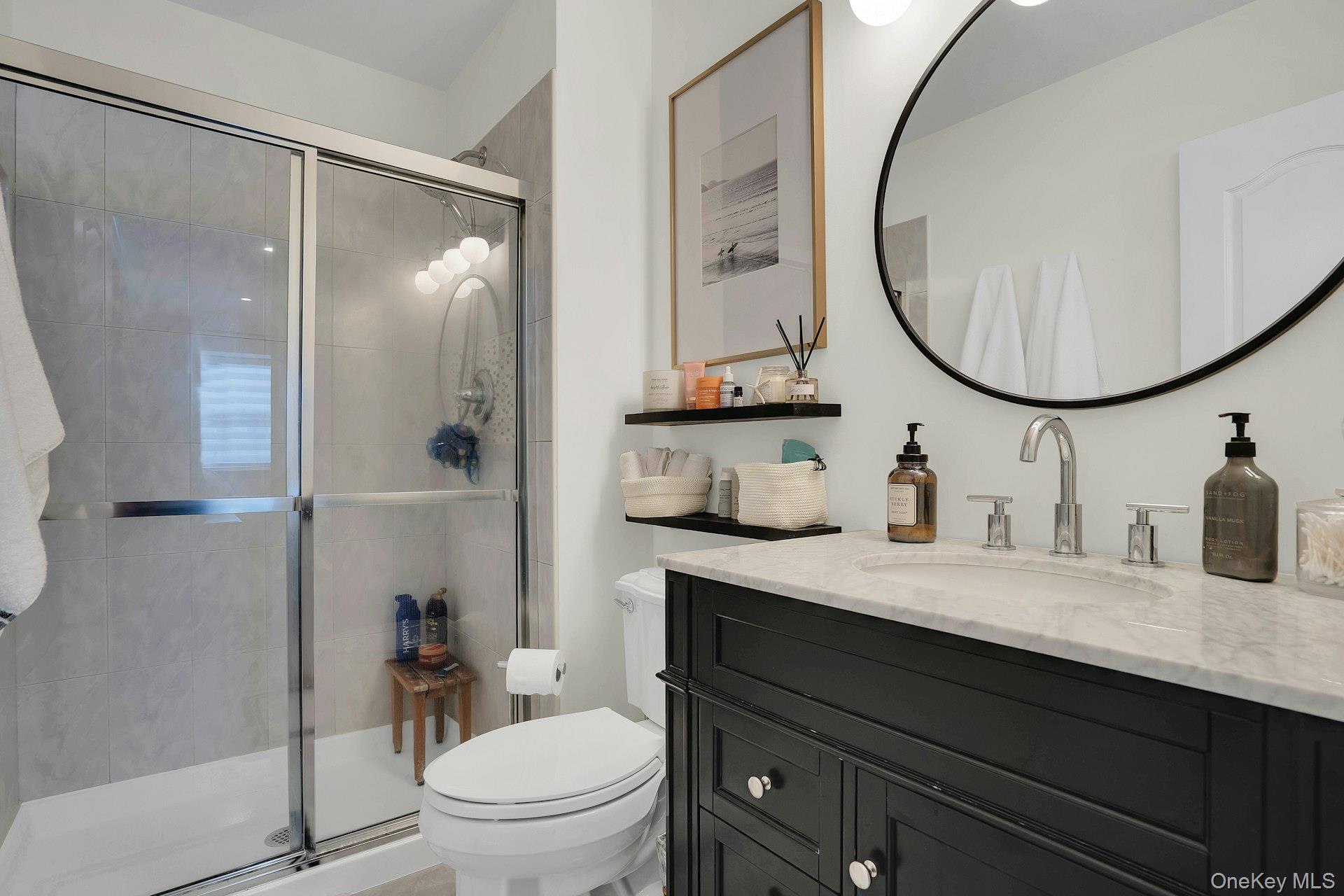 The home features a luxurious open floor plan highlighted by a renovated eat-in kitchen with quartzite countertops, designer tile backsplash, updated flooring, and LED lighting throughout. A first-floor full bath with shower adds convenience and flexibility for guests or extended living.