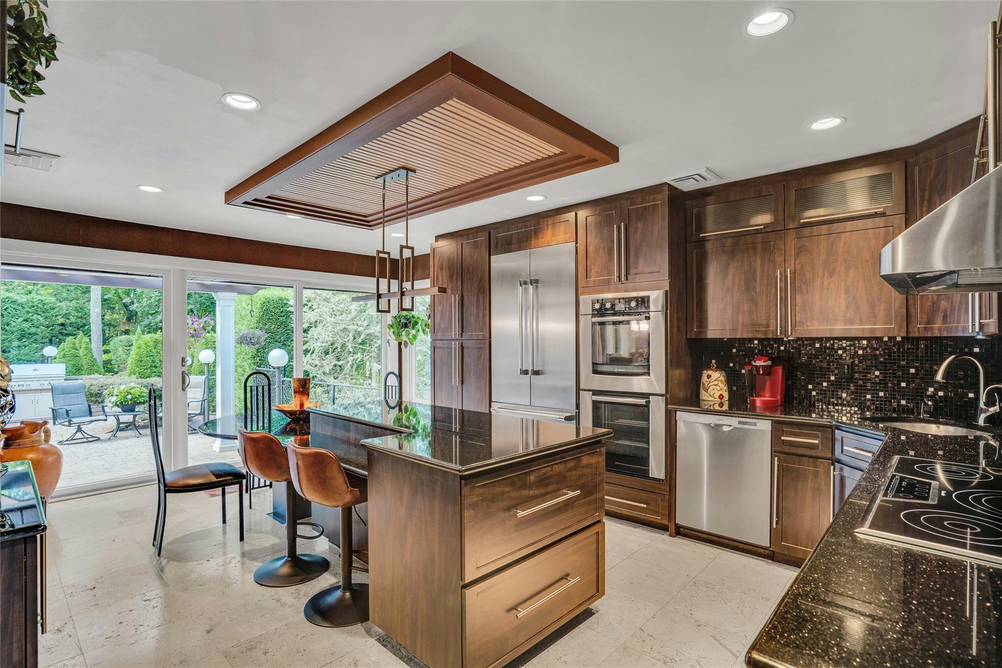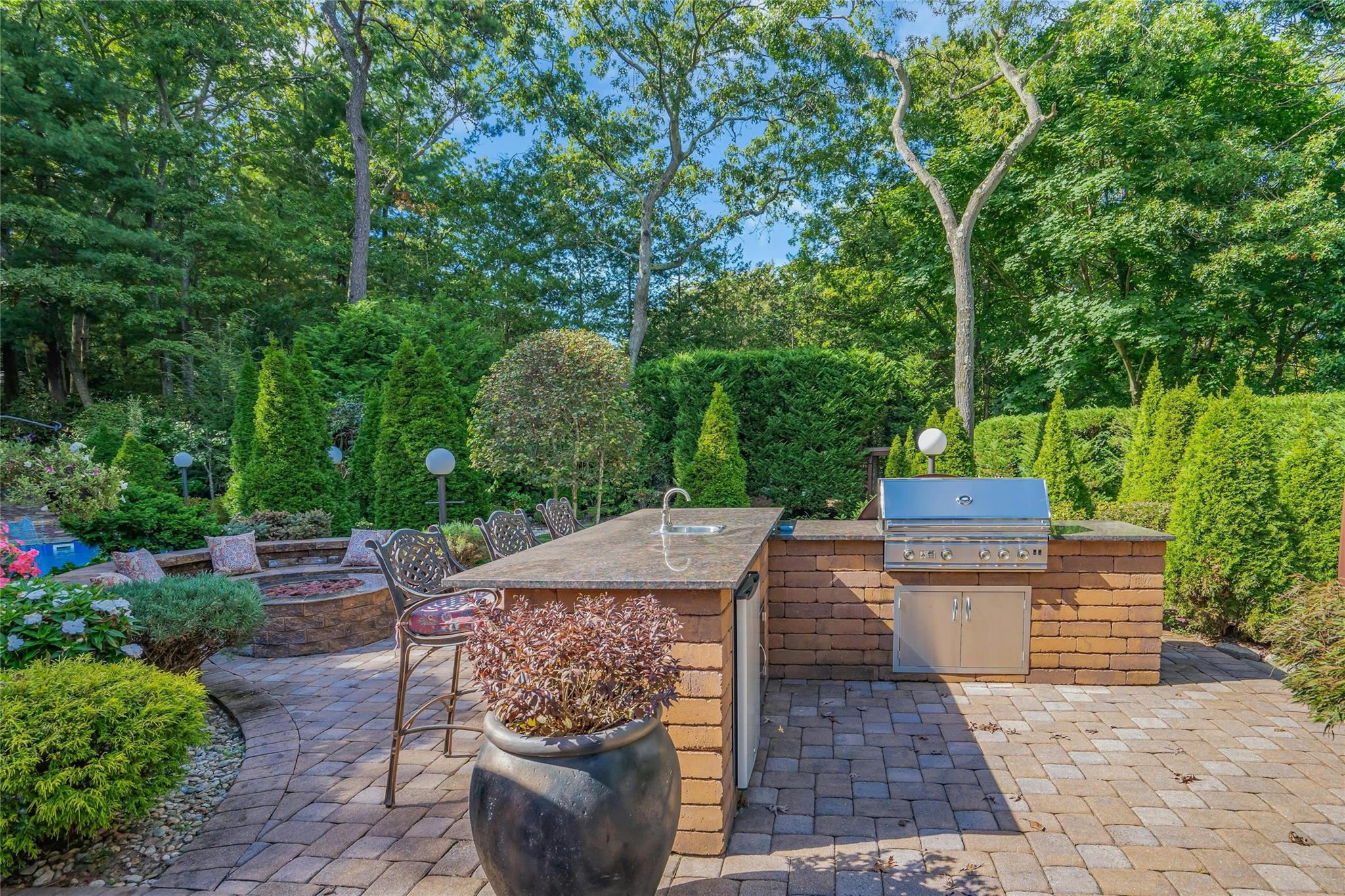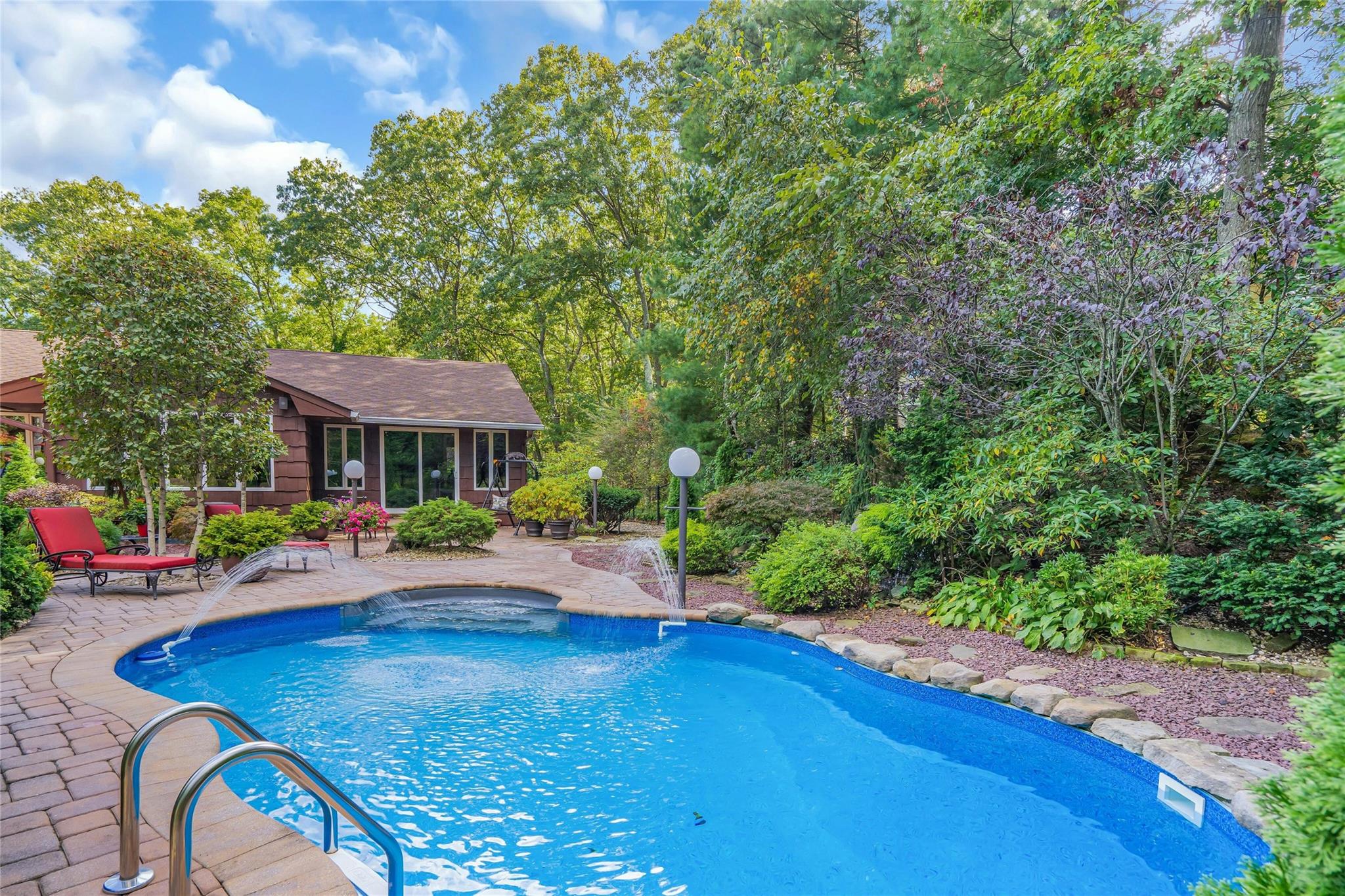 Fabulous ranch!!! Summer is coming and this oasis is waiting for YOU! Gorgeous home decorated and upgraded to perfection. Entry foyer features beautiful tile work and custom closet doors. Formal living room overlooks the yard and flows into the dining room for easy entertaining. The kitchen is state of the art with Bosch appliances and a Thermador refrigerator. Center island duets as a table for 4 with counter seating for 2. Very clever! The den features high ceilings and a natural gas fireplace with lots of windows all around!. True Primary Bedroom has wall of glass overlooking the pool and waterfalls while laying by the fireplace. Updated ensuite bath is a treat. The basement is a great space for entertaining. It is ground level from the garage and has a gym area, pool table and a great space for tools and wood working. There is an office space/4th bedroom with a full bath with an Outside Entrance from the driveway. The 2 car garage is neat and organized and ready for a sports car! Paradise is the only way to describe the backyard! There is an outdoor kitchen with a never used barbecue. After you have a few burgers, stroll on over to the fire pit and roast some marshmallows:) The salt-water heated (by natural gas) pool (features 2 waterfalls and a couple of sprays. The gardens are mature and have full grown arborvitae for privacy. CAC 1.5 yrs, CVAC with hose in the wall, 200 AMP, Washer and Dryer 2 yrs, Cesspool cleaned last year - no issues, Boiler, Pool 8 yrs,; Pool Liner 3 yrs, Filter 7 years, Heated Driveway, Whole House Generator 2yrs, Roof 10 yrs. Laurel Drive Park is down the street and has a tennis court, basketball court, handball court, and a playground., COME AND GET IT!
