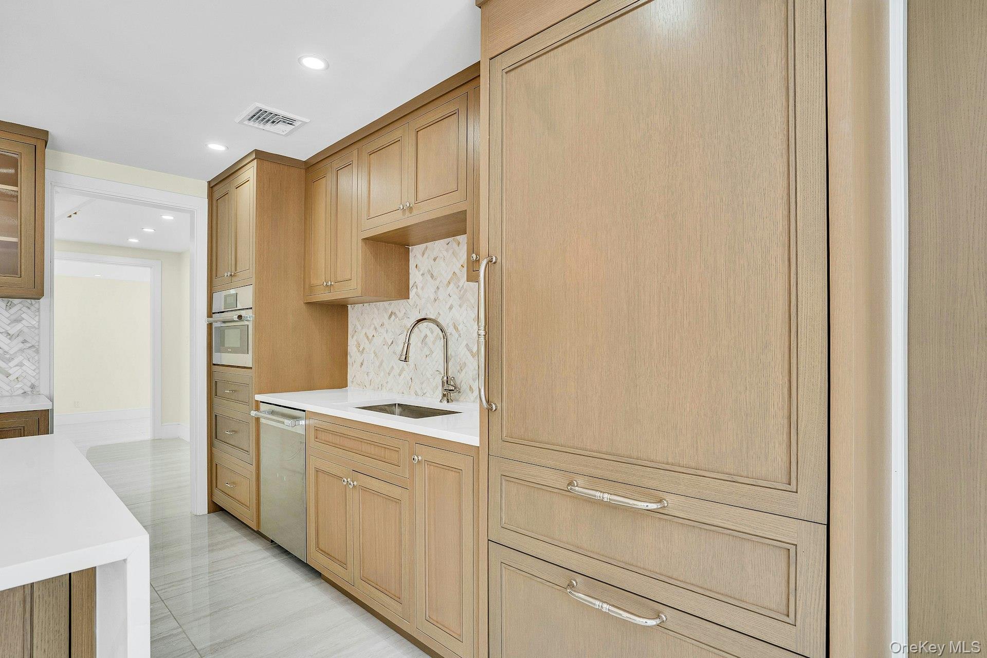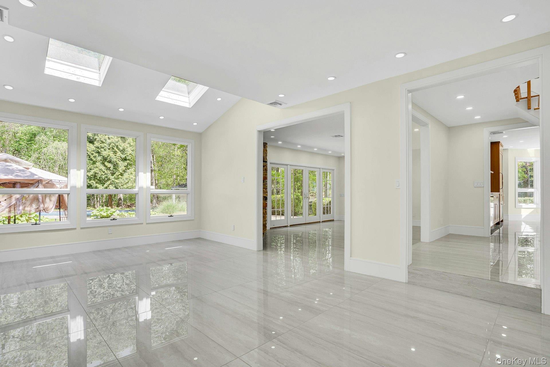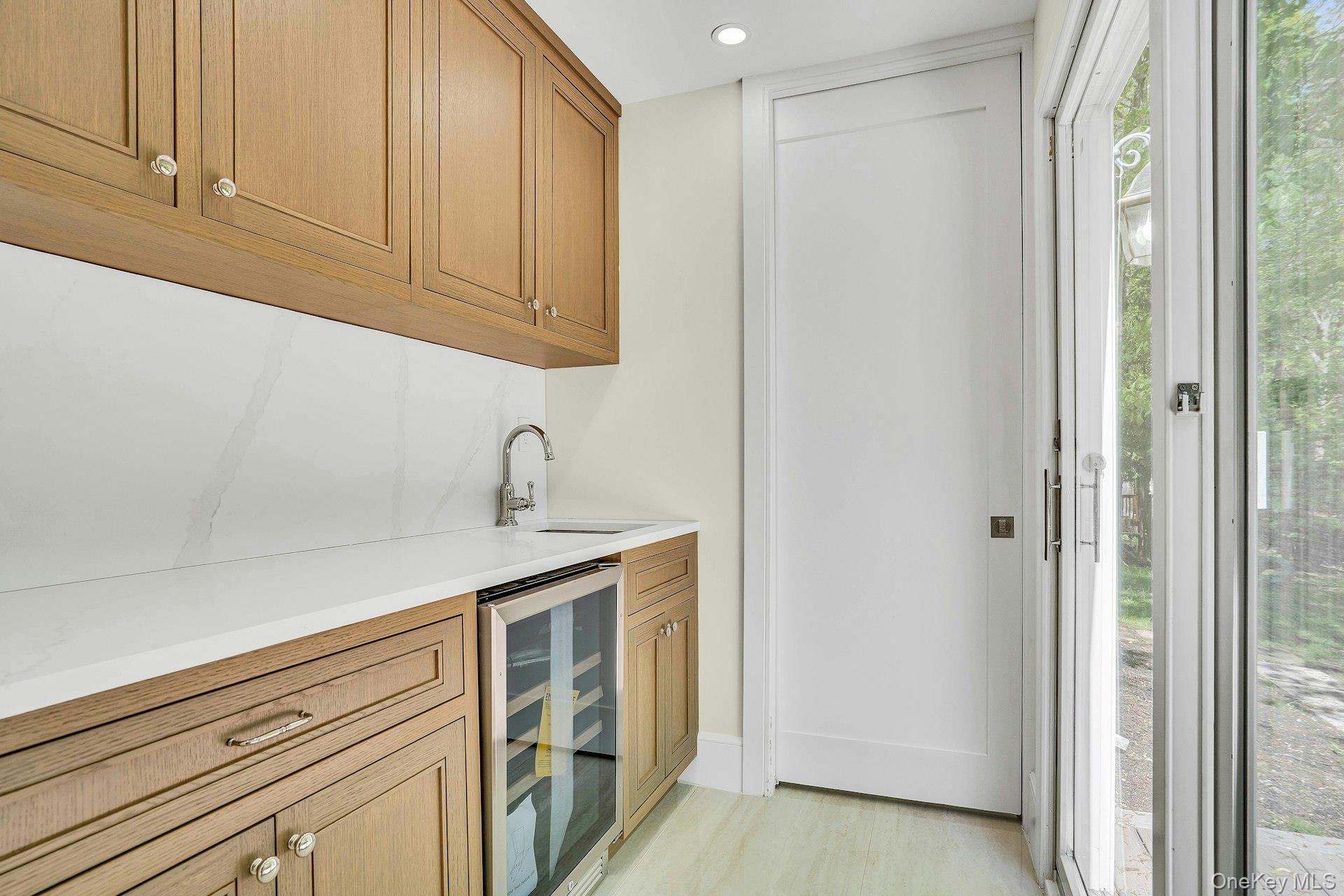The interior features porcelain tile flooring, custom white oak accents, and a bright layout. The kitchen is equipped with custom cabinetry, quartz countertops, a large center island, and a Thermador appliance package approximately one (1) year old, including a paneled refrigerator and pot filler. A butler's pantry with wine refrigerator opens to a Trex side deck.