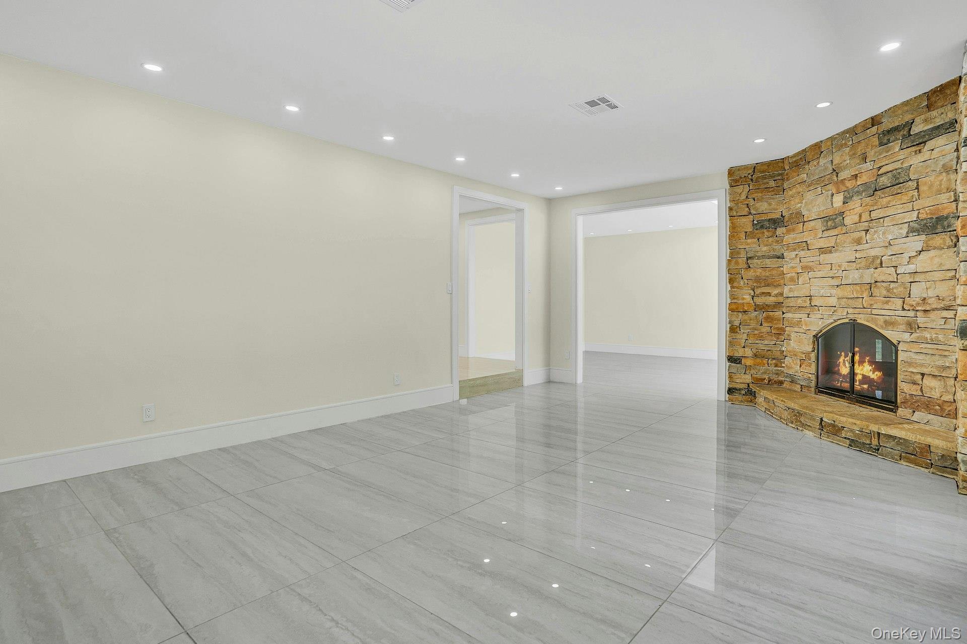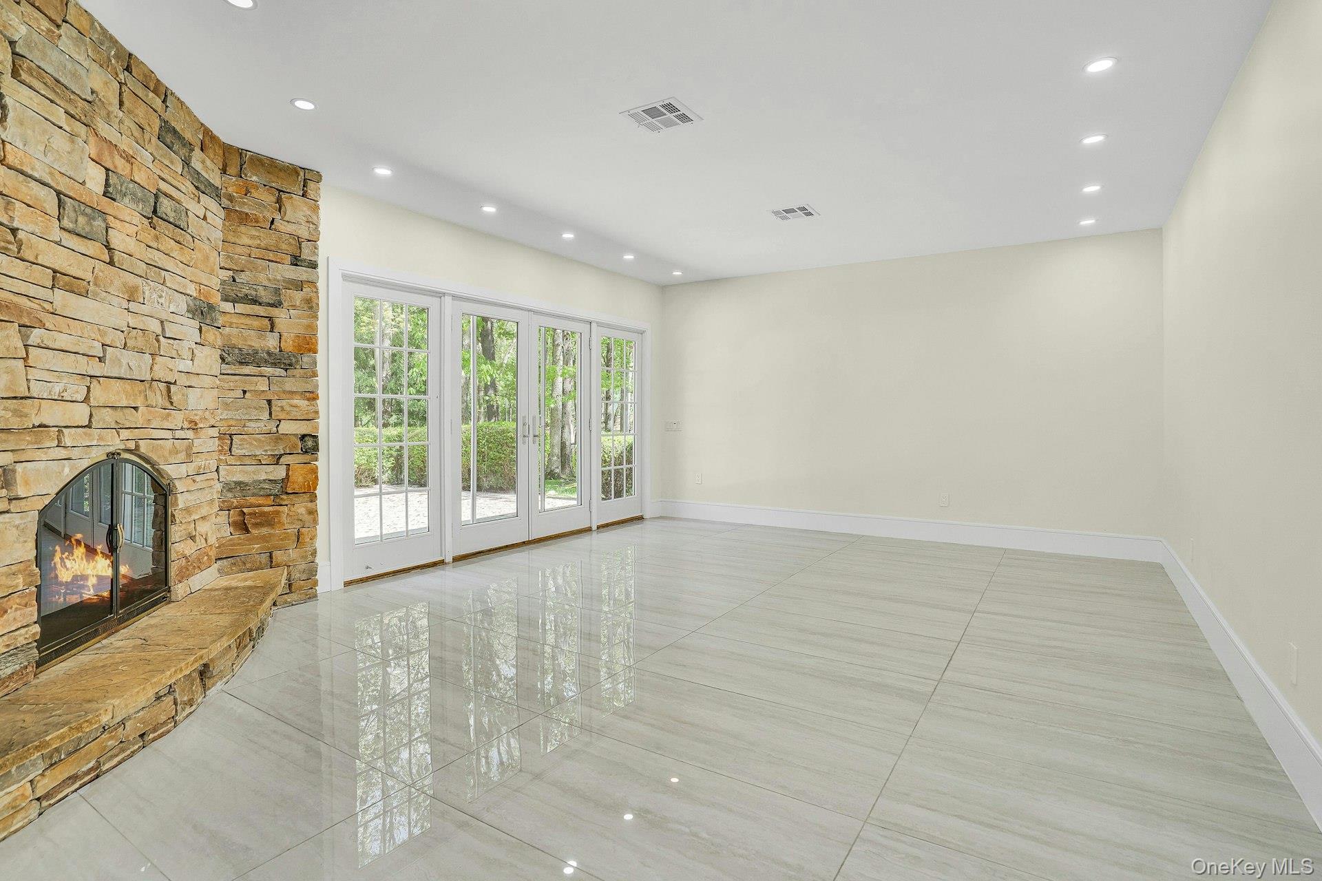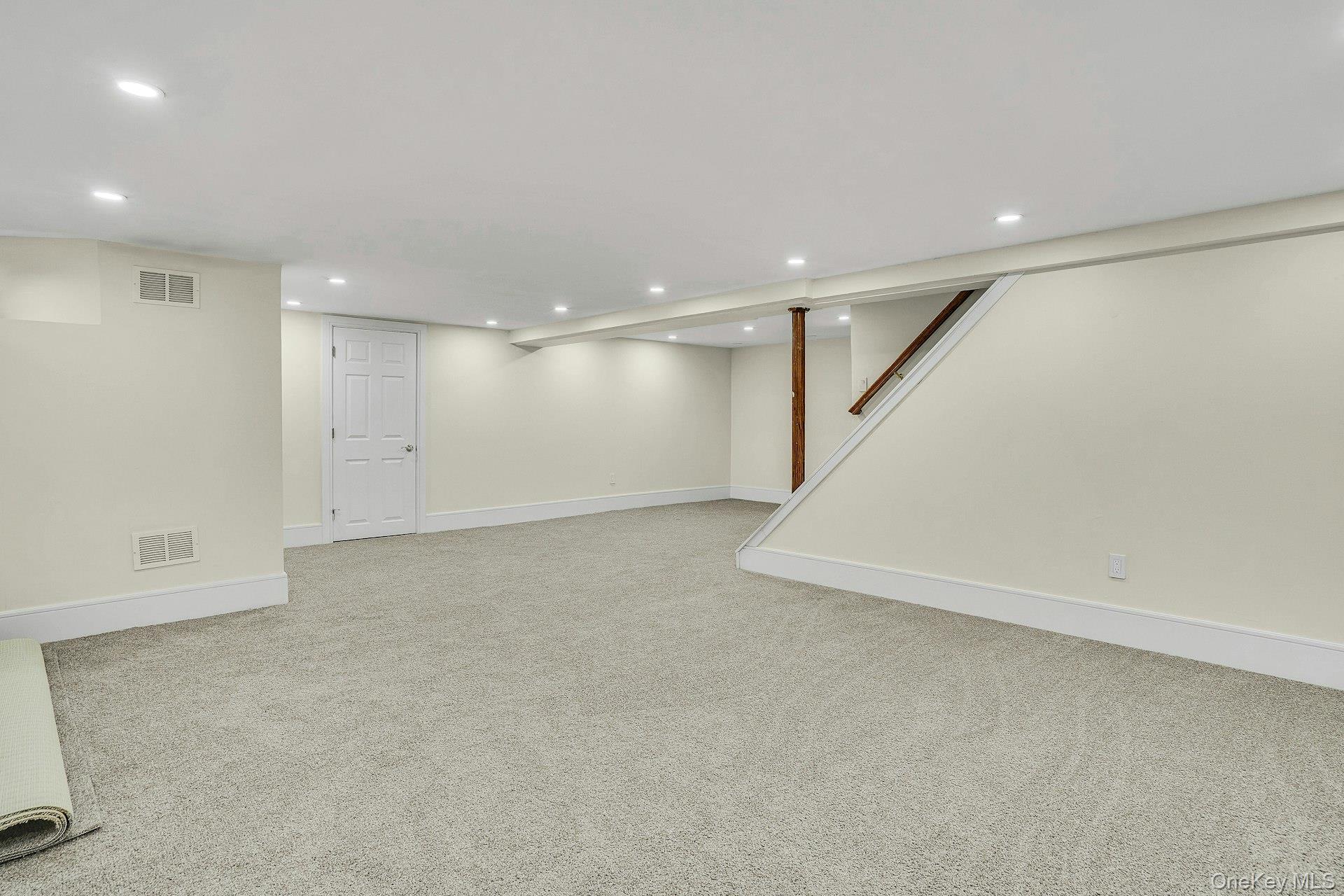 The rear den includes a wall of glass doors, a stone fireplace, and backyard views. The finished basement provides additional living space with new carpeting and recessed lighting and may be suitable for a variety of uses.