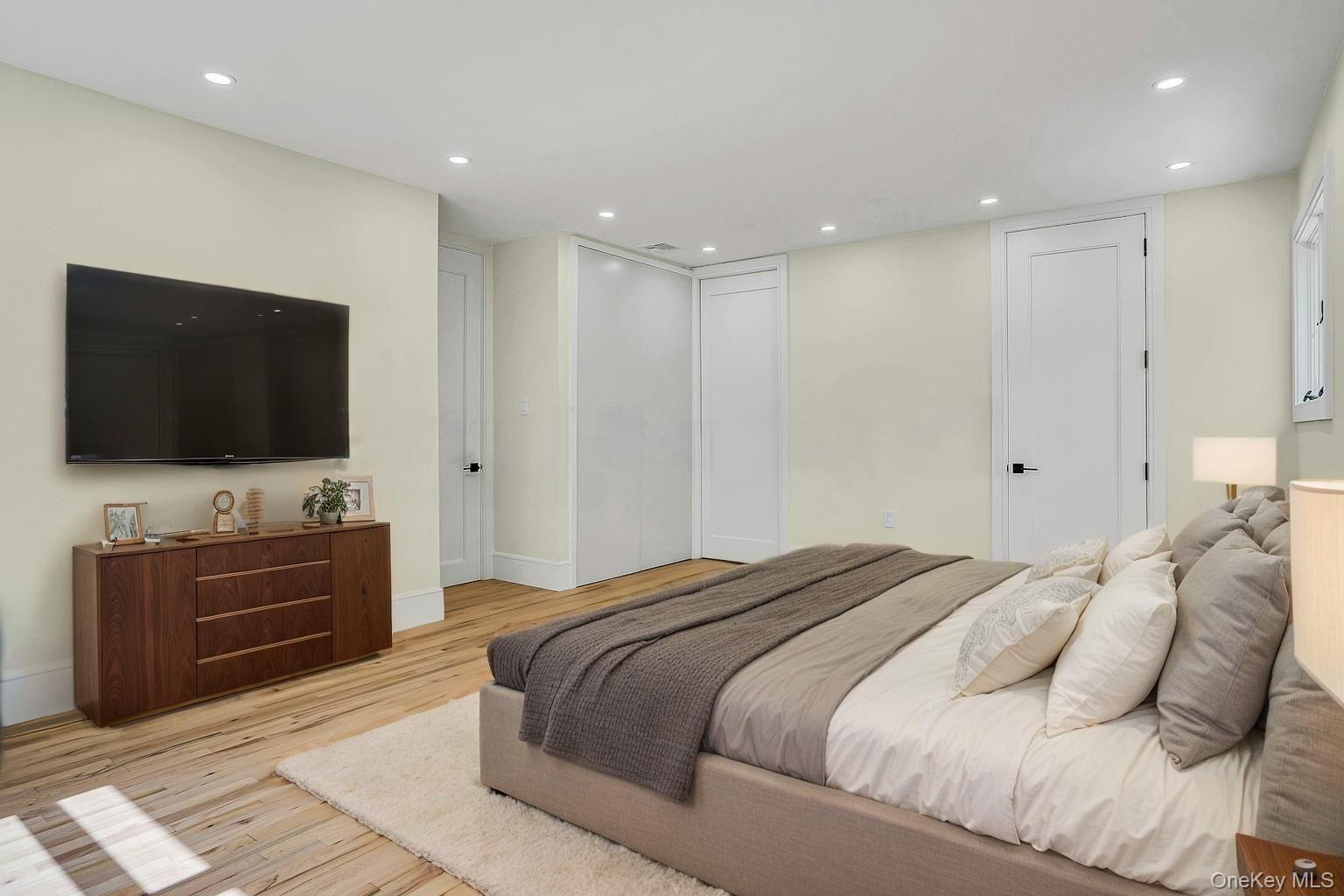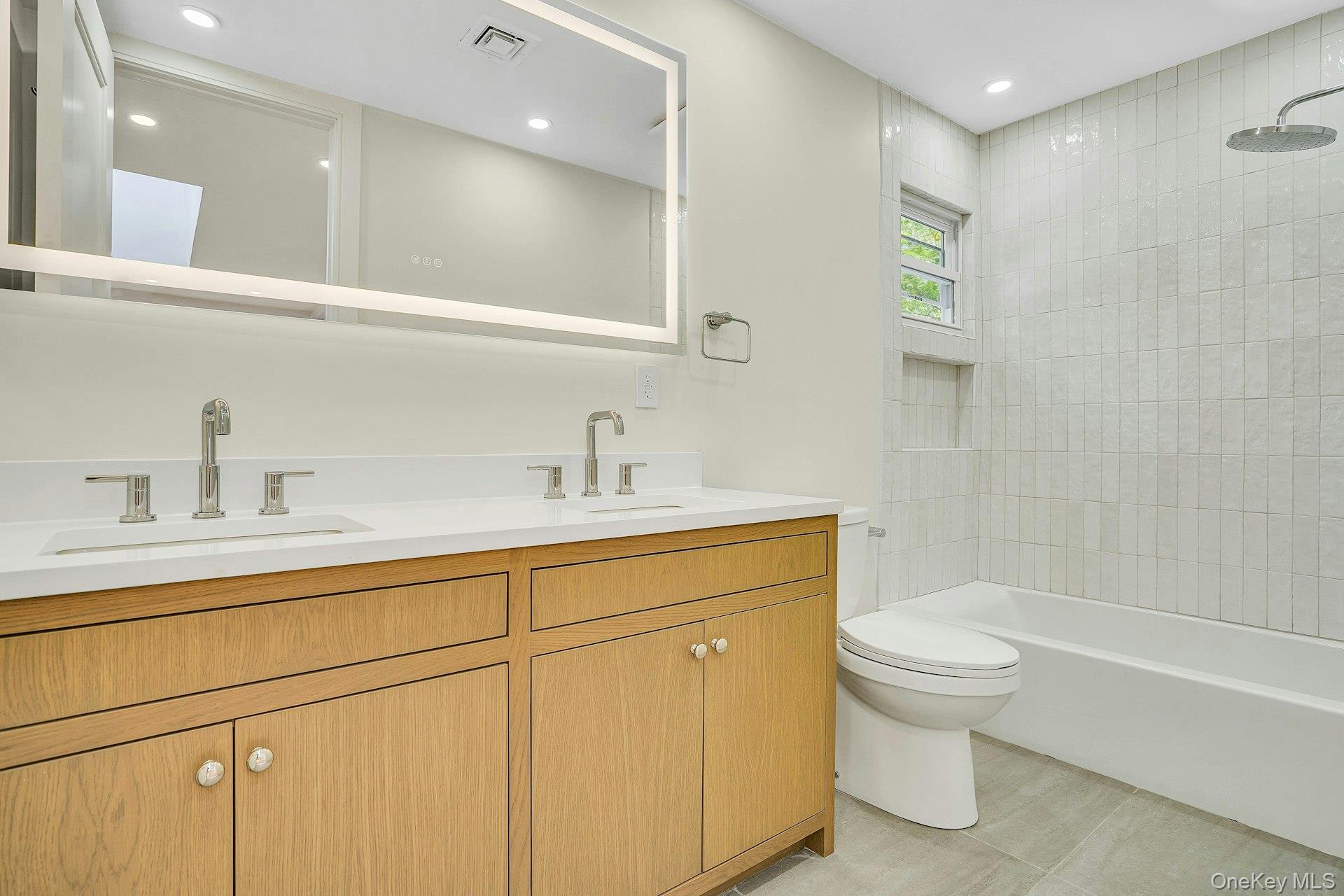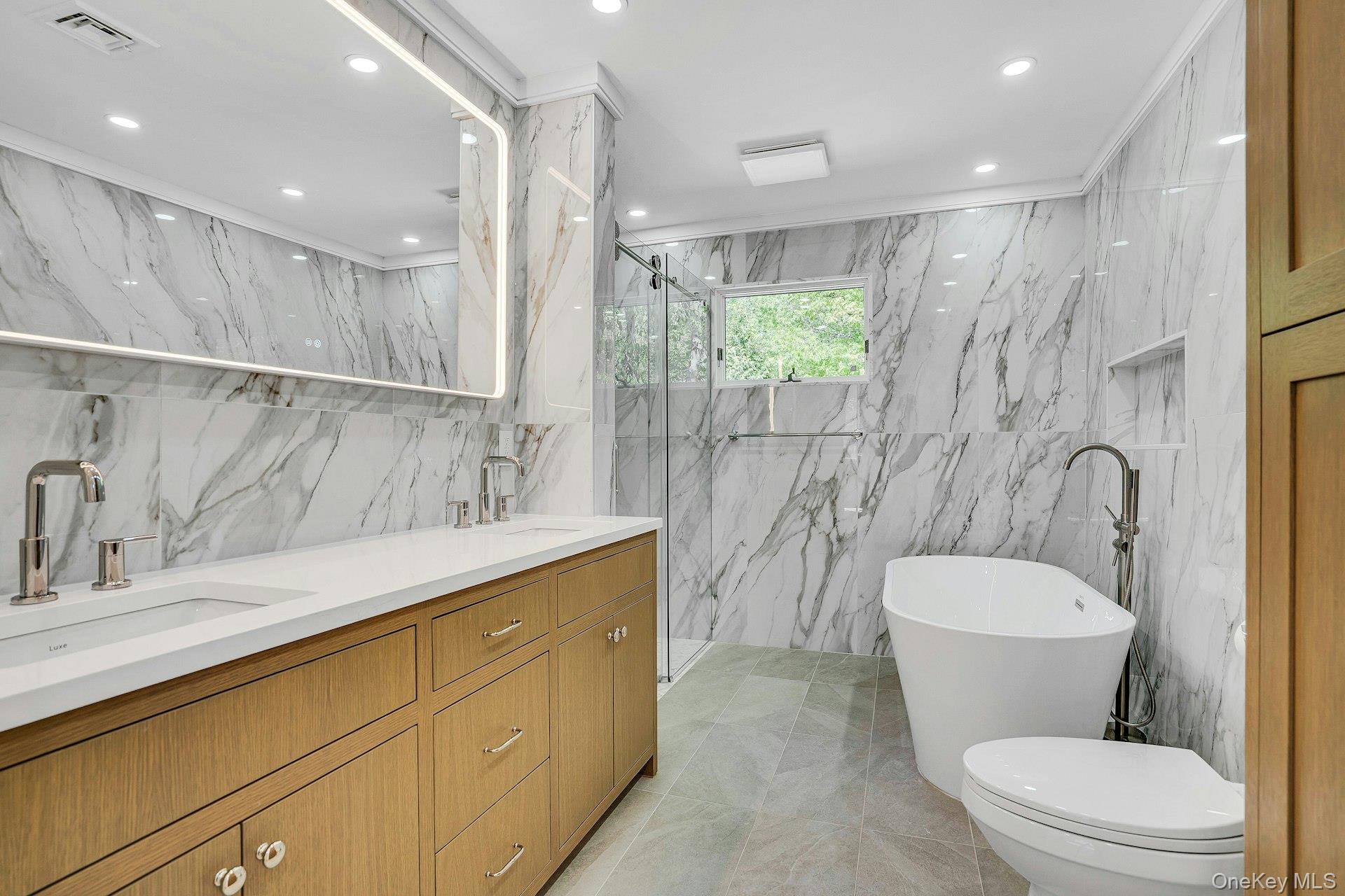 Upstairs are four bedrooms with hardwood floors, recessed lighting, and custom closets. The primary bedroom includes a walk-in closet and a bathroom with dual vanities, soaking tub, and glass-enclosed shower. A second full bathroom upstairs also features double sinks.