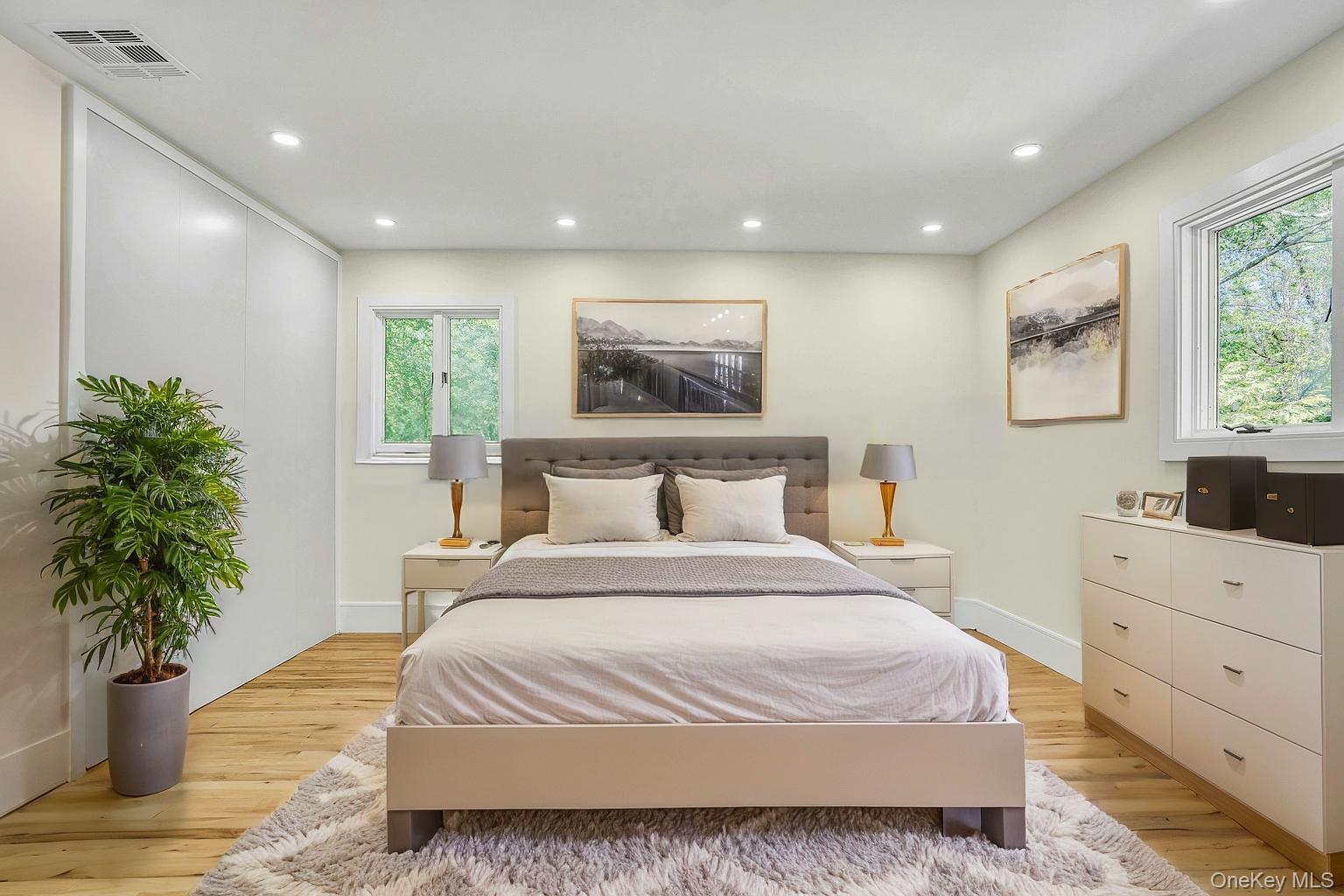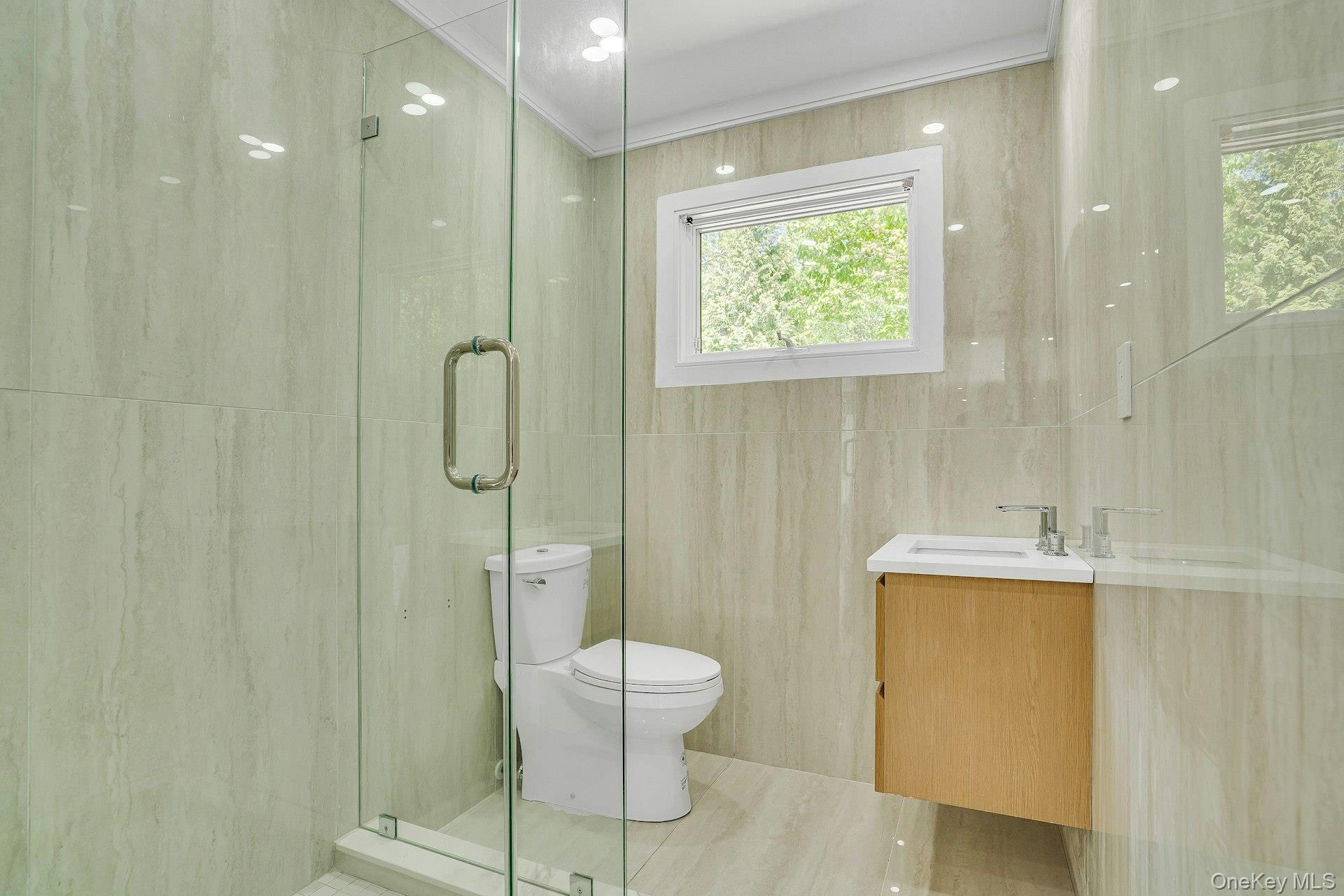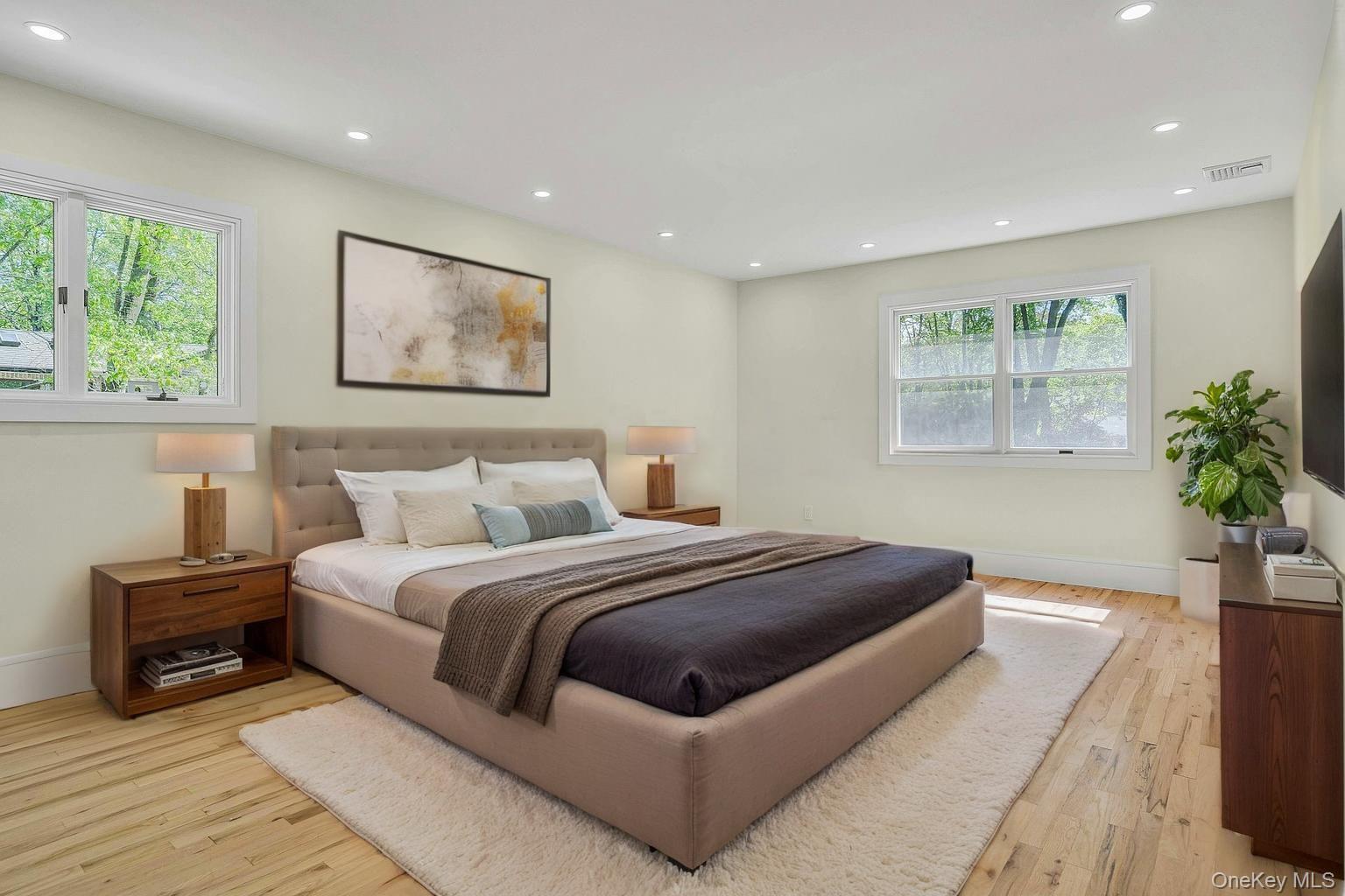 Upstairs are four bedrooms with hardwood floors, recessed lighting, and custom closets. The primary bedroom includes a walk-in closet and a bathroom with dual vanities, soaking tub, and glass-enclosed shower. A second full bathroom upstairs also features double sinks.