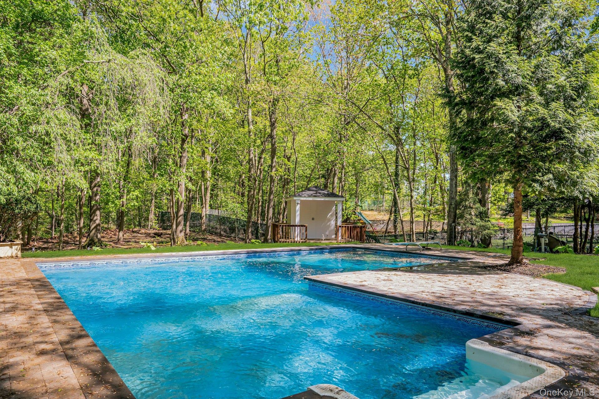 Outdoor amenities include an in-ground heated pool, paver patio, powered pool house, and wooded surroundings. Additional features include a two-car garage, central air conditioning, electric heat pump system, baseboard heating, and 200-amp electrical service. Convenient access to shopping, golf courses, ice rink, LIRR stations, and major roadways.