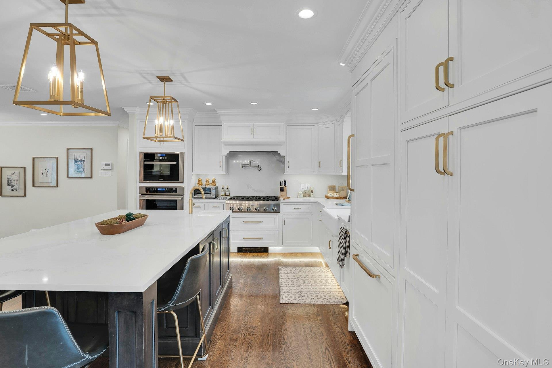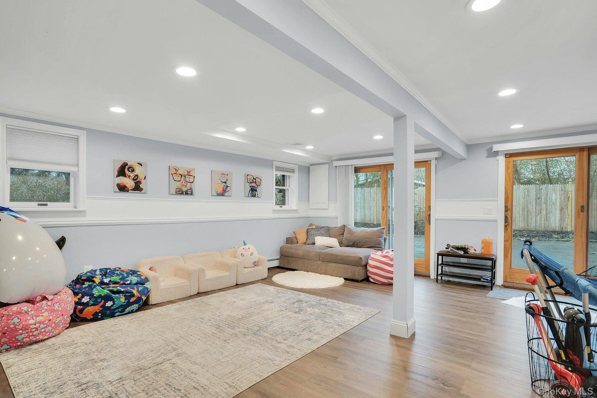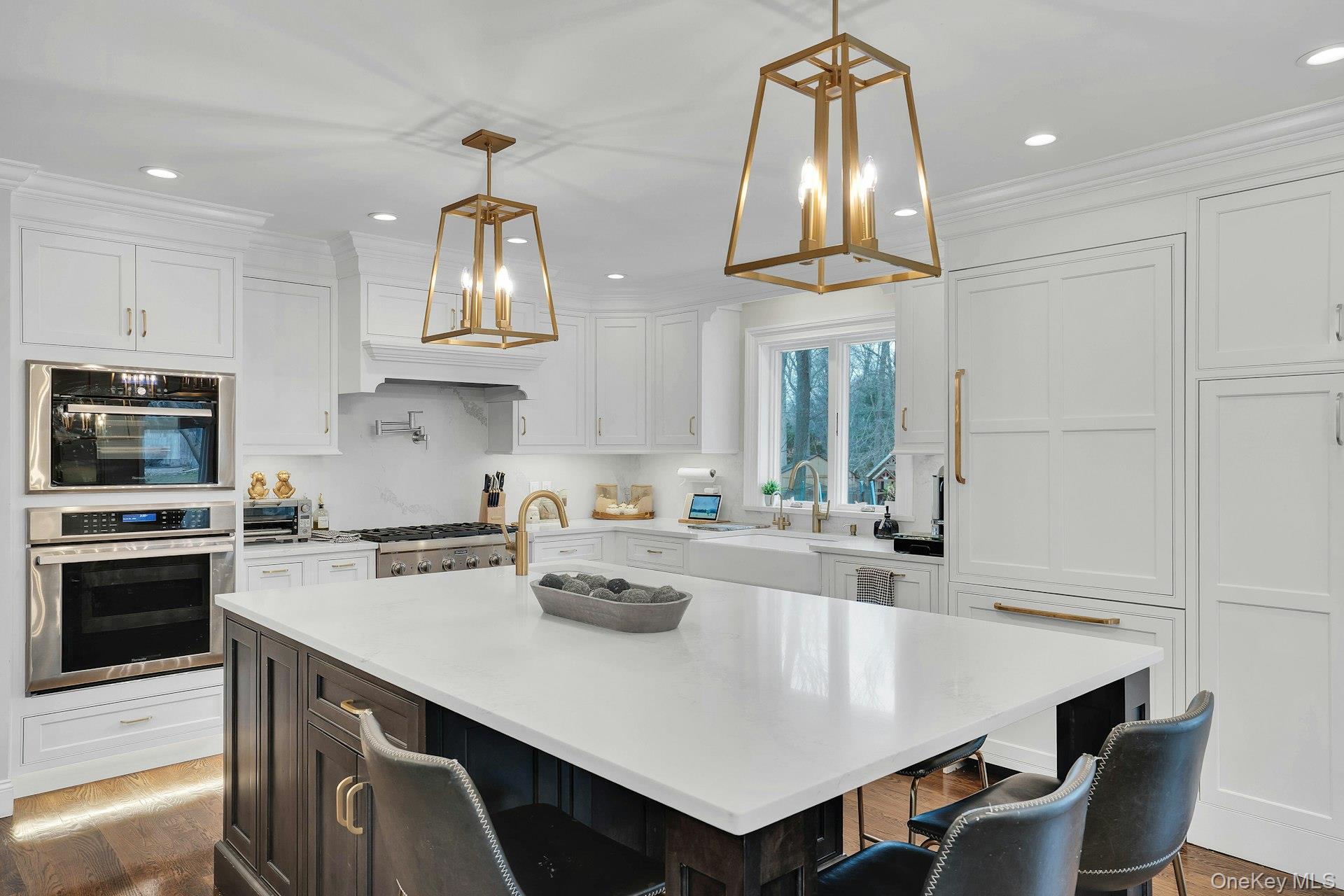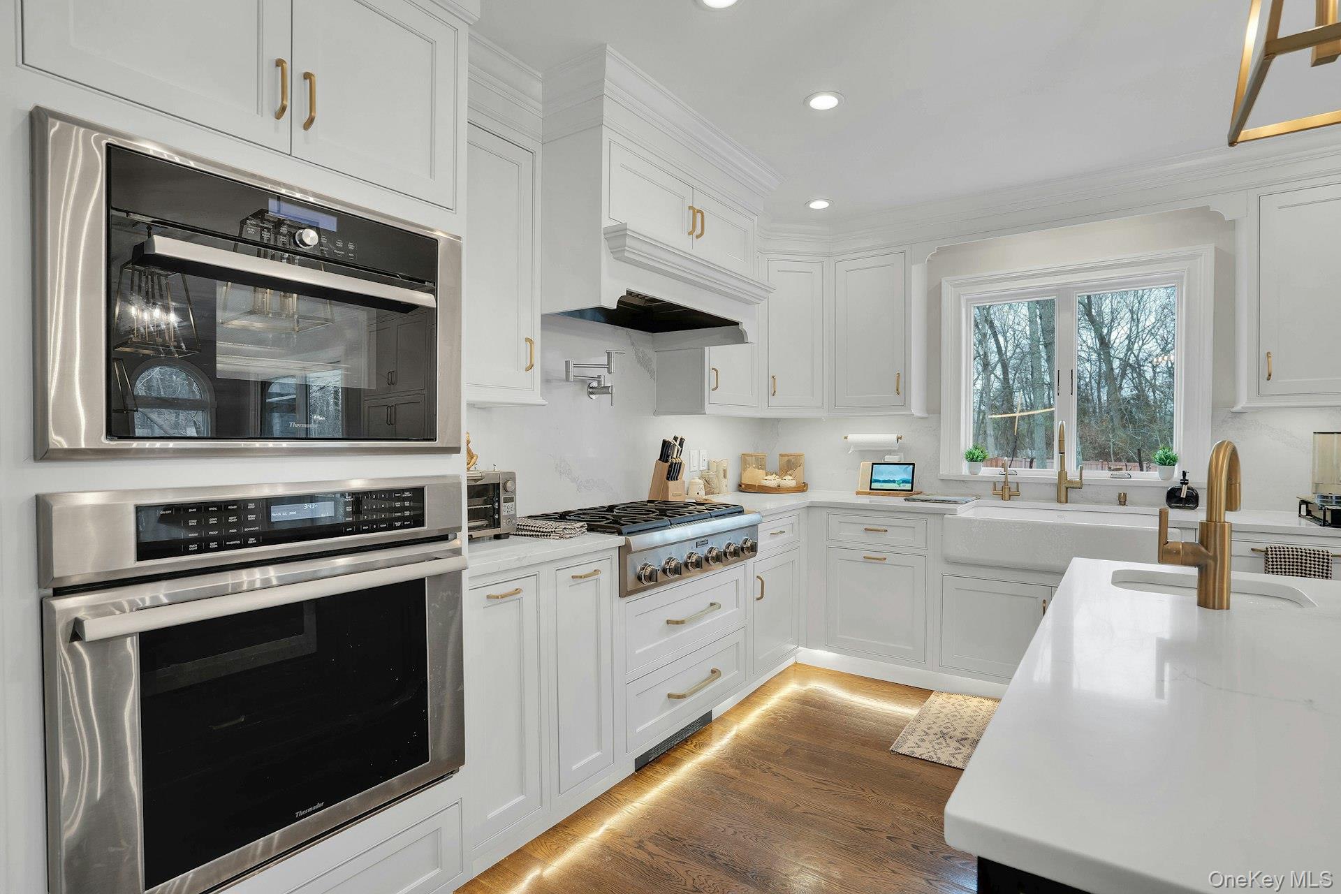 This 5-bedroom, 3 full bathroom home offers a flexible layout with room for extended living and entertaining. The upper level features oak hardwood flooring throughout, an updated custom kitchen with inset cabinetry, paneled refrigerator and dishwasher, and Thermador appliances, flowing into the main living and dining areas. The primary bedroom has been recently refreshed, and the bathrooms have been updated, including a main bath with double sink vanity. Detailed molding work can be found throughout the home.