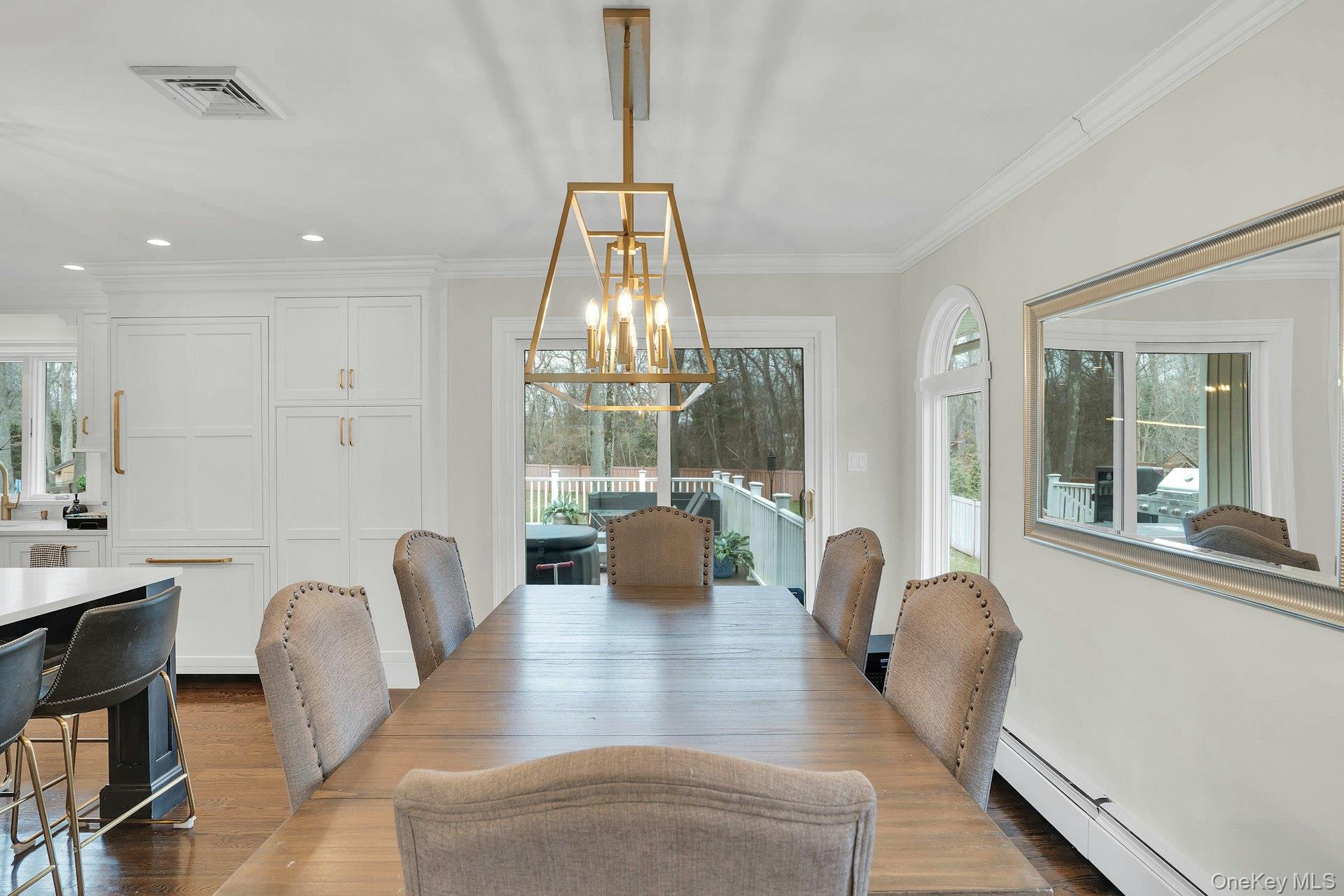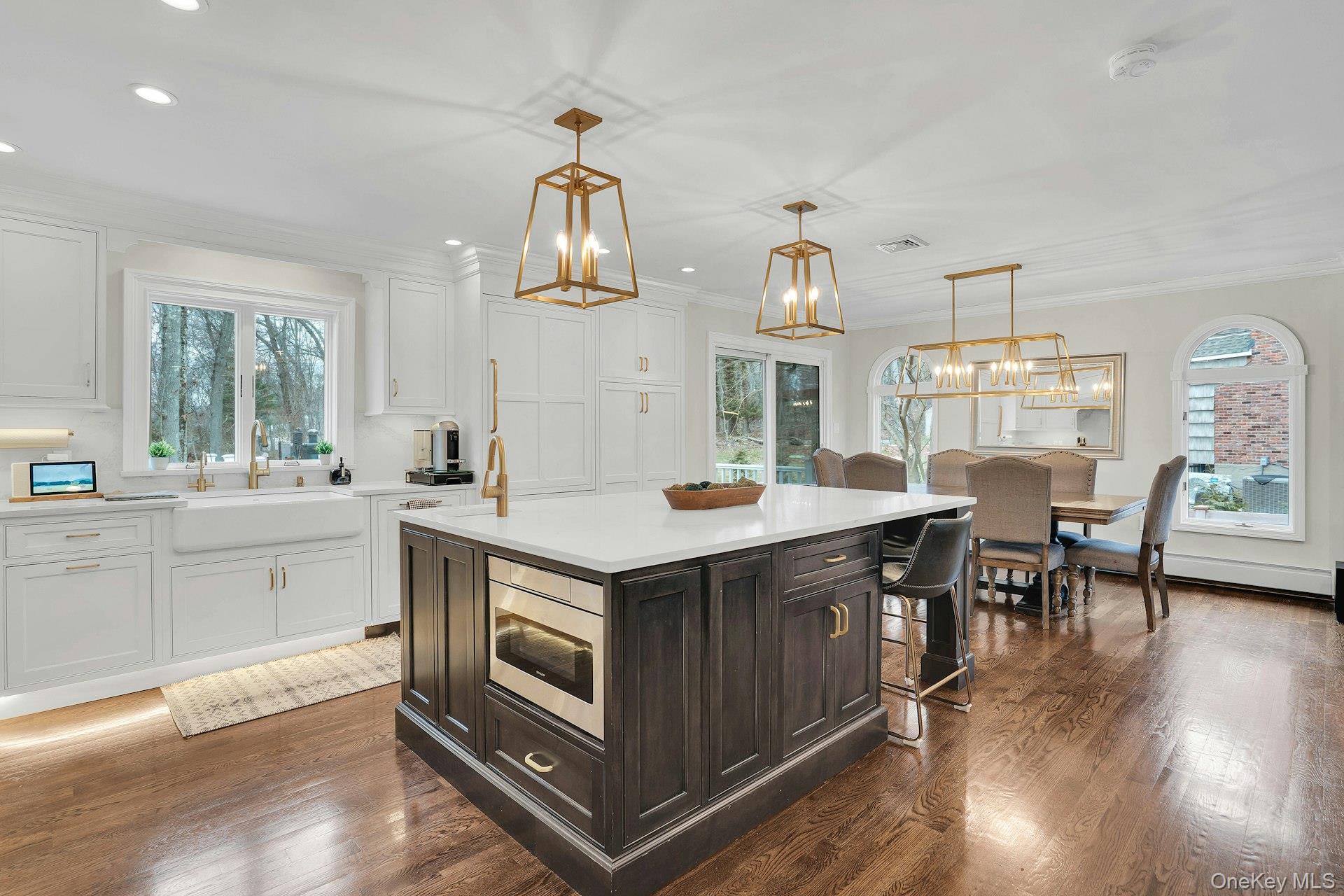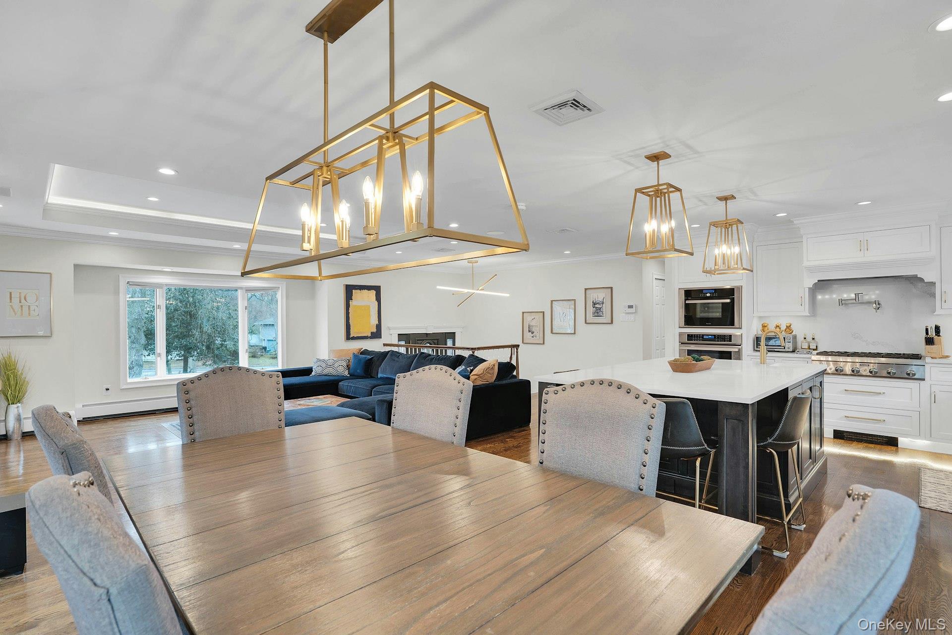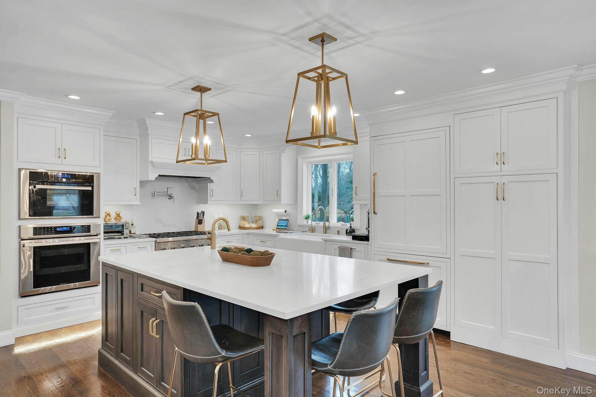 This 5-bedroom, 3 full bathroom home offers a flexible layout with room for extended living and entertaining. The upper level features oak hardwood flooring throughout, an updated custom kitchen with inset cabinetry, paneled refrigerator and dishwasher, and Thermador appliances, flowing into the main living and dining areas. The primary bedroom has been recently refreshed, and the bathrooms have been updated, including a main bath with double sink vanity. Detailed molding work can be found throughout the home.