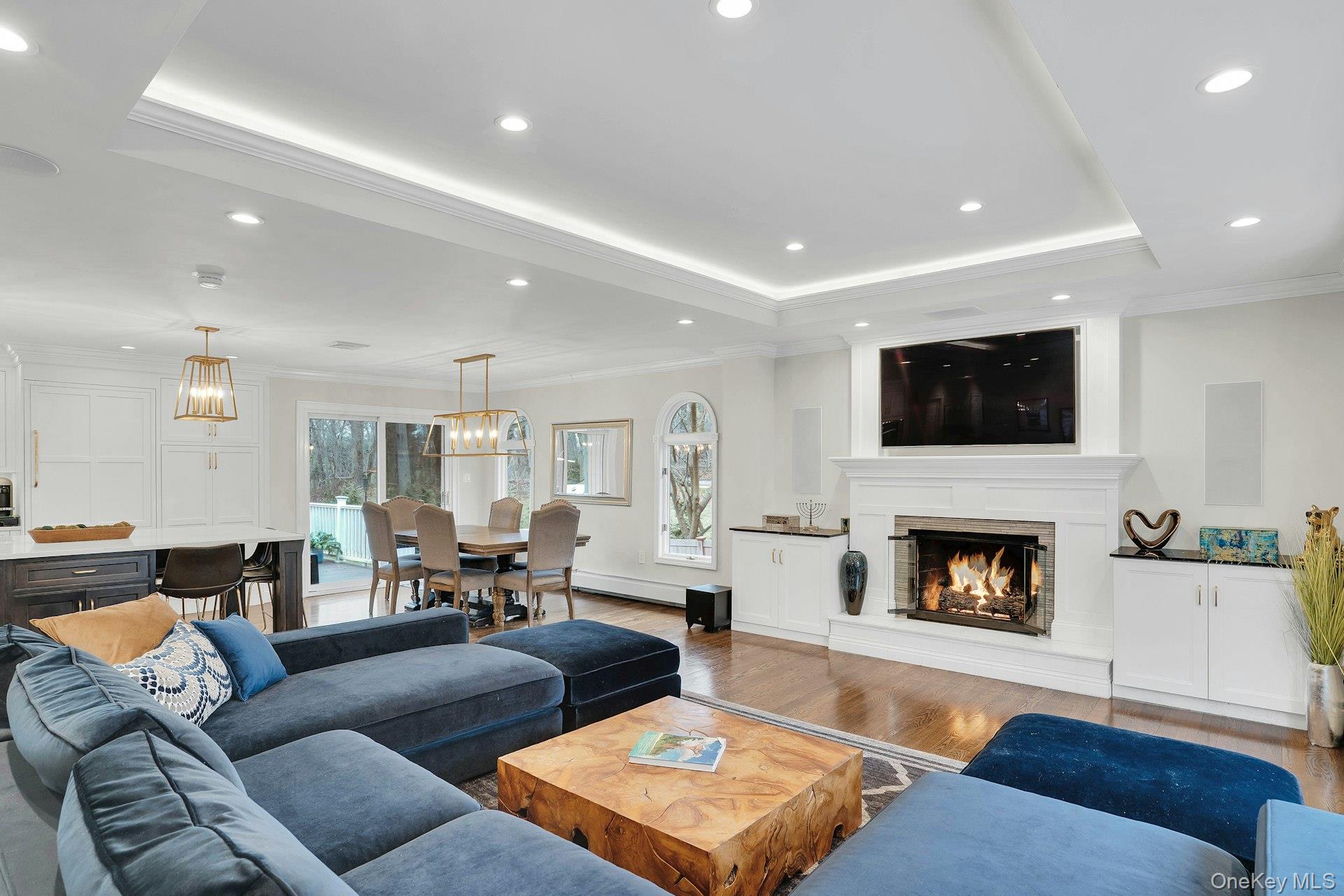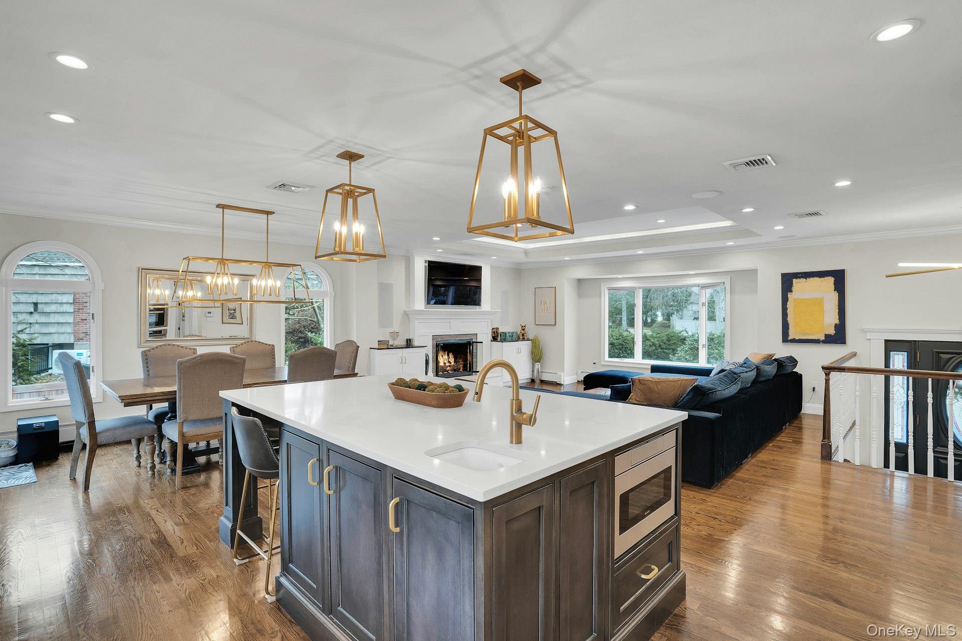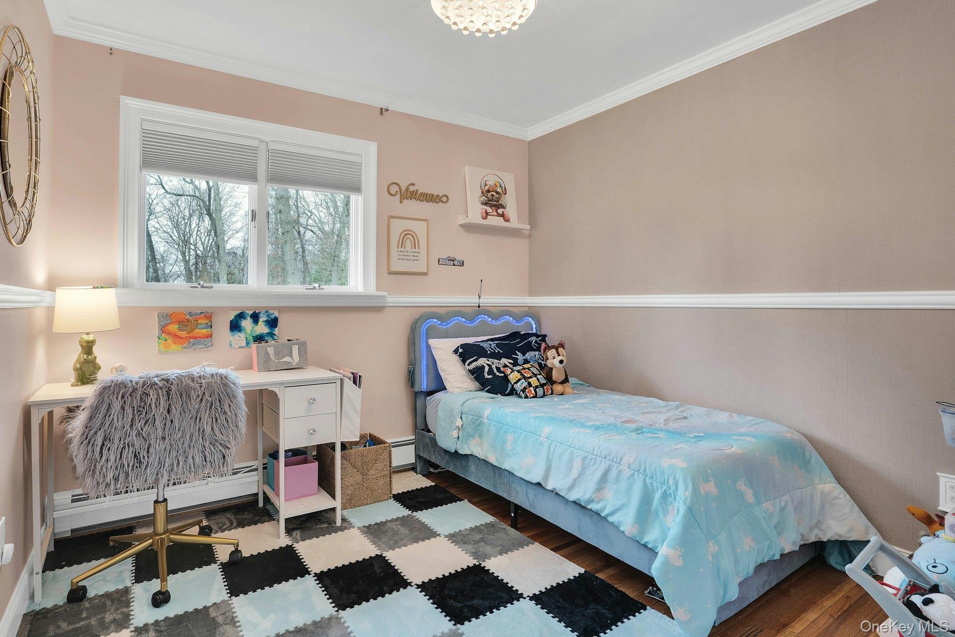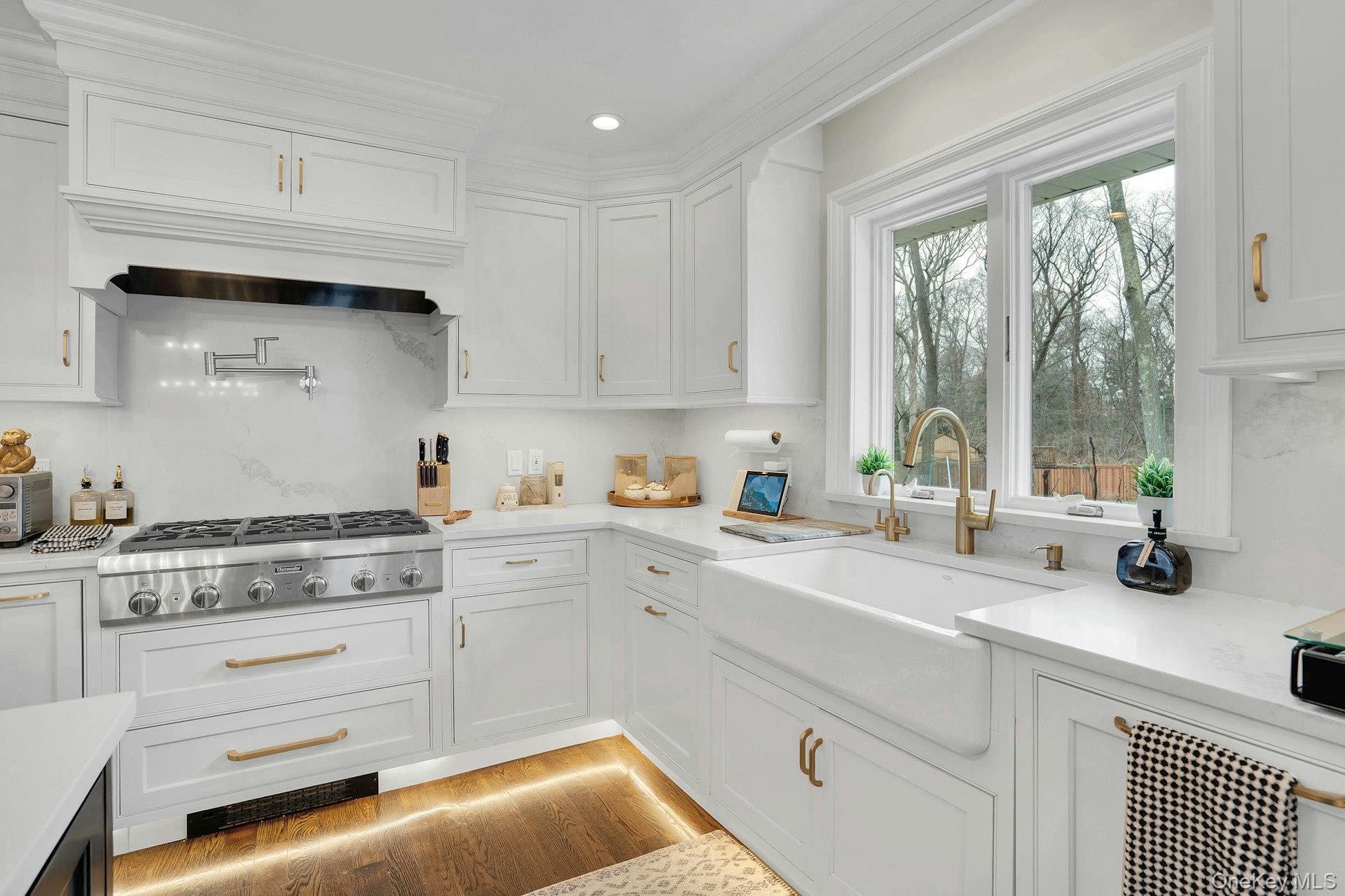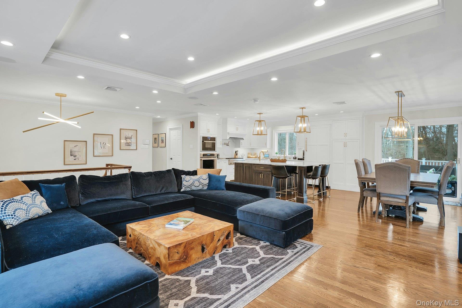 This 5-bedroom, 3 full bathroom home offers a flexible layout with room for extended living and entertaining. The upper level features oak hardwood flooring throughout, an updated custom kitchen with inset cabinetry, paneled refrigerator and dishwasher, and Thermador appliances, flowing into the main living and dining areas. The primary bedroom has been recently refreshed, and the bathrooms have been updated, including a main bath with double sink vanity. Detailed molding work can be found throughout the home.