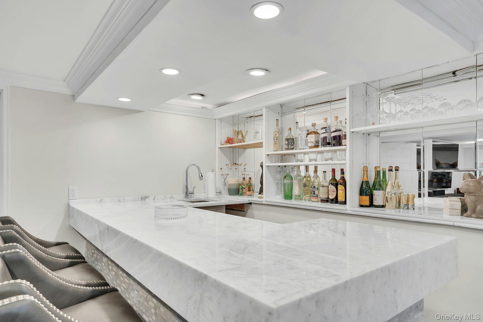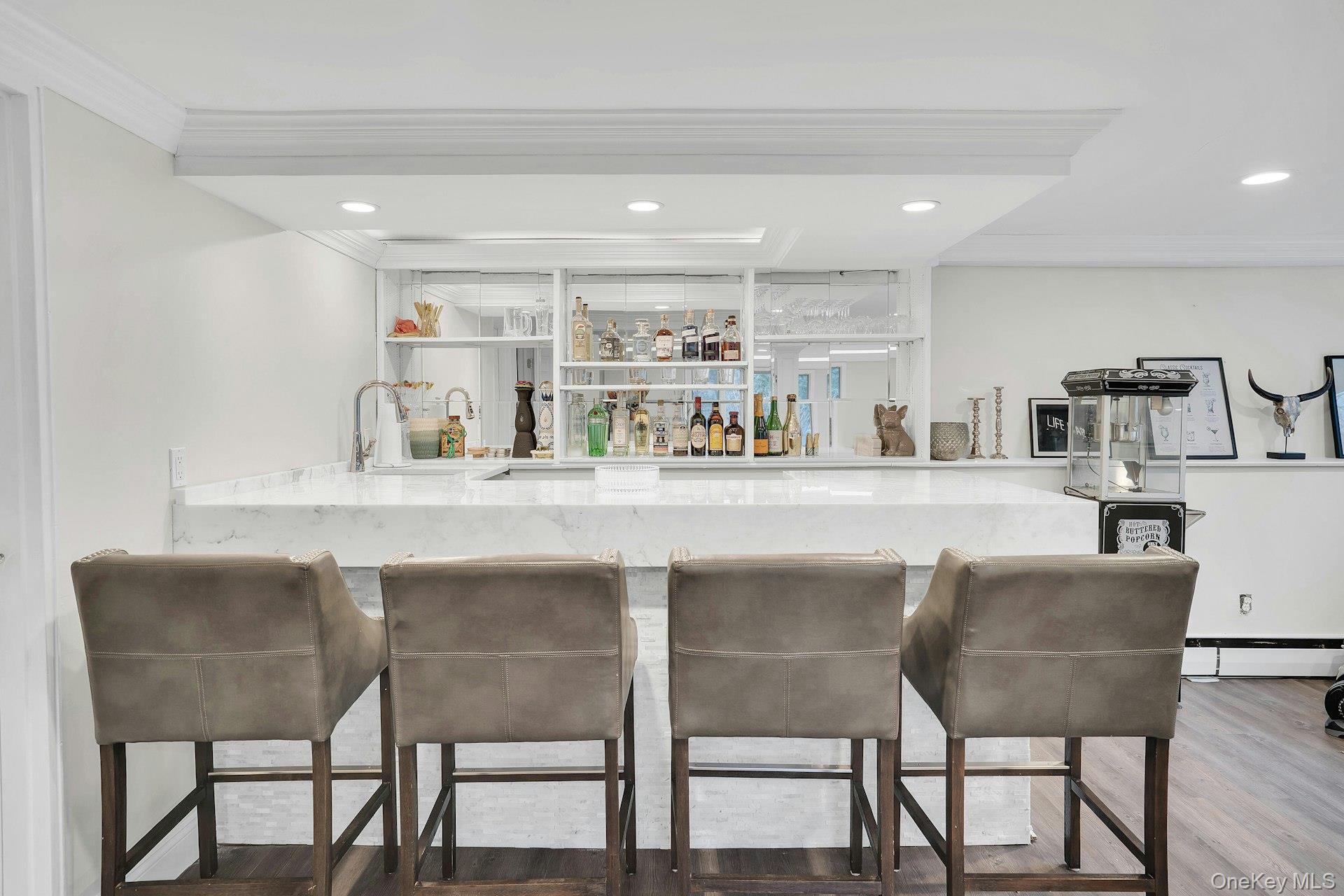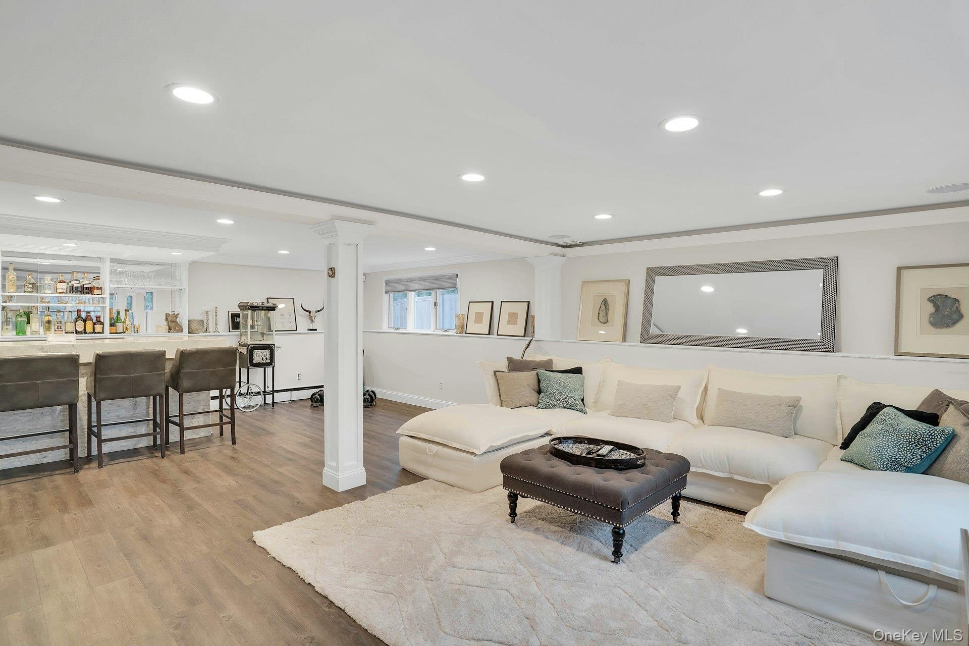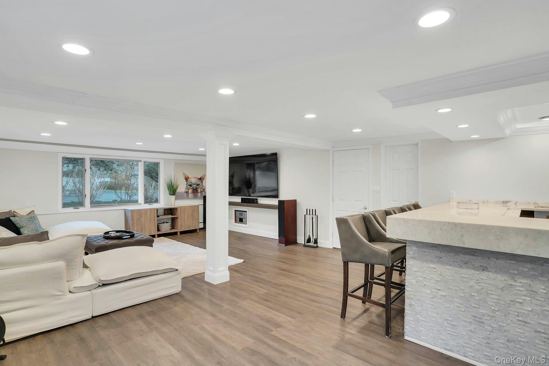 The lower level offers additional living space with vinyl flooring throughout, a bedroom, full bathroom, and a bar area, providing an ideal setup for entertaining or extended guests. The garage has been converted to further expand usable living space.