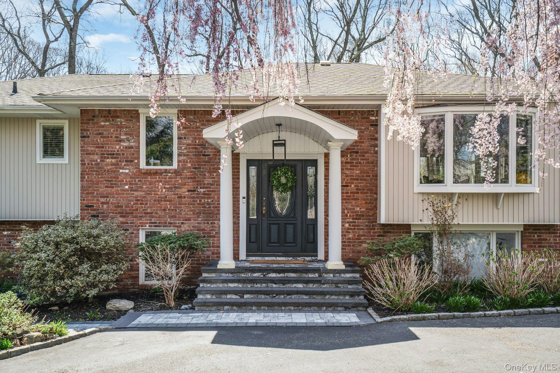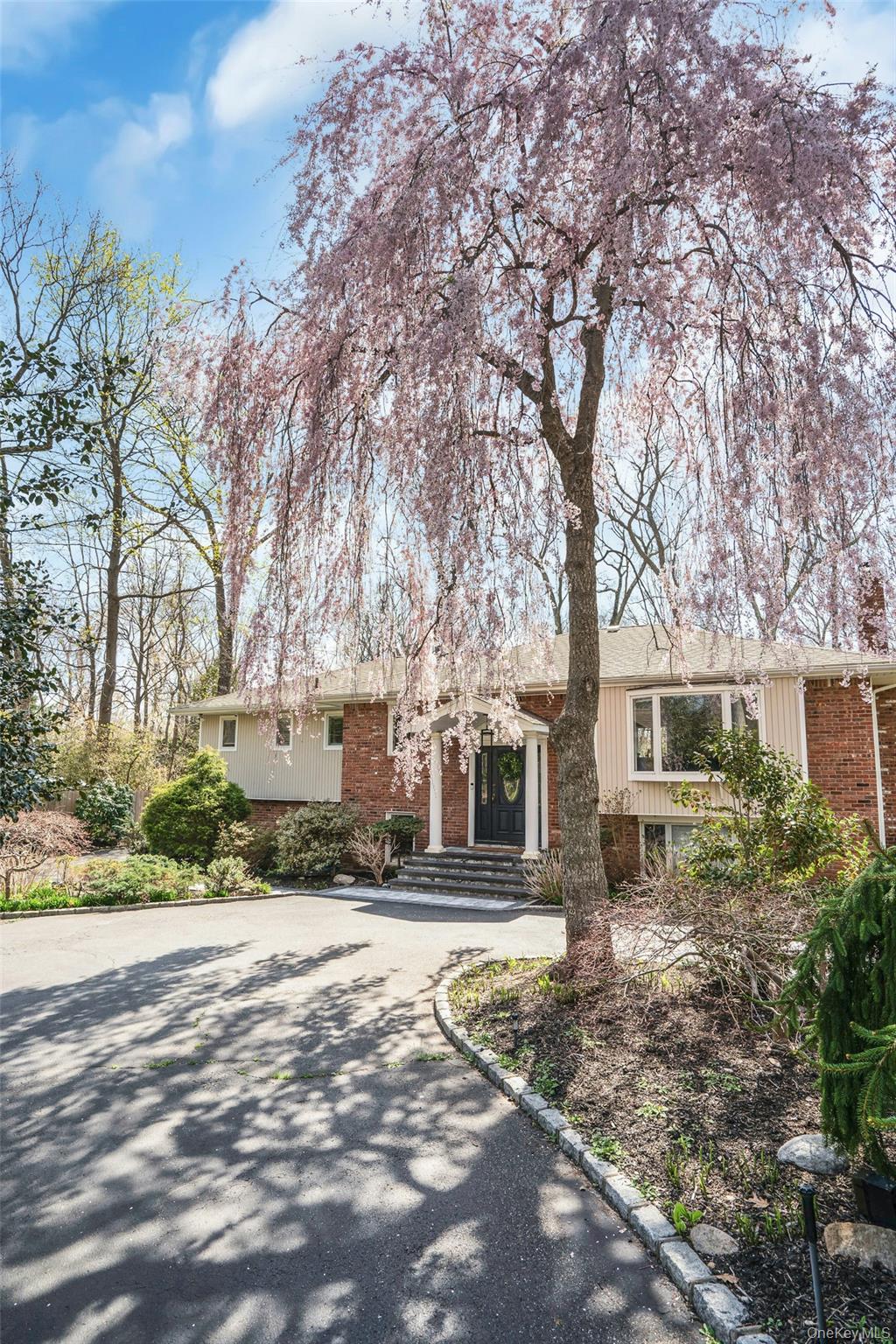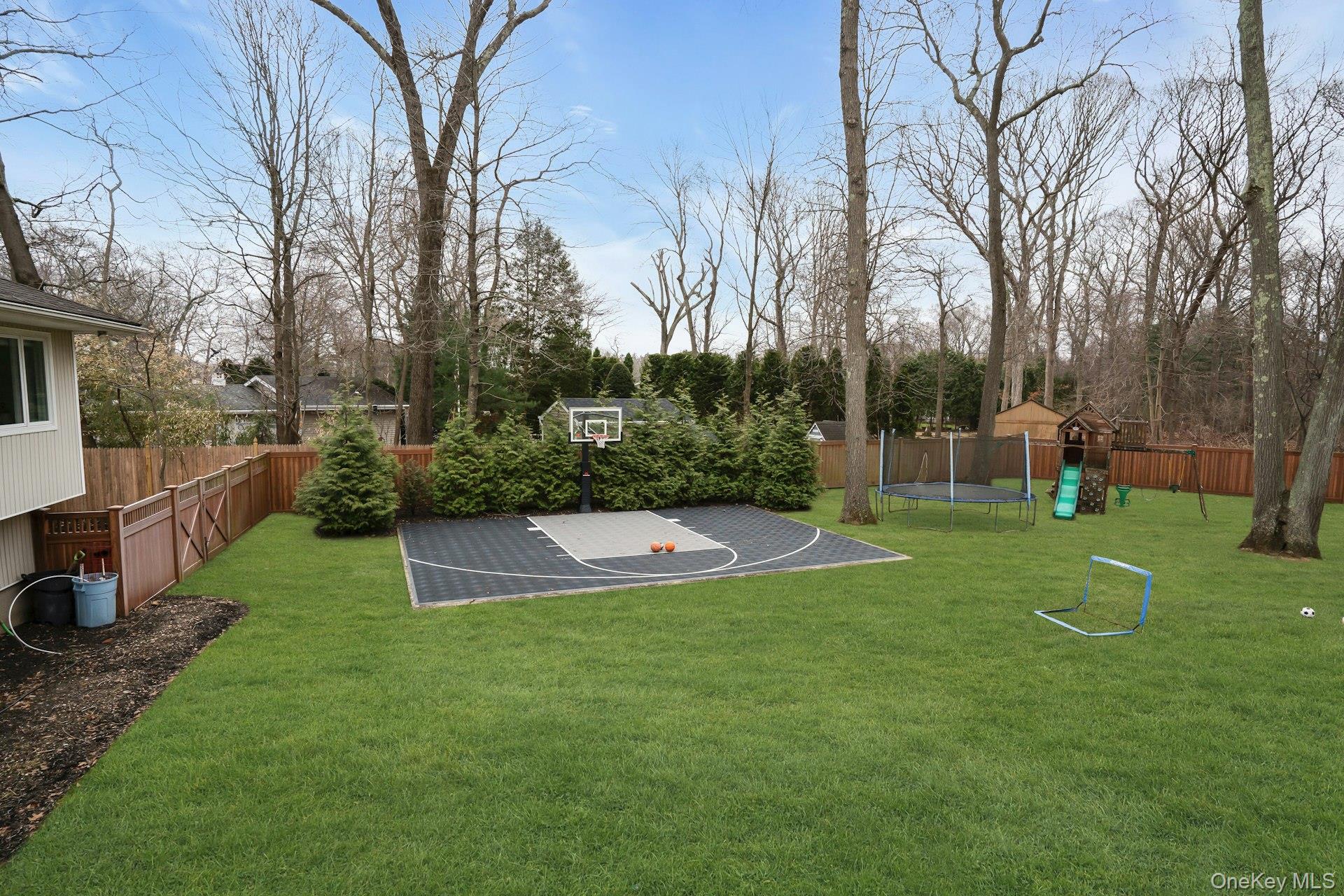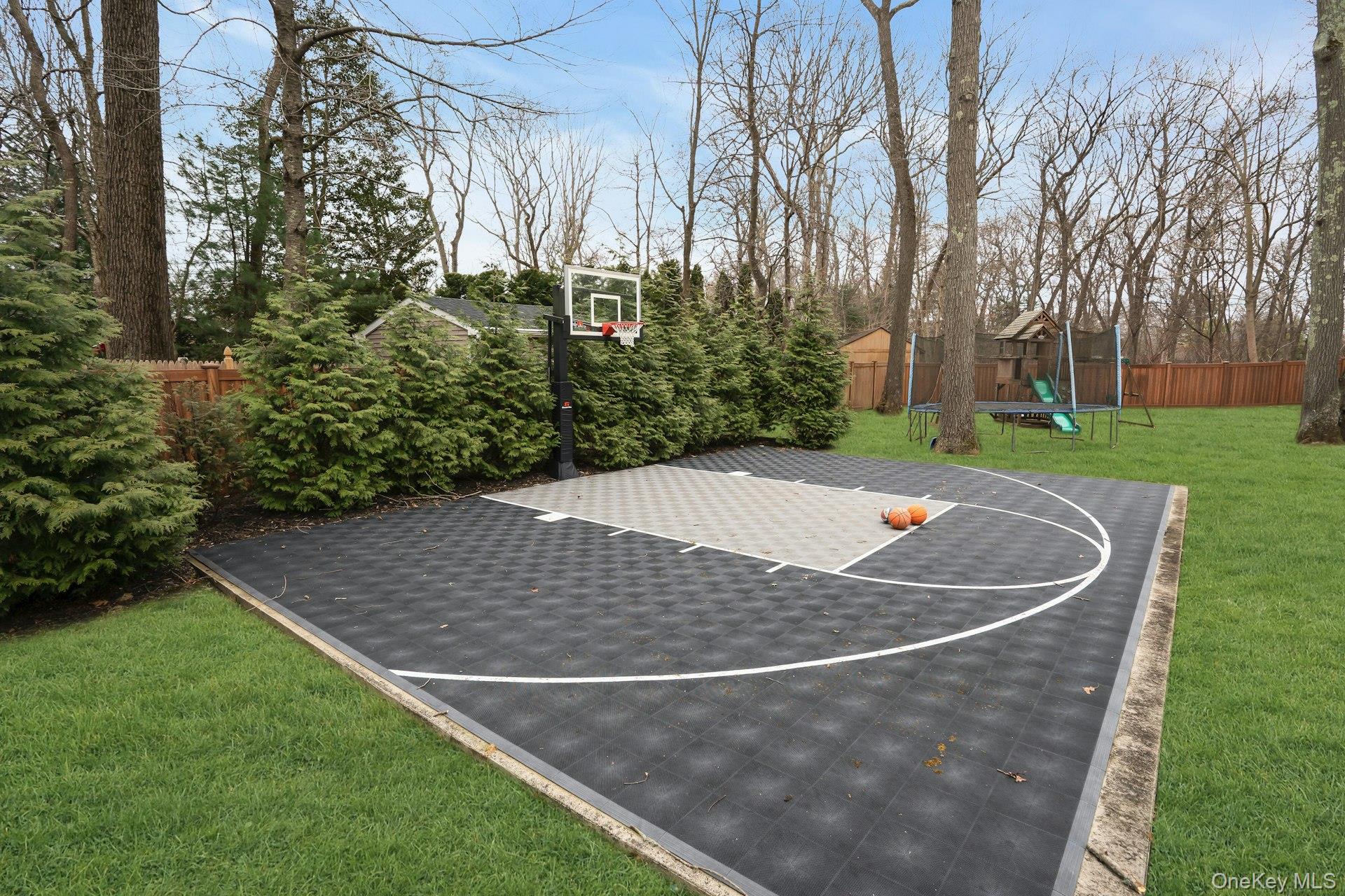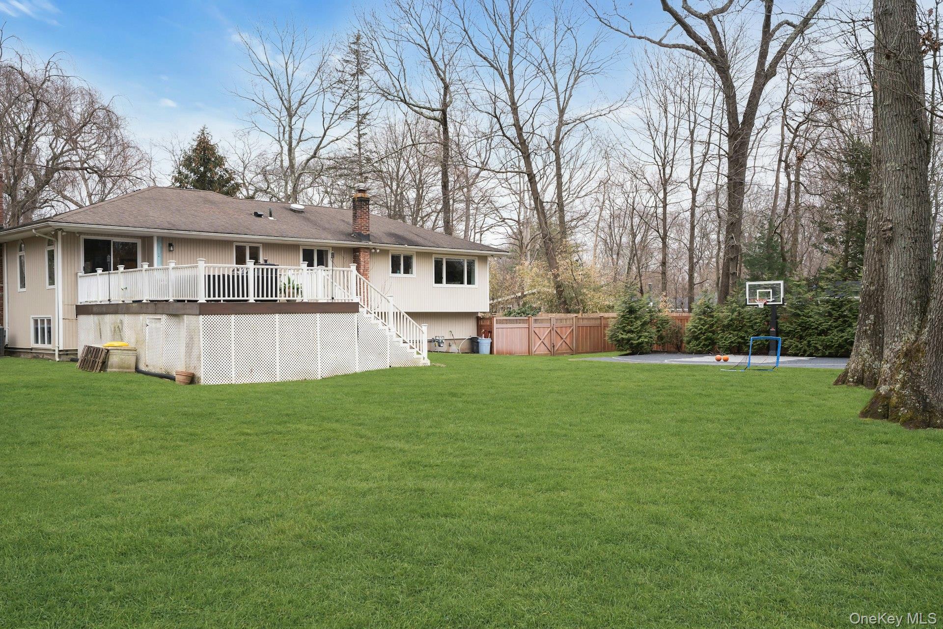 Exterior features include a welcoming front portico, a U-shaped driveway, and a rear deck overlooking the private backyard. The property also includes a basketball court and ample outdoor space for recreation.